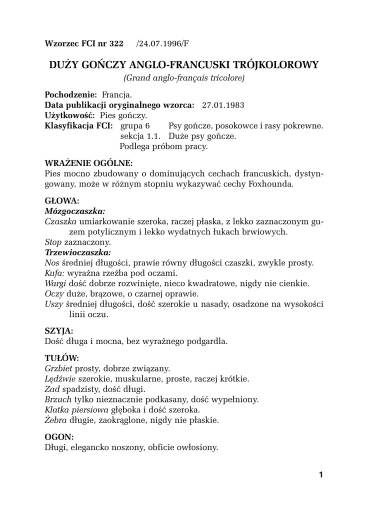 Wzorzec FCI nr 322 /24.07.1996/F DUŻY GOŃCZY ANGLO-FRANCUSKI TRÓJKOLOROWY (Grand anglo-français tricolore) Pochodzenie: Francja. Data publikacji oryginalnego wzorca: 27.01.1983 Użytkowość: Pies gończy. Klasyfikacja FCI: grupa 6 Psy gończe, posokowce i rasy pokrewne. sekcja 1.1. Duże psy gończe. Podlega próbom pracy. WRAŻENIE OGÓLNE: Pies mocno zbudowany o dominujących cechach francuskich, dystyngowany, może w różnym stopniu wykazywać cechy Foxhounda. GŁOWA: Mózgoczaszka: Czaszka umiarkowanie szeroka, raczej płaska, z lekko zaznaczonym guzem potylicznym i lekko wydatnych łukach brwiowych. Stop zaznaczony. Trzewioczaszka: Nos średniej długości, prawie równy długości czaszki, zwykle prosty. Kufa: wyraźna rzeźba pod oczami. Wargi dość dobrze rozwinięte, nieco kwadratowe, nigdy nie cienkie. Oczy duże, brązowe, o czarnej oprawie. Uszy średniej długości, dość szerokie u nasady, osadzone na wysokości linii oczu. SZYJA: Dość długa i mocna, bez wyraźnego podgardla. TUŁÓW: Grzbiet prosty, dobrze związany. Lędźwie szerokie, muskularne, proste, raczej krótkie. Zad spadzisty, dość długi. Brzuch tylko nieznacznie podkasany, dość wypełniony. Klatka piersiowa głęboka i dość szeroka. Żebra długie, zaokrąglone, nigdy nie płaskie. OGON: Długi, elegancko noszony, obficie owłosiony. 1 KOŃCZYNY: Kończyny przednie idealnie proste i mocne. Łopatki długie i płaskie. Łapy suche, raczej okrągłe. Kończyny tylne: Uda muskularne, długie, raczej grube. Stawy skokowe szerokie, lekko kątowane, śródstopia krótkie. RUCH: Swobodny, sprawia wrażenie siły. SKÓRA: Biała z czarnymi łatami. SZATA: Włos krótki, mniej lub bardziej mocny. Umaszczenie: tricolor, najczęściej z czarnym czaprakiem lub z mniej lub bardziej rozległymi łatami. Podpalanie intensywnie płowe lub miedziane bez czarnego nalotu. Dopuszczalne jest także umaszczenie wilczaste. Zbyt obfite cętkowanie nie jest pożądane. WYMIARY: Wysokość w kłębie od 60 do 70 cm. WADY: Wszelkie odstępstwa od powyższego wzorca powinny być traktowane jako wady i oceniane w zależności od stopnia ich nasilenia. Wady budowy mogące przeszkadzać w prawidłowej pracy na tropie. Przodozgryz lub tyłozgryz. Jasne oczy. Źle noszony ogon, zakrzywiony na bok lub zbyt zakręcony. Ślady depigmentacji. Blade podpalanie („sprane”). Umaszczenie inne niż opisane we wzorcu. UWAGA: Samce muszą mieć dwa, prawidłowo wykształcone jądra, całkowicie umieszczone w mosznie. 2