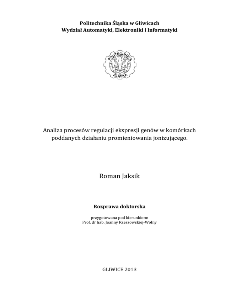 Politechnika Śląska w Gliwicach Wydział Automatyki, Elektroniki i Informatyki Analiza procesów regulacji ekspresji genów w komórkach poddanych działaniu promieniowania jonizującego. Roman Jaksik Rozprawa doktorska przygotowana pod kierunkiem: Prof. dr hab. Joanny Rzeszowskiej-Wolny GLIWICE 2013 Serdeczne podziękowania za zaangażowanie i pomoc udzieloną w trakcie pisania niniejszej pracy chciałbym złożyć Pani prof. Joannie Rzeszowskiej-Wolny. Dziękuję także Pani prof. Joannie Polańskiej, dr Jerzemu Jurce, dr inż. Annie Lalik, mgr Robertowi Herokowi, mgr inż. Michałowi Marczykowi, mgr. inż. Krzysztofowi Biernackiemu, mgr inż. Dorocie Hudy oraz wszystkim kolegom i koleżankom, których nieoceniona pomoc i dobroć serca przyczyniła się do napisania niniejszej pracy doktorskiej. Pragnę również podziękować Katarzynie Wuczyńskiej za ciągłe wsparcie duchowe w trakcie powstawania niniejszej pracy. Streszczenie Spis Treści 1 SPIS TREŚCI 1. STRESZCZENIE ............................................................................................................. 3 2. WPROWADZENIE ........................................................................................................ 5 2.1. MOTYWACJA PROWADZONYCH BADAO ............................................................................................................. 5 2.2. HIPOTEZA ................................................................................................................................................... 7 2.3. CELE PRACY ................................................................................................................................................. 7 2.4. SŁOWNIK SKRÓTÓW STOSOWANYCH W PRACY .................................................................................................... 8 3. PODŁOŻE BIOLOGICZNE ............................................................................................. 10 3.1. PRZEPŁYW INFORMACJI GENETYCZNEJ ............................................................................................................. 10 3.2. BUDOWA GENU.......................................................................................................................................... 11 3.3. REGULACJA EKSPRESJI GENÓW W KOMÓRKACH EUKARIOTYCZNYCH ....................................................................... 12 3.4. PODSTAWOWE CZYNNIKI ODPOWIEDZIALNE ZA REGULACJĘ EKSPRESJI GENÓW ......................................................... 14 3.4.1. Czynniki transkrypcyjne ................................................................................................................. 14 3.4.2. Białka typu RBP .............................................................................................................................. 15 3.4.3. Interferencja RNA .......................................................................................................................... 16 3.5. ZNACZENIE NIEKODUJĄCEGO OBSZARU KOOCA 3’ GENU ...................................................................................... 17 3.6. ROZKŁAD ELEMENTÓW REGULACYJNYCH W GENOMIE ......................................................................................... 18 3.7. WPŁYW PROMIENIOWANIA JONIZUJĄCEGO NA KOMÓRKĘ ................................................................................... 20 3.8. WIELKOSKALOWE METODY ANALIZY FUNKCJI GENÓW ......................................................................................... 21 3.9. MIKROMACIERZE OLIGONUKLEOTYDOWE......................................................................................................... 22 3.9.1. Typowe schematy eksperymentu mikromacierzowego ................................................................. 23 3.9.2. Budowa mikromacierzy ................................................................................................................. 24 3.9.3. Podstawy biologiczne eksperymentu mikromacierzowego ........................................................... 26 3.9.4. Metody kontroli jakości danych ..................................................................................................... 31 3.9.5. Metody wstępnego przetwarzania i problemy z nimi związane .................................................... 39 3.9.6. Metody poszukiwania genów różnicujących ................................................................................. 41 3.10. POSZUKIWANIE WZORCÓW W SEKWENCJACH NUKLEOTYDOWYCH..................................................................... 42 3.10.1. Metody i narzędzia do analizy sekwencji nukleotydowych............................................................ 43 3.10.2. Publiczne bazy danych sekwencji nukleotydowych........................................................................ 45 4. MATERIAŁY I METODY ............................................................................................... 47 4.1. ŹRÓDŁA DANYCH ........................................................................................................................................ 47 4.1.1. Dane mikromacierzowe – zbiór testowy ........................................................................................ 47 4.1.2. Dane mikromacierzowe – zbiór referencyjny ................................................................................. 48 4.1.3. Sekwencje nukleotydowe i dane adnotacyjne ............................................................................... 51 4.2. ANALIZA SEKWENCJI NUKLEOTYDOWYCH ......................................................................................................... 51 4.2.1. Analiza składu nukleotydowego .................................................................................................... 52 1 1 Streszczenie 4.2.2. Macierze wag pozycji ................................................................................