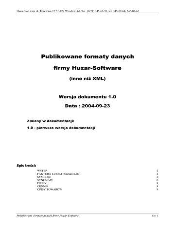 Niniejsza dokumentacja przedstawia publikowane formaty firmy Huzar-Software, inne niŜ format XML (opisany