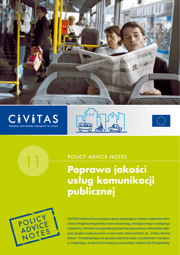 11 Policy AdviCE notes Poprawa jakości usług komunikacji publicznej CIVITAS Initiative to europejska akcja wspierająca miasta w zakresie wdrożenia zintegrowanej polityki zrównoważonego, ekologicznego i wydajnego transportu. Wnioski wyciągnięte podczas faz planowania, wdrożenia i realizacji działań podsumowano w dwunastu dokumentach pt. „Policy Advice Notes”. Przedstawiają one sposób radzenia sobie z problemami transportu miejskiego, przed którymi staną w przyszłości miasta Unii Europejskiej. P o l i c y A d v i c E N ot e s P o p r awa j a ko ś c i u s ł u g ko m u n i k a c j i p u b l i c z n e j Poprawa jakości usług komunikacji publicznej Zwiększenie atrakcyjności komunikacji publicznej dla obywateli stockxpert Informacje ogólne O P IS D ZIAŁA Ń Aby zwiększyć atrakcyjność usług komunikacji publicznej, a przez to zmniejszyć korzystanie z samochodów, miasta i przedsiębiorstwa komunikacji zbiorowej powinny dążyć do zapewnienia wysokiej jakości usług systemu transportu publicznego, między innymi poprzez wdrażanie następujących działań: 1. Poszerzenie i uproszczenie sieci komunikacji zbiorowej, np. przez: • nowy projekt układu sieci, • zwiększenie częstotliwości i wydłużenie godzin pracy, • wprowadzenie transportu na żądanie (tzw. demand-responsive transport (DRT)), czyli usługi komunikacji publicznej funkcjonującej wyłącznie na żądanie pasażerów (np. wzywanie autobusu przez telefon). W ramach inicjatywy CIVITAS II (2005– 2009) wdrożono określone działania, których celem były poprawa jakości i zwiększenie atrakcyjności systemu ko- 2. Modernizacja infrastruktury (zwłaszcza w intermodalnych węzłach przesiadkowych) i zwiększenie komfortu całej podróży komunikacją zbiorową, np. przez: • instalację wysokiej jakości obiektów na przystankach (ławki, wiaty, udogodnienia dodatkowe); • budowę bezpiecznych stojaków na rowery, obiektów „park and ride” czy wspólnego użytkowania samochodów itp.; munikacji publicznej. Najważniejsze informacje na temat wdrożenia tych działań oraz doświadczeń miast objętych inicjatywą podsumowano w niniejszym dokumencie pt. „Policy Advice Note”. Ma on stanowić pomoc i materiał informacyjny dla lokalnych polityków i innych decydentów zainteresowanych tymi działaniami. 2 P o l i c y A d v i c E N ot e s P o p r awa j a ko ś c i u s ł u g ko m u n i k a c j i p u b l i c z n e j O D D ZIAŁ Y WANIE I KORZ Y ŚCI • ułatwienie dostępu do stacji (np. ścieżki piesze i rowerowe, oznakowanie, modernizacja otoczenia); • modernizację taboru w celu dostosowania go do wymogów potencjalnych klientów przez zwiększenie dostępności; • poprawę szkolenia kierowców pod względem płynnej i wydajnej energetycznie jazdy. Po wdrożeniu powyższych działań służących zwiększeniu jakości usług komunikacji zbiorowej można spodziewać się następujących korzyści: Dla ogółu mieszkańców Poprzez wdrożenie opisanych działań komunikacja zbiorowa staje się wygodniejsza, łatwiej dostępna i bardziej zrozumiała dla wszystkich. Liczba pasażerów korzystających z transportu publicznego zwykle wzrasta; zmniejsza się poczucie wykluczenia osób niepełnosprawnych ze społeczności, a zależność mieszkańców od samochodów powinna się obniżyć, co z kolei skutkuje korzyściami dla środowiska naturalnego. 3. Zwiększenie dostępności dla wszystkich, zwłaszcza dla osób o szczególnych potrzebach, np. przez: • wdrożenie różnych narzędzi informacyjnych przystosowanych do potrzeb osób niepełnosprawnych (np. systemy pomocy wizualnej, komunikaty głosowe); • zapewnienie fizycznej dostępności przystanków i pojazdów (np. dla wózków dziecięcych, wózków inwalidzkich, balkoników ułatwiających chodzenie). Dla osób fizycznych Jakość życia osób o ograniczonej mobilności oraz niezależność osób pracujących lub mieszkających w obszarach niepołączonych wcześniej z siecią komunikacji zbiorowej może się podnieść. Tendencje demograficzne w Europie pokazują, że w nadchodzących latach liczba osób starszych będzie wzrastać. Zwiększenie dostępności komunikacji zbiorowej dla tej grupy mieszkańców jest jednym z najważniejszych wyzwań związanych z rozwojem społecznym miast europejskich. Także osoby, które zwykle nie korzystają z komunikacji zbiorowej ze względu na obawy o bezpieczeństwo, zyskają do niej więcej zaufania po wdrożeniu omawianych działań. 4. Poprawę bezpieczeństwa pasażerów i kierowców (a także wyposażenia) na stacjach, przystankach i w pojazdach, np. przez: • wdrożenie strategii bezpieczeństwa, np. instalację kamer na przystankach i w pojazdach; • stworzenie bezpieczniejszych warunków na stacjach i w ich okolicy (np. lepsze oświetlenie); • szkolenie w zakresie bezpieczeństwa, a także zwiększanie świadomości kierowców i pasażerów. GRU P Y D OCELOWE Dla podmiotów gospodarczych Jeśli przedsiębiorstwa komunikacji zbiorowej podniosą jakość swoich usług, możliwe będzie poprawienie wizerunku tego środka transportu i zwiększenie liczby pasażerów. Na przykład w uczestniczącym w inicjatywie CIVITAS II mieście Malmö (Szwecja) przeprojektowano dwie główne trasy autobusowe, co w ciągu pięciu miesięcy spowodowało wzrost liczby pasażerów o 20%. Zwiększenie dostępności w celu zwiększenia liczby pasażerów w pojazdach komunikacji zbiorowej nie musi wymagać dużych inwestycji. Poprzez poprawę bezpieczeństwa w pojazdach i na stacjach można obniżyć koszt naprawy zniszczeń spowodowanych przez wandali. Działania te są skierowane do obecnych i potencjalnych użytkowników komunikacji zbiorowej. W szczególności powinny z nich skorzystać osoby niepełnosprawne, starsze, rodziny z dziećmi i ludzie młodzi. Należy także wprowadzić działania związane z bezpieczeństwem w celu ochrony kierowców pojazdów komunikacji zbiorowej. 3 P o l i c y 