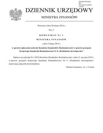 Grzegorz Dostatni; MF 2014.02.20 14:28:56 +01'00' Warszawa, dnia 20 lutego 2014 r. Poz. 5 K O M U N I K AT N r 1 MINISTRA FINANSÓW z dnia 5 lutego 2014 r. w sprawie ogłoszenia uchwały Komitetu Standardów Rachunkowości w sprawie przyjęcia Krajowego Standardu Rachunkowości Nr 8 „Działalność deweloperska” Ogłasza się uchwałę Nr 1/2014 Komitetu Standardów Rachunkowości z dnia 21 stycznia 2014 r. w sprawie przyjęcia Krajowego Standardu Rachunkowości Nr 8 „Działalność deweloperska”, stanowiącą załącznik do komunikatu. Minister Finansów: wz. J. Cichoń Dziennik Urzędowy Ministra Finansów –2– Poz. 5 Załącznik do komunikatu Nr 1 Ministra Finansów z dnia 5 lutego 2014 r. (poz. 5) U C H WA Ł A N r 1 / 2 0 1 4 K O M I T E T U S TA N D A R D Ó W R A C H U N K O W O Ś C I z dnia 21 stycznia 2014 r. w sprawie przyjęcia Krajowego Standardu Rachunkowości Nr 8 „Działalność deweloperska” Na podstawie § 2 pkt 1 rozporządzenia Ministra Finansów z dnia 28 listopada 2001r. w sprawie zakresu działania i sposobu organizacji Komitetu Standardów Rachunkowości (Dz. U. Nr 140, poz. 1580, z późn. zm.) oraz § 5 ust. 13 wewnętrznego regulaminu działania Komitetu Standardów Rachunkowości uchwala się, co następuje: § 1. 1. Komitet przyjmuje Krajowy Standard Rachunkowości Nr 8 „Działalność deweloperska”, stanowiący załącznik do niniejszej uchwały. 2. Standard, o którym mowa w ust. 1, wchodzi w życie z dniem ogłoszenia w Dzienniku Urzędowym Ministra Finansów i ma zastosowanie do sprawozdań finansowych sporządzonych za rok obrotowy rozpoczynający się w 2014 r. z możliwością jego wcześniejszego stosowania § 2. Uchwała wchodzi w życie z dniem podjęcia. Przewodnicząca Komitetu Standardów Rachunkowości Pani Joanna Dadacz Członek Komitetu Standardów Rachunkowości Ewa Adamiak Członek Komitetu Standardów Rachunkowości Beata Baluta Członek Komitetu Standardów Rachunkowości Grzegorz Barszcz Członek Komitetu Standardów Rachunkowości dr Teresa Cebrowska Członek Komitetu Standardów Rachunkowości dr Zdzisław Fedak Członek Komitetu Standardów Rachunkowości Grażyna Gielecińska Dziennik Urzędowy Ministra Finansów –3– Poz. 5 Członek Komitetu Standardów Rachunkowości prof. dr hab. Jerzy Gierusz Członek Komitetu Standardów Rachunkowości Tomasz Konieczny Członek Komitetu Standardów Rachunkowości dr Danuta Krzywda Członek Komitetu Standardów Rachunkowości prof. dr hab. Hanna Litwińczuk Członek Komitetu Standardów Rachunkowości dr Ernest Podgórski Członek Komitetu Standardów Rachunkowości Anna Sirocka Członek Komitetu Standardów Rachunkowości dr Renata Sochacka Członek Komitetu Standardów Rachunkowości prof. dr hab. Gertruda Świderska Dziennik Urzędowy Ministra Finansów –4– Poz. 5 Załącznik do uchwały Nr 1/2014 Komitetu Standardów Rachunkowości z dnia 21 stycznia 2014 r. Krajowy Standard Rachunkowości Nr 8 „Działalność deweloperska” Spis treści: I. Cel standardu II. Zakres standardu III. Definicje IV. Specyfika działalności deweloperskiej V. Dzielenie i łączenie przedsięwzięć deweloperskich VI. Klasyfikacja umów deweloperskich ze względu na charakter przedsięwzięcia deweloperskiego VII. Koszty przedsięwzięcia deweloperskiego VIII. Ustalanie przychodów ze sprzedaży i kosztów wytworzenia sprzedanego przedmiotu przedsięwzięcia deweloperskiego IX. Zakończenie przedsięwzięcia deweloperskiego X. Prezentacja i ujawnianie informacji XI. Rozwiązania techniczno-organizacyjne warunkujące stosowanie standardu XII. Przykłady Dziennik Urzędowy Ministra Finansów I. –5– Poz. 5 Cel standardu 1.1. Celem niniejszego Krajowego Standardu Rachunkowości (KSR), nazywanego dalej standardem, jest wyjaśnienie głównych zasad (polityki) rachunkowości stosowanych do działalności deweloperskiej, zgodnych z ustawą z dnia 29.09.1994 r. o rachunkowości, Dz. U. z 2013 r. poz.330, dalej ustawa, oraz postanowień innych KSR. II. Zakres standardu 2.1. Przedmiotem standardu są główne zasady ujmowania, wyceny i prezentacji aktywów, zobowiązań, przychodów i kosztów oraz wyniku finansowego działalności deweloperskiej, bez względu na formę prawną tej działalności, w tym także prowadzoną przez kontynuujące działalność spółki celowe, powołane na czas oznaczony do realizacji jednego lub kilku przedsięwzięć deweloperskich, np. do budowy osiedla mieszkaniowego. 2.2. Wyjaśnienia zawarte w standardzie są zgodne z postanowieniami ustawy oraz w podstawowym zakresie z odpowiednimi postanowieniami MSR/MSSF, w tym w szczególności z MSR 2 „Zapasy”, MSR 11 „Umowy o usługę budowlaną”, MSR 16 „Rzeczowe aktywa trwałe”, MSR 18 „Przychody”, MSR 23 „Koszty finansowania zewnętrznego”, MSR 40 „Nieruchomości inwestycyjne” oraz KIMSF 15 „Umowy dotyczące budowy nieruchomości”. Różnice pomiędzy standardem a MSR polegają na tym., że standard zawiera szczegółowy opis sposobu ujęcia i wyceny gruntu, na którym budowana jest przez dewelopera nieruchomość. MSR/MSSF tego zagadnienia nie reguluje. 2.3. W zakres standardu nie wchodzą zagadnienia stosowania przepisów podatkowych. 2.4. Standard nie obejmuje zagadnień dotyczących budowy nieruchomości na wynajem. 2.5. Zawarte w standardzie schematy księgowań i przykłady (rozdz. XII) nie stanowią jego integralnej części, jedynie służą wyjaśnieniom standardu. III. Definicje Stosowane w standardzie pojęcia oznaczają: 3.1. Przedsięwzięcie deweloperskie jest to przedsięwzięcie deweloperskie w rozumieniu ustawy z dnia 16 września 2011 r. o ochronie praw nabywcy lokalu mieszkalnego lub domu jednorodzinnego (Dz. U. Nr 232 poz. 1377) zwanej dalej ustawą o ochronie praw nabywcy, a także każdy inny proces (działanie), w wyniku realizacji którego na rzecz nabywcy (osoby fizycznej lub prawnej) lub nabywców ustanowiona lub przeniesiona zostaje odrębna własność lokalu mi