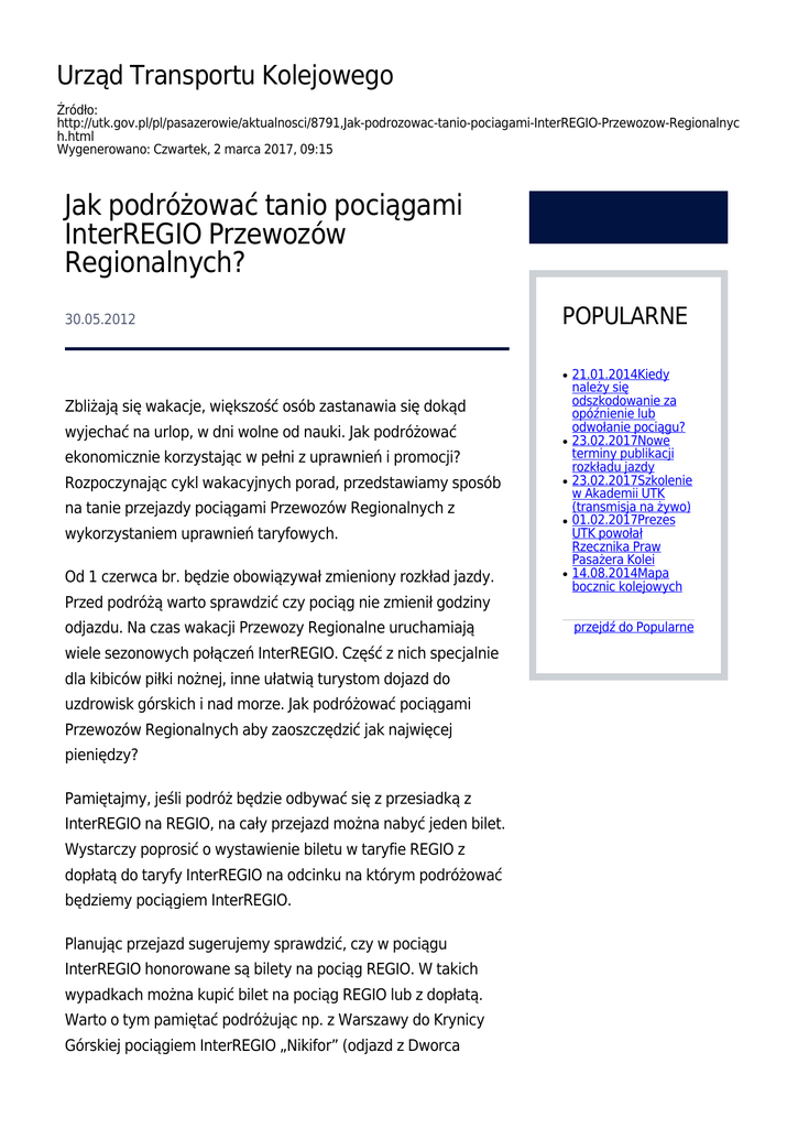 Urząd Transportu Kolejowego Źródło: http://utk.gov.pl/pl/pasazerowie/aktualnosci/8791,Jak-podrozowac-tanio-pociagami-InterREGIO-Przewozow-Regionalnyc h.html Wygenerowano: Czwartek, 2 marca 2017, 09:15 Jak podróżować tanio pociągami InterREGIO Przewozów Regionalnych? 30.05.2012 POPULARNE ● Zbliżają się wakacje, większość osób zastanawia się dokąd wyjechać na urlop, w dni wolne od nauki. Jak podróżować ● ekonomicznie korzystając w pełni z uprawnień i promocji? Rozpoczynając cykl wakacyjnych porad, przedstawiamy sposób ● na tanie przejazdy pociągami Przewozów Regionalnych z ● wykorzystaniem uprawnień taryfowych. Od 1 czerwca br. będzie obowiązywał zmieniony rozkład jazdy. Przed podróżą warto sprawdzić czy pociąg nie zmienił godziny odjazdu. Na czas wakacji Przewozy Regionalne uruchamiają wiele sezonowych połączeń InterREGIO. Część z nich specjalnie dla kibiców piłki nożnej, inne ułatwią turystom dojazd do uzdrowisk górskich i nad morze. Jak podróżować pociągami Przewozów Regionalnych aby zaoszczędzić jak najwięcej pieniędzy? Pamiętajmy, jeśli podróż będzie odbywać się z przesiadką z InterREGIO na REGIO, na cały przejazd można nabyć jeden bilet. Wystarczy poprosić o wystawienie biletu w taryfie REGIO z dopłatą do taryfy InterREGIO na odcinku na którym podróżować będziemy pociągiem InterREGIO. Planując przejazd sugerujemy sprawdzić, czy w pociągu InterREGIO honorowane są bilety na pociąg REGIO. W takich wypadkach można kupić bilet na pociąg REGIO lub z dopłatą. Warto o tym pamiętać podróżując np. z Warszawy do Krynicy Górskiej pociągiem InterREGIO „Nikifor” (odjazd z Dworca ● 21.01.2014Kiedy należy się odszkodowanie za opóźnienie lub odwołanie pociągu? 23.02.2017Nowe terminy publikacji rozkładu jazdy 23.02.2017Szkolenie w Akademii UTK (transmisja na żywo) 01.02.2017Prezes UTK powołał Rzecznika Praw Pasażera Kolei 14.08.2014Mapa bocznic kolejowych przejdź do Popularne Centralnego o godz. 6:50). Aby zaoszczędzić należy kupić bilet: REGIO na trasie Warszawa – Krynica z dopłatą do InterREGIO na odcinku Warszawa – Kraków Główny. Od Krakowa Głównego w pociągu „Nikifor” są honorowane bilety na pociągi REGIO, wraz z ofertą „Połączenie w dobrej cenie”. Podobnie należy kupować bilet na InterREGIO „Szczeliniec” z Białegostoku do Międzylesia. Na odcinku Wrocław - Międzylesie w pociągu honorowane są bilety REGIO. Wszystkim stałym czytelnikom „pasażera”, którzy zamierzają podróżować po 1 czerwca br., radzimy jak najszybciej kupić bilet na pociąg InterREGIO.