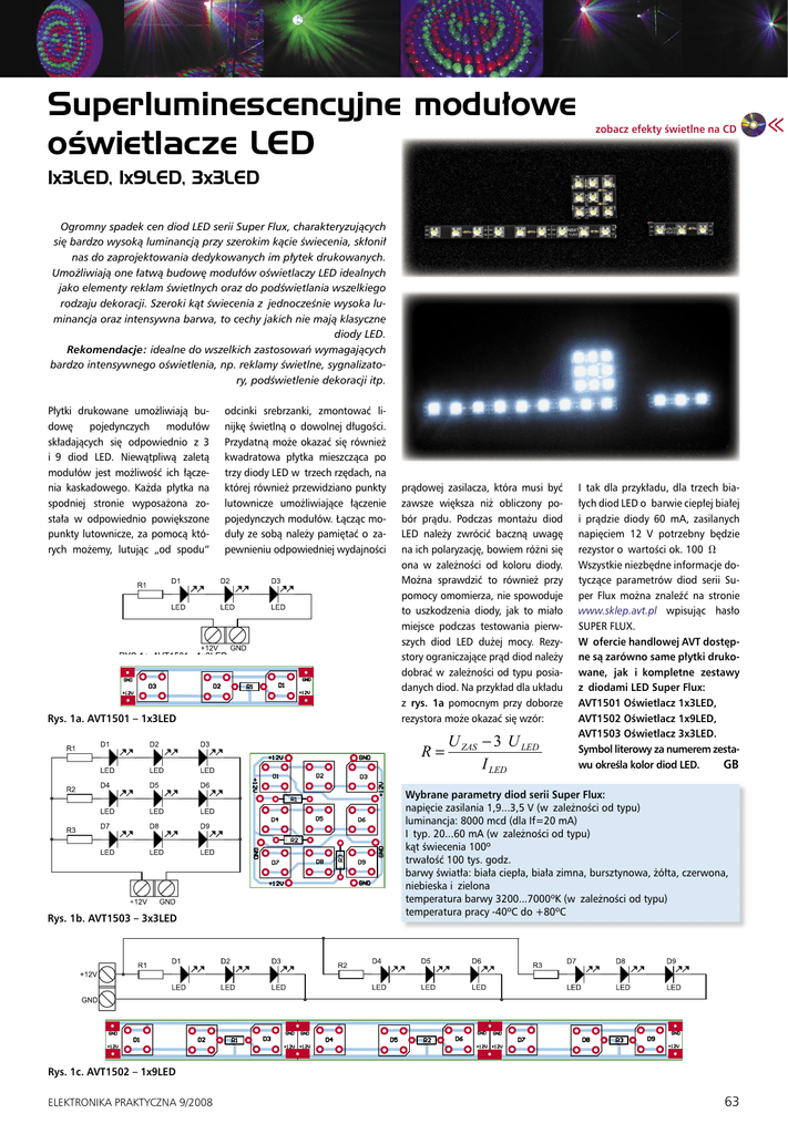 Superluminescencyjne modułowe oświetlacze LED zobacz efekty świetlne na CD 1x3LED, 1x9LED, 3x3LED Ogromny spadek cen diod LED serii Super Flux, charakteryzujących się bardzo wysoką luminancją przy szerokim kącie świecenia, skłonił nas do zaprojektowania dedykowanych im płytek drukowanych. Umożliwiają one łatwą budowę modułów oświetlaczy LED idealnych jako elementy reklam świetlnych oraz do podświetlania wszelkiego rodzaju dekoracji. Szeroki kąt świecenia z jednocześnie wysoka luminancja oraz intensywna barwa, to cechy jakich nie mają klasyczne diody LED. Rekomendacje: idealne do wszelkich zastosowań wymagających bardzo intensywnego oświetlenia, np. reklamy świetlne, sygnalizatory, podświetlenie dekoracji itp. Płytki drukowane umożliwiają budowę pojedynczych modułów składających się odpowiednio z 3 i 9 diod LED. Niewątpliwą zaletą modułów jest możliwość ich łączenia kaskadowego. Każda płytka na spodniej stronie wyposażona została w odpowiednio powiększone punkty lutownicze, za pomocą których możemy, lutując „od spodu“ Rys. 1a. AVT1501 – 1x3LED odcinki srebrzanki, zmontować linijkę świetlną o dowolnej długości. Przydatną może okazać się również kwadratowa płytka mieszcząca po trzy diody LED w trzech rzędach, na której również przewidziano punkty lutownicze umożliwiające łączenie pojedynczych modułów. Łącząc moduły ze sobą należy pamiętać o zapewnieniu odpowiedniej wydajności prądowej zasilacza, która musi być zawsze większa niż obliczony pobór prądu. Podczas montażu diod LED należy zwrócić baczną uwagę na ich polaryzację, bowiem różni się ona w zależności od koloru diody. Można sprawdzić to również przy pomocy omomierza, nie spowoduje to uszkodzenia diody, jak to miało miejsce podczas testowania pierwszych diod LED dużej mocy. Rezystory ograniczające prąd diod należy dobrać w zależności od typu posiadanych diod. Na przykład dla układu z rys. 1a pomocnym przy doborze rezystora może okazać się wzór: R= Rys. 1b. AVT1503 – 3x3LED U ZAS − 3 ⋅ U LED I LED I tak dla przykładu, dla trzech białych diod LED o barwie ciepłej białej i prądzie diody 60 mA, zasilanych napięciem 12 V potrzebny będzie rezystor o wartości ok. 100 V Wszystkie niezbędne informacje dotyczące parametrów diod serii Super Flux można znaleźć na stronie www.sklep.avt.pl wpisując hasło SUPER FLUX. W ofercie handlowej AVT dostępne są zarówno same płytki drukowane, jak i kompletne zestawy z diodami LED Super Flux: AVT1501 Oświetlacz 1x3LED, AVT1502 Oświetlacz 1x9LED, AVT1503 Oświetlacz 3x3LED. Symbol literowy za numerem zestawu określa kolor diod LED. GB Wybrane parametry diod serii Super Flux: napięcie Raa zasilania = 2 ⋅ Ra1,9...3,5 = 4 [kVΩ(w] zależności od typu) luminancja: 8000 mcd (dla If=20 mA) I typ. 20...60 mA (w zależności od typu) kąt świecenia 100º (U − U ) ∆U Q P trwałość [Ω ] R =100 tys.=godz. barwyi światła: biała ciepła, biała ∆I ( I Q − I P )zimna, bursztynowa, żółta, czerwona, niebieska i zielona temperatura barwy 3200...7000ºK (w zależności od typu) temperatura pracy -40ºC do +80ºC Lp = Ri ⋅ Raa ⋅ 2 ⋅π ⋅ fd [H ] Ri + Raa 108 ⋅ 0,8 ⋅ π ⋅ µ � ⋅ P ⋅ Raa V� = [cm3 ] 2 2 (2 ⋅ π ⋅ f d ) ⋅ L p ⋅ B Rys. 1c. AVT1502 – 1x9LED ELEKTRONIKA PRAKTYCZNA 9/2008 l � = 2 ⋅ (a + b) + 2 ⋅ π ⋅ c [cm] s � = 0,9 ⋅ V� [cm 2 ] l� 63