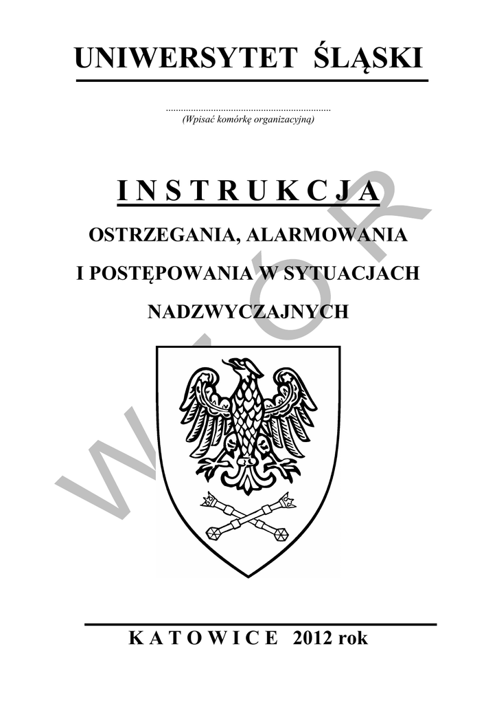 UNIWERSYTET ŚLĄSKI .................................................................. (Wpisać komórkę organizacyjną) INSTRUKCJA OSTRZEGANIA, ALARMOWANIA I POSTĘPOWANIA W SYTUACJACH NADZWYCZAJNYCH K A T O W I C E 2012 rok ................................................. (Miejscowość, data) Zatwierdzam i wprowadzam do użytku wewnętrznego „INSTRUKCJĘ OSTRZEGANIA, ALARMOWANIA I POSTĘPOWANIA W SYTUACJACH NADZWYCZAJNYCH”. Jednocześnie traci moc obowiązujące wydanie instrukcji z 2005 roku. DZIEKAN/DYREKTOR/KANCLERZ ............................................................ (imienna pieczęć i podpis) 2 SPIS TREŚCI Strona I. 1. 2. 3. 4. 1. 2. 1) 2) 3) 4) 5) 6) 3. III. 4 Alarmowanie, uprzedzanie, ostrzeganie. Rodzaje alarmów. Osoby upoważnione do zarządzenia i odwołania alarmów na terenie Uniwersytetu Śląskiego. Sposoby rozpowszechniania i odwoływania sygnałów alarmowych. OBOWIĄZKI PRACOWNIKA OCHRONY FIZYCZNEJ NA PORTIERNI W WYPADKU ZAISTNIENIA SYTUACJI NADZWYCZAJNYCH ......... II. IV. POSTANOWIENIA OGÓLNE .................................................................... 5 Do obowiązków pracownika ochrony fizycznej w obiekcie należy: Postępowanie pracownika ochrony fizycznej podczas wystąpienia zagrożeń w obiektach: pożar; włamanie; podtopienia i awarie; napad; zagrożenie bioterrorystyczne; otrzymanie informacji o podłożeniu materiału wybuchowego; Sposób realizacji zadań przez pracownika ochrony fizycznej podczas obchodów. SPOSÓB POSTĘPOWANIA PRACOWNIKA OCHRONY FIZYCZNEJ PO OTRZYMANIU SYGNAŁU ALARMOWEGO ..................................... 7 POSTANOWIENIA KOŃCOWE ............................................................ 8 ZAŁĄCZNIKI: Nr 1 - Sygnały alarmowe. Nr 2 - Wykaz telefonów alarmowych m. Katowice. Nr 3 - Modelowy schemat alarmowania. Nr 4 - Procedury postępowania po otrzymaniu zgłoszenia o zaistniałym zdarzeniu w godzinach pracy. Nr 5 - Procedury postępowania po otrzymaniu zgłoszenia o zaistnieniu zdarzenia po godzinach pracy. Nr 6 - Klasyfikacja zagrożeń. Nr 7 - Treść meldunku. Nr 8 - Instrukcja p.poż. Nr 9 - Instrukcja postępowania w przypadku włamania. Nr 10 - Instrukcja postępowania w przypadku podtopienia i awarii. Nr 11 - Instrukcja postępowania w przypadku napadu. Nr 12 - Instrukcja postępowania w przypadku zagrożenia bioterrorystycznego. Nr 13 - Instrukcja postępowania w przypadku groźby zdetonowania ładunku wybuchowego. Nr 14 - Wykaz osób upoważnionych przez Rektora do wzywania na teren Uczelni Policji oraz wyrażania zgody na jej wkroczenie. 3 I. 1. POSTANOWIENIA OGÓLNE ALARMOWANIE, UPRZEDZANIE, OSTRZEGANIE. 1) ALARMOWANIE - polega na natychmiastowym podaniu do ogólnej wiadomości ustalonego sygnału o grożącym bezpośrednio niebezpieczeństwie. 2) UPRZEDZANIE - informowanie ludności o potencjalnym zagrożeniu. Uprzedzanie stosuje się gdy przewidywany czas do zaistnienia niebezpieczeństwa jest dłuższy niż 30 minut. 3) OSTRZEGANIE - przekaz informacji o grożącym niebezpieczeństwie wyłącznie do ośrodków i instytucji decyzyjnych. 2. RODZAJE ALARMÓW: alarm powietrzny; alarm o skażeniach; uprzedzenie o zagrożeniu skażeniami; uprzedzenie o zagrożeniu zakażeniami; uprzedzenie o klęskach żywiołowych i zagrożeniu środowiska. 3. OSOBY UPOWAŻNIONE DO ZARZĄDZENIA I ODWOŁANIA ALARMÓW NA TERENIE UNIWERSYTETU ŚLĄSKIEGO: a) b) 4. REKTOR; z upoważnienia Rektora: komendant Formacji Obrony Cywilnej Uczelni; wyznaczone osoby funkcyjne. SPOSOBY ROZPOWSZECHNIANIA I ODWOŁYWANIA SYGNAŁÓW ALARMOWYCH: powiadamianie wzajemne (ustne przekazywanie sygnałów); powiadamianie telefoniczne (w sieciach centrali Uczelni lub miejskiej); .................................................................................................................. ; .................................................................................................................. . Do wykonywania czynności związanych z rozpowszechnianiem lub odwołaniem sygnałów alarmowych w obiektach Uniwersytetu Śląskiego zobowiązani są: w czasie codziennej działalności - pracownicy ochrony fizycznej poszczególnych obiektów pod nadzorem kierownika obiektu; w czasie sytuacji kryzysowych zadania te przejmą POSTERUNKI ALARMOWANIA (PAl). Sygnały alarmowe mogą być przekazywane przez Wydział Zarządzania Kryzysowego UM Katowice, Powiatowe Centrum Zarządzania Kryzysowego (PCZK) w Katowicach lub przez Zespół Kierowania OC Uczelni. Po odebraniu i zanotowaniu w brudnopisie sygnału oraz nadawcy (nazwisko, numer telefonu i czas otrzymania) pracownik ochrony fizycznej potwierdza telefonicznie u nadawcy treść, a następnie przystępuje do powiadamiania osób funkcyjnych ujętych w rozdziale III niniejszej instrukcji. 4 II. OBOWIĄZKI PRACOWNIKA OCHRONY FIZYCZNEJ NA PORTIERNI W WYPADKU ZAISTNIENIA SYTUACJI NADZWYCZAJNYCH DO OBOWIĄZKÓW PRACOWNIKA OCHRONY FIZYCZNEJ W OBIEKCIE NALEŻY: 1. 1) 2) 3) 4) 5) Znać rodzaje alarmów, komunikatów ostrzegawczych i sygnałów alarmowych (Załącznik nr 1). Umieć posługiwać się technicznymi środkami alarmowania, ostrzegania i łączności oraz znać miejsca ich rozmieszczenia w ochranianym obiekcie. Orientować się w spisie numerów telefonicznych kierownictwa, osób funkcyjnych oraz Komendanta Formacji Obrony Cywilnej Uniwersytetu Śląskiego w Katowicach. Znać numery telefonów służb ratowniczych i porządkowych (Policja, Straż Pożarna, Pogotowie Ratunkowe, itp. Załącznik nr 2). Znać instrukcje p.poż., ewakuacji oraz inne instrukcje i plany dotyczące rozmieszczenia głównych wyłączników energii elektrycznej, hydrantów, systemów alarmowych itp. oraz umieć się nimi posługiwać w razie zaciemniania obiektów. POSTĘPOWANIE PRACOWNIKA OCHRONY FIZYCZNEJ PODCZAS WYSTĄPIENIA ZAGROŻEŃ W OBIEKTACH: 2. 1) POŻAR: Wykonuje czynności określone w Instrukcji stanowiącej Załącznik nr 8. 2) WŁAMANIE: Wykonuje czynności określone w Instrukcji stanowią