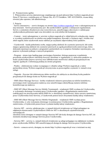 §1. Postanowienia ogólne 1. Właścicielem serwisu internetowego znajdującego się pod adresem http://wybierz-nagrode.pl jest firma IT Services z siedzibą przy ul. Pokoju 26e, 42-575 Gródków. NIP: 6252304926, zwana dalej, również jako operator, lub administracja. 2. Pojęcia: - Serwis internetowy – serwis dostępny na stronie http://wybierz-nagrode.pl wraz z udostępnionymi na niej treściami . Serwis przeznaczony jest dla użytkowników zgodnie z niniejszym regulaminem. Serwis z contentem obrazkowym oraz rozrywkowym, umożliwiający aktywnym w subskrypcji użytkownikom pobieranie tapet oraz dzwonków na swój telefon lub komputer. - Content - treści udostępnione w serwisie wybierz-nagrode.pl w skład których wchodzą min. tapety w wysokiej rozdzielczości na telefon oraz pulpit komputera, dzwonki w formacie mp3, wróżba oraz zbiór nagród, które użytkownik może odebrać po uzyskaniu odpowiedniej ilości punktów. - Użytkownik - każda pełnoletnia osoba, mająca pełną zdolność do czynności prawnych, lub osoba mająca ograniczoną zdolność do czynności prawnych za zgodą przedstawiciela ustawowego, która dokonała rejestracji na jednym z programów partnerskich czy to poprzez formularz rejestracyjny, czy poprzez wykonanie jednego z naszych programów. - Program - strona typu landing page zawierająca formularz, którego poprawne wypełnienie przydziela użytkownikowi określone korzyści określone w regulaminie, tj. doliczenie punktów na konto użytkownika [nazwa serwisu] oraz odblokowanie możliwości zdobycia przypisanych mu nagród, zgodnych z informacją podaną na stronie programu. - Punkty - elektroniczna waluta występująca w obrębie usługi Wybierz-nagrode.pl, a także partnerskiej strony Wybierz-nagrode.pl otrzymywana za poszczególne czynności w ramach owej usługi. - Nagroda - fizyczne lub elektroniczne dobro możliwe do zdobycia za określoną liczbę punktów przypisanych do danego konta na Wybierz-nagrode.pl - SMS (Short Message Service) - krótka wiadomość tekstowa przesyłana na telefon komórkowy, zawierająca treść wpisaną przez nadawcę oraz umożliwiająca identyfikację numeru telefonu komórkowego jej nadawcy. - SMS MT (Short Message Service Mobile Terminated) - wiadomość SMS wysłana do Użytkownika, w wykonaniu złożonego wcześniej przez Użytkownika zgodnie z Regulaminem zamówienia (subskrypcji) na otrzymywanie takich SMS-ów w określonej częstotliwości, która zawiera zamówioną przez Użytkownika treść Serwisu, a Użytkownik ponosi koszt otrzymania każdej takiej wiadomości. - SMS MO (Short Message Service Mobile Originated) – wiadomość SMS wysłana przez Użytkownika, w celu wykonania złożonego wcześniej przez Użytkownika zgodnie z Regulaminem zamówienia, a Użytkownik ponosi koszt wysłania każdej takiej wiadomości. - Serwisy MT – serwisy subskrypcyjne, w ramach których świadczone są Usługi polegające na odpłatnym dostarczaniu Użytkownikowi SMS-ów MT w określonych częstotliwościach, zawierających określone treści dostępne w ramach danego Serwisu MT lub kody dostępu do danego Serwisu MT, do momentu dezaktywacji danego Serwisu przez Użytkownika. - Serwisy MO – serwisy w, ramach których świadczone są usługi polegające na odpłatnym wysłaniu przez użytkownika SMSów MO umożliwiających dostęp do danego Serwisu przez Użytkownika. - Serwis - oznacza serwis, dostępny na stronie http://wybierz-nagrode.pl wraz z treściami na niej udostępnionymi. Serwis jest przeznaczony do korzystania przez użytkowników zgodnie z niniejszym regulaminem - Serwisy MT/MO – serwisy łączące właściwości Serwisów MT i Serwisów MO. 3. Do korzystania z serwisu wymagany jest komputer lub inne analogiczne urządzenie, wyposażone w przeglądarkę internetową z włączoną akceptacją plików cookies, oraz interpretującą kod Java Script. Wszystkie programy wykorzystują HTML 5 niezgodność posiadanej przeglądarki może doprowadzić do nieprawidłowego działania programu. 4. Każdy Użytkownik swoją rejestracją wyraża zgodę na przetwarzanie jego danych osobowych Administratorem danych jest operator – firma IT Services 5. Firma IT Services zastrzega sobie prawo do dowolnych zmian w niniejszym regulaminie. §2. Korzystanie z serwisu http://wybierz-nagrode.pl 1.Poprzez zarejestrowanie się w serwisie www.wybierz-nagrode.pl użytkownik akceptuje postanowienia niniejszego regulaminu oraz wyraża zgodę na otrzymywanie informacji o serwisie drogą elektroniczną na podany mail i numer telefonu oraz użytkownik wyraża zgodę na otrzymywanie informacji o nowościach a także treści reklamowych na maila i numer telefonu podanego podczas rozwiązywania testu. Użytkownik ma prawo w każdym czasie odwołać zgodę na otrzymywanie powyższych informacji poprzez zgłoszenie tego faktu administratorowi na adres mail [email protected] 2. Korzystanie z serwisu http://wybierz-nagrode.pl jest dobrowolne. W każdym momencie można usunąć swoje dane wraz z kontem. W tym celu należy napisać maila na adres: [email protected] , w którym należy podać adres email, który został wpisany przy rejestracji. Konto może zostać usunięte w każdym momencie. Usunięcie konta jest nieodwracalne tzn. użytkownik traci możliwość ponownego uzyskania dostępu do konta, a także ilość utraconych punktów. Czas usunięcia konta od zgłoszenia nie będzie większy niż 14 dni kalendarzowych. 3. Użytkownik, który zdobył punkty biorąc udział w jednym z naszych programów akceptuje świadomość, że punkty mają wartość wirtualną i nie mogą zostać wymienione na walutę. Zdobyte punkty użytkownik może tylko i wyłącznie wymienić na nagrody dostępne w serwisie http:// wybierznagrode.pl o ile użytkownik posiada odpowiednią ilość punktów. 4. Użytkownik poprzez aktywację konta w serwisie http://wybierz-nagrode.pl otrzymuje dostęp do pobrania dzwonków i tapet na telefon lub pulpit kompute
