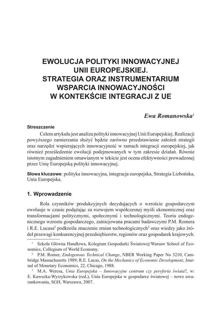 EWOLUCJA POLITYKI INNOWACYJNEJ UNII EUROPEJSKIEJ. STRATEGIA ORAZ INSTRUMENTARIUM WSPARCIA INNOWACYJNOŚCI W KONTEKŚCIE INTEGRACJI Z UE Ewa Romanowska1 Streszczenie Celem artykułu jest analiza polityki innowacyjnej Unii Europejskiej. Realizacji powyższego zamierzania służyć będzie zarówno przedstawienie założeń strategii oraz narzędzi wspierających innowacyjność w ramach integracji europejskiej, jak również prześledzenie ewolucji podejmowanych w tym zakresie działań. Równie istotnym zagadnieniem omawianym w tekście jest ocena efektywności prowadzonej przez Unię Europejską polityki innowacyjnej. Słowa kluczowe: polityka innowacyjna, integracja europejska, Strategia Lizbońska, Unia Europejska. 1.Wprowadzenie Rola czynników produkcyjnych decydujących o wzroście gospodarczym ewoluuje w czasie podążając za rozwojem współczesnej myśli ekonomicznej oraz transformacjami politycznymi, społecznymi i technologicznymi. Teoria endogenicznego wzrostu gospodarczego, zainicjowana pracami badawczymi P.M. Romera i R.E. Lucasa2 podkreśla znaczenie zmian technologicznych3 oraz wiedzy jako źródeł przewagi konkurencyjnej przedsiębiorstw, regionów oraz gospodarek krajowych. 1 Szkoła Główna Handlowa, Kolegium Gospodarki Światowej/Warsaw School of Economics, Collegium of World Economy. 2 P.M. Romer, Endogenous Technical Change, NBER Working Paper No 3210, Cambridge Massachusetts 1989; R.E. Lucas, On the Mechanics of Economic Development, Journal of Monetary Economics, 22, Chicago, 1988. 3 M.A. Weresa, Unia Europejska – Innowacyjne centrum czy peryferia świata?, w: E. Kawecka-Wyrzykowska (red.), Unia Europejska w gospodarce światowej – nowe uwarunkowania, SGH, Warszawa, 2007. 6 Ewa Romanowska Z teorią wzrostu endogenicznego wiąże się koncepcja gospodarki opartej na wiedzy – GOW (knowledge-based economy KBE), w której według B.A. Lundvalla wiedza i uczenie się stanowią kluczowe czynniki produkcji4. Gospodarka wiedzy została zdefiniowana m.in. przez Bank Światowy jako gospodarka, w której wiedza jest skutecznie przyswajana, kreowana, przekazywana i wykorzystywana m.in. do produkcji towarów i usług w celu przyspieszania rozwoju gospodarczego5. Tworzenie gospodarki napędzanej wiedzą polega na wspieraniu i ułatwianiu funkcjonowania podmiotów, których działalność opiera się na wiedzy. Rozwój społeczeństwa wiedzy6 jako nowego modelu społecznego determinowany jest w tym ujęciu działalnością innowacyjną, sektorem przedsiębiorstw wysoko technologicznych, postępem naukowym oraz kreatywnym kapitałem ludzkim. Społeczeństwo wiedzy – twórca GOW bazuje na współpracujących ze sobą i klientami w sieci organizacjach, które realizują procesy innowacyjne i badawcze, po to, by ich rezultaty wcielić w życie, a pozycję konkurencyjną na rynku ustawicznie poprawiać przy uwzględnianiu oczekiwań odbiorców.7 Rosnąca rola innowacyjności w kreowaniu konkurencyjności zarówno firm (w tym małych i średnich), jak również całych gospodarek znajduje naukowe uzasadnienie w teorii ekonomii, m.in. w pracach badawczych R.M. Solowa i K.J. Arrowa8. Co więcej, P. Drucker podkreśla, że innowacyjność, przedsiębiorczość oraz zdolność do konkurowania stanowią o sile społeczeństwa oraz całej gospodarki9. Badania i rozwój oraz innowacje wymagają jednakże zarówno znaczących nakładów finansowych, jak również instrumentów wsparcia prawno-instytucjonalnego. Konieczność podnoszenia innowacyjności dzięki zastosowaniu pomocy publicznej podkreślano już w latach 90. XX wieku, m.in. przez W.M. Cohena B.A. Lundvall, National Systems of Innovation, London, 1992. Bank Światowy, Korea as a Knowledge Economy. Evolutionary Process and Lessons Learned. Overview, 2006. 6 Implikacje M. Kleibera dotyczące społeczeństwa wiedzy znajdują się m.in. w Społeczeństwo wiedzy w Polsce?, [w:] Rola polskiej nauki we wzroście innowacyjności gospodarki, red. E. Okoń-Horodyńska, PTE, Warszawa, 2004. W znaczeniu potocznym M. Kleiber postrzega społeczeństwo wiedzy jako ”wspólną zdolność do budowania dzisiaj przesłanek służących jutro do tworzenia nowych produktów i usług, których wczoraj nawet sobie nie wyobrażaliśmy, a które pojutrze mogą okazać się zupełnie przestarzałe”, za D. Burawski, Budowa gospodarki opartej na wiedzy w nowych krajach Unii Europejskiej, Studenckie Prace Prawnicze Administratywistyczne i Ekonomiczne, red. M. Winiarski, 2008. 7 M. Dolińska, Współpraca organizacji uczących się w procesie innowacji na rynku UE [w:] Wspólna Europa. Zrównoważony rozwój przedsiębiorstwa a relacje z interesariuszami, SGP Warszawa 2005, s. 79. 8 R.M. Solow, Technical change and the aggregate production function, Review of Economics and Statistics, The Mit Press, 1957; K.J. Arrow, Economic welfare and the allocation of resources for invention, [w:] The Rate and Direction of Inventive Activity, R.R. Nelson (red.), Economic and Social Factors, Princeton, 1962. 9 P. Drucker, Innowacja i przedsiębiorczość. Praktyka i zasady, PWE, Warszawa, 1992. 4 5 Ewolucja polityki innowacyjnej Unii Europejskiej... 7 i D.A. Levinthala10. Ponadto, jak wskazują badania dotyczące innowatorów nakłady publiczne powinny stanowić wsparcie firm posiadających ograniczone możliwości finansowe oraz niewielką zdolność podejmowania ryzyka. Podmiotami gospodarczymi najlepiej spełniającymi powyższe kryteria jest sektor małych i średnich przedsiębiorstw, w szczególności nowo utworzonych, o czym przekonują B. Hall i J. Lerner11. Współczesne rozważania dotyczące innowacji nie są prowadzone jedynie na płaszczyźnie przedsiębiorczości, lecz również w odniesieniu do regionów, gospodarek narodowych oraz wspólnot międzynarodowych. Istotne wydaje się w tym miejscu wyjaśnienie pojęć: innowacyjność gospodarki oraz innowacyjność regionu. M.A. Weresa postrzega innowacyjność gospodarki jako rodzaj potencjału zdo