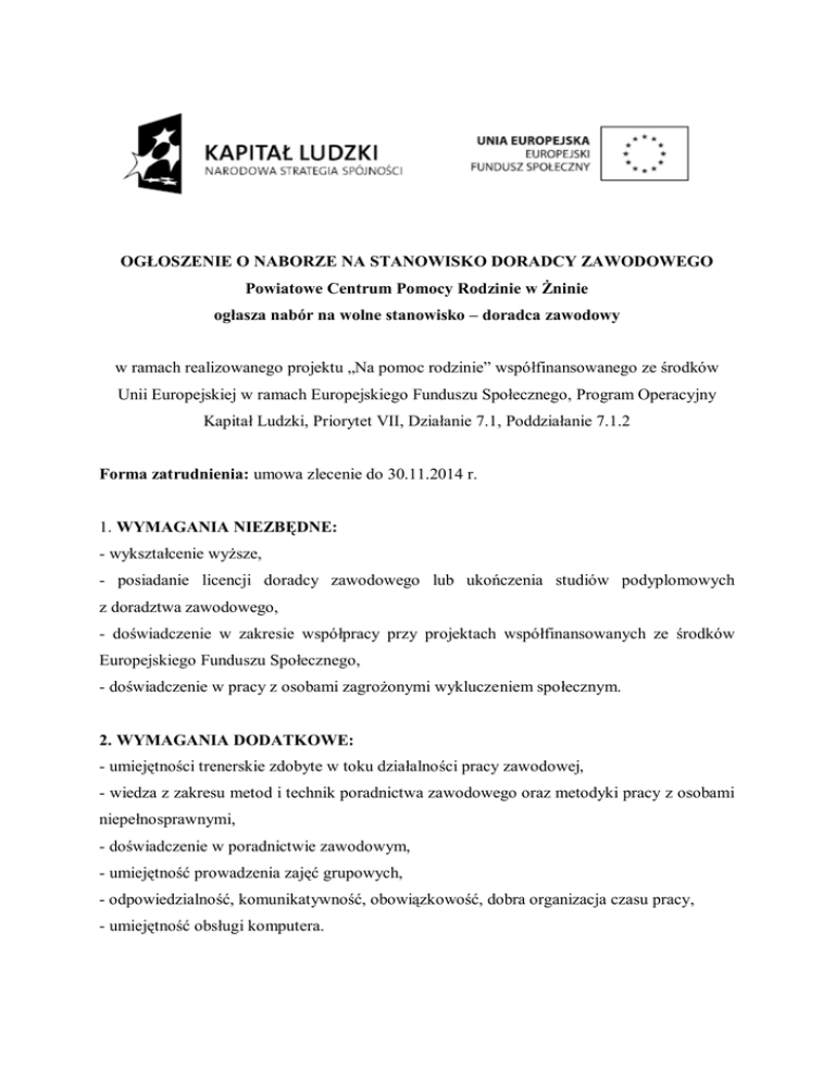 OGŁOSZENIE O NABORZE NA STANOWISKO DORADCY ZAWODOWEGO Powiatowe Centrum Pomocy Rodzinie w Żninie ogłasza nabór na wolne stanowisko – doradca zawodowy w ramach realizowanego projektu „Na pomoc rodzinie” współfinansowanego ze środków Unii Europejskiej w ramach Europejskiego Funduszu Społecznego, Program Operacyjny Kapitał Ludzki, Priorytet VII, Działanie 7.1, Poddziałanie 7.1.2 Forma zatrudnienia: umowa zlecenie do 30.11.2014 r. 1. WYMAGANIA NIEZBĘDNE: - wykształcenie wyższe, - posiadanie licencji doradcy zawodowego lub ukończenia studiów podyplomowych z doradztwa zawodowego, - doświadczenie w zakresie współpracy przy projektach współfinansowanych ze środków Europejskiego Funduszu Społecznego, - doświadczenie w pracy z osobami zagrożonymi wykluczeniem społecznym. 2. WYMAGANIA DODATKOWE: - umiejętności trenerskie zdobyte w toku działalności pracy zawodowej, - wiedza z zakresu metod i technik poradnictwa zawodowego oraz metodyki pracy z osobami niepełnosprawnymi, - doświadczenie w poradnictwie zawodowym, - umiejętność prowadzenia zajęć grupowych, - odpowiedzialność, komunikatywność, obowiązkowość, dobra organizacja czasu pracy, - umiejętność obsługi komputera. 3. ZAKRES WYKONYWANYCH ZADAŃ: - udzielenie niezbędnych informacji na temat rynku pracy, możliwości zdobycia bądź podniesienia kwalifikacji zawodowych, metod poszukiwania pracy, umiejętności sporządzania dokumentów aplikacyjnych, prowadzenia rozmowy kwalifikacyjnej, - grupowe i indywidualne poradnictwo zawodowe mające na celu podniesienie kompetencji i umiejętności zawodowych uczestników/czek projektu, - indywidualne poradnictwo zawodowe w celu zdiagnozowania potencjału i predyspozycji zawodowych uczestników/czek projektu, - przeprowadzenie indywidualnej diagnozy i utworzenie indywidualnych planów w zakresie zastosowania instrumentów aktywnej integracji, - prowadzenie odpowiedniej dokumentacji. - sporządzanie sprawozdań z przeprowadzonych działań projektowych. 4. WYMAGANE DOKUMENTY: CV, list motywacyjny, dokumenty potwierdzające wykształcenie (dyplomy ukończenia studiów, świadectwa ukończenia szkół), dokumenty potwierdzające kwalifikacje zawodowe, wymagane do wykonywania oferowanej pracy (ukończone szkolenia, kursy, certyfikaty) lub ich odpisy, oświadczenie o wyrażeniu zgody na przetwarzanie danych osobowych na potrzeby związane z ogłoszonym naborem. Wymagane dokumenty aplikacyjne można złożyć osobiście w siedzibie Powiatowego Centrum Pomocy Rodzinie w Żninie, lub przesłać na adres: Powiatowe Centrum Pomocy Rodzinie ul. Szpitalna 32 88 – 400 Żnin z dopiskiem „Nabór na stanowisko pracy – Doradca zawodowy” do dnia 14.02.2014r. do godz. 12.00 Wymagane dokumenty aplikacyjne: list motywacyjny, szczegółowe CV (z uwzględnieniem dokładnego przebiegu kariery zawodowej), powinny być opatrzone klauzulą: „Wyrażam zgodę na przetwarzanie moich danych osobowych zawartych w ofercie pracy dla potrzeb niezbędnych do realizacji procesu rekrutacji zgodnie z ustawą z dnia 29 sierpnia 1997r. o ochronie danych osobowych (Dz. U. Nr 133, poz. 883 z późn. zm.) oraz ustawą z dnia 21 listopada 2008r. o pracownikach samorządowych (Dz. U. z 2008r. Nr 223, poz. 1458)”, oraz własnoręcznym podpisem. Aplikacje które wpłyną po terminie nie będą rozpatrywane. Informacja o wynikach naboru zostanie umieszczona na stronie internetowej Powiatowego Centrum Pomocy Rodzinie w Żninie www.pcpr.znin.pl Dodatkowe informacje można uzyskać pod nr tel. (0-52) 30 30 169 Osoba do kontaktu: Koordynator projektu - Kamila Jankowska Projekt współfinansowany ze środków Unii Europejskiej w ramach Europejskiego Funduszu Społecznego.
