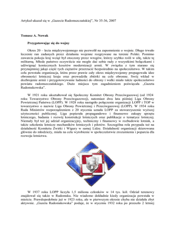 Artykuł ukazał się w „Gazecie Radomszczańskiej”, Nr 35-36, 2007 Tomasz A. Nowak Przygotowując się do wojny Okres 20 – lecia międzywojennego nie pozwolił na zapomnienie o wojnie. Długo trwało leczenie ran zadanych przez działania wojenne rozgrywane na terenie Polski. Pomimo zawarcia pokoju kraj wciąż był otoczony przez wrogów, którzy szybko rośli w siłę, także tę militarną. Młode państwo oczywiście nie mogło dać sobie rady z wszystkimi bolączkami i udźwignąć koniecznych kosztów modernizacji armii. W związku z tym starano się przynajmniej jakąś część tych ciężarów przerzucić bezpośrednio na społeczeństwo. W takim celu powstała organizacja, która przez prawie cały okres międzywojenny propagowała idee obronności lotniczej kraju oraz prowadziła zbiórki na cele obronne. Swój wkład w dozbrojenie armii i przygotowywanie ludności do obrony i walki miało także społeczeństwo powiatu radomszczańskiego. Dużo miejsca tym zagadnieniom poświęcała „Gazeta Radomskowska”. W 1921 roku ukształtował się Społeczny Komitet Obrony Przeciwgazowej (od 1924 roku Towarzystwo Obrony Przeciwgazowej), natomiast dwa lata później Liga Obrony Powietrznej Państwa (LOPP). W 1928 roku nastąpiło połączenie organizacji LOPP i TOP w towarzystwo o nazwie Liga Obrony Powietrznej i Przeciwgazowej (LOPP). W 1934 roku Rada Ministrów rozporządzeniem z 20 stycznia uznała LOPP za stowarzyszenie wyższej użyteczności publicznej. Liga popierała propagandowo i finansowo zakupy sprzętu lotniczego, badania i rozwój konstrukcji lotniczych oraz publikacje o tematyce lotniczej. Niemały był też jej udział organizacyjny, techniczny i finansowy w rozbudowie lotnisk, a także szkoleniu lotnicze mechaników lotniczych i pilotów. Szczególna rola przypada też na działalność Komitetu Żwirki i Wigury w samej Lidze. Działalność organizacji skierowana głównie do młodzieży, miała na celu wyrobienie w społeczeństwie zrozumienia i poparcia dla rozwoju lotnictwa. W 1937 roku LOPP liczyła 1,5 miliona członków w 14 tys. kół. Odział terenowy znajdował się także w Radomsku. Nie wiadomo dokładnie kiedy organizacja powstała w mieście. Prawdopodobnie już w 1923 roku, ale w pierwszym okresie chyba nie działała zbyt aktywnie. „Gazeta Radomskowska” podaje, że w styczniu 1932 roku po przeszło 2 letniej przerwie ukonstytuowało się Koło LOPP. W skład Zarządu weszli: kpt. Klimkowicz (prezes), starszy przodownik J. Grabarczyk (sekretarz) i referent starostwa Żelanowski (skarbnik). Biuro znajdywało się w budynku Państwowej Komisji Uzupełnień przy ul. Narutowicza 7 (1 piętro). Od 15 grudnia 1938 roku siedziba mieściła się przy ul. Reymonta 15. Następny skład władz znamy dopiero z 1935 roku. W dniu 17 marca w sali sejmiku powiatowego przy ul. Kościuszki 7 odbyło się o godzinie 11 Walne Zgromadzenie Delegatów obwodu powiatowego LOPP. W marcu na pierwszym powyborczym posiedzeniu ukonstytuował się Zarząd. Prezesem został naczelnik Kozłowski, wiceprezesem sędzia Michałek, skarbnikiem Lucjan Kwaśniewski, sekretarzem Józef Żymirski. Członkami mjr Wyczółkowski, Żelanowski, prof. Przyłubski, Kwiatkowski i Kierzkowski. Działalność radomszczańskiego LOPP skupiała się przede wszystkim na ciągłej akcji propagandowej. Stąd też bardzo często można spotkać na łamach „Gazety Radomskowskiej” swoiste reklamy tej organizacji. W 1928 roku umieszczono na dole strony dużym drukiem Zapisujcie się na członków Ligi Obrony Powietrznej Państwa czy podobne Zapisujcie się na członków LOPP (1934 rok). Trafimy też na duży artykuł wzywający do pomocy (1932 rok) informujący, że […] nasi wrogowie nie należą do ludzi kulturalnych i nie będą w razie wybuchu zawieruchy wojennej przestrzegać moralnych zasad walki […]. Dalej zachęcano obywateli do wstępowania w te szeregi, wpisowe to tylko 1 zł a miesięczna składka 50 gr. Jedną z najwcześniejszych akcji miejscowego oddziału był pomysł budowy w Radomsku lotniska wojskowego. W początku maja 1927 roku odbyło się w niebieskiej sali konferencyjnej Urzędu Wojewódzkiego zebranie przedstawicieli LOPP za całego województwa. Tam przedstawiciele komitetów powiatowych złożyli z sprawozdania działalności. Podjęto też uchwały, że na terenie województwa powstanie sieć lotnisk, w tym także w Radomsku. W sprawie budowy radomszczańskiego lotniska przyjeżdżali do miasta członkowie Komisji Wojewódzkiej z ramienia wojskowości i LOPP. Lotnisko miało być usytuowane na terenie Kowalowca. Na czele Komisji stał mec. Stanisław Pawłowski – wiceprezes wojewódzkiego komitetu LOPP, Tadeusz Woźnicki – komendant parku lotniczego w Łodzi i Z. Churzelewski – referent propagandowy LOPP w Łodzi. Wraz z miejscowym zarządem LOPP: burmistrzem M. Niewiadomskim, inż. B. Kistelowskim, J. Kosińskim zbadali dokładnie teren Kowalowca i zaakceptowali tę lokalizację. W tym celu LOPP miała wystąpić z wnioskiem do Rady Ministrów o wydzierżawienie na 40 lat terenów o powierzchni 400 x 600 m pod budowę stacji lotniczej. W razie przychylnej decyzji, w co nie wątpiono, przeprowadzone miały być w tym jeszcze roku prace niwelacyjne, a w roku następnym miał już powstać hangar na 4 samoloty, mieszkania dla lotników i dom noclegowy. W zabiegach tych konkurencją był dla Radomska Piotrków, ale władze wojskowe za lepszą lokalizację uznały Kowalowiec. We wrześniu 1927 roku informowano, że niedługo ruszą wreszcie prace przy budowie lotniska i zapowiadano, że już wkrótce Radomsko stanie się potężną stacją lotniczą. W tym samym miesiącu i roku pisano o tygodniu LOPP. Informowano, że jeden samolot ratuje życie 120 ludzi, czyli naszych ojców i synów. Do powstania lotniska jednak nie doszło. W późniejszym czasie powzięto plany wykorzystywania do celów wojskowych polowego lotniska w Strzałkowie. Ale w czasie wojny obronne