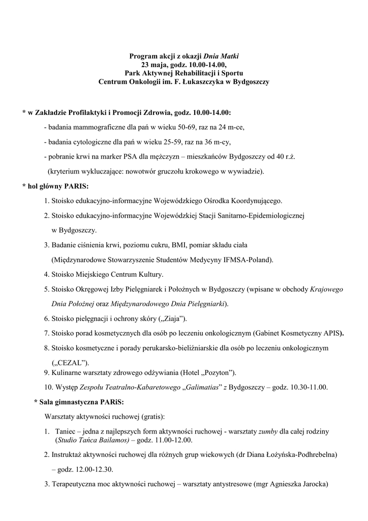 Program akcji z okazji Dnia Matki 23 maja, godz. 10.00-14.00, Park Aktywnej Rehabilitacji i Sportu Centrum Onkologii im. F. Łukaszczyka w Bydgoszczy * w Zakładzie Profilaktyki i Promocji Zdrowia, godz. 10.00-14.00: - badania mammograficzne dla pań w wieku 50-69, raz na 24 m-ce, - badania cytologiczne dla pań w wieku 25-59, raz na 36 m-cy, - pobranie krwi na marker PSA dla mężczyzn – mieszkańców Bydgoszczy od 40 r.ż. (kryterium wykluczające: nowotwór gruczołu krokowego w wywiadzie). * hol główny PARIS: 1. Stoisko edukacyjno-informacyjne Wojewódzkiego Ośrodka Koordynującego. 2. Stoisko edukacyjno-informacyjne Wojewódzkiej Stacji Sanitarno-Epidemiologicznej w Bydgoszczy. 3. Badanie ciśnienia krwi, poziomu cukru, BMI, pomiar składu ciała (Międzynarodowe Stowarzyszenie Studentów Medycyny IFMSA-Poland). 4. Stoisko Miejskiego Centrum Kultury. 5. Stoisko Okręgowej Izby Pielęgniarek i Położnych w Bydgoszczy (wpisane w obchody Krajowego Dnia Położnej oraz Międzynarodowego Dnia Pielęgniarki). 6. Stoisko pielęgnacji i ochrony skóry („Ziaja”). 7. Stoisko porad kosmetycznych dla osób po leczeniu onkologicznym (Gabinet Kosmetyczny APIS). 8. Stoisko kosmetyczne i porady perukarsko-bieliźniarskie dla osób po leczeniu onkologicznym („CEZAL”). 9. Kulinarne warsztaty zdrowego odżywiania (Hotel „Pozyton”). 10. Występ Zespołu Teatralno-Kabaretowego „Galimatias” z Bydgoszczy – godz. 10.30-11.00. * Sala gimnastyczna PARiS: Warsztaty aktywności ruchowej (gratis): 1. Taniec – jedna z najlepszych form aktywności ruchowej - warsztaty zumby dla całej rodziny (Studio Tańca Bailamos) – godz. 11.00-12.00. 2. Instruktaż aktywności ruchowej dla różnych grup wiekowych (dr Diana Łożyńska-Podhrebelna) – godz. 12.00-12.30. 3. Terapeutyczna moc aktywności ruchowej – warsztaty antystresowe (mgr Agnieszka Jarocka) – godz. 12.30-13.00. * Pozostała infrastruktura PARiS: - wejście na basen (gratis), - wejście do groty solnej (gratis). Patronat honorowy – TV Bydgoszcz „Populacyjny program wczesnego wykrywania raka piersi / Populacyjny program profilaktyki i wczesnego wykrywania raka szyjki macicy finansowany ze środków ministra zdrowia w ramach Narodowego programu zwalczania chorób nowotworowych”