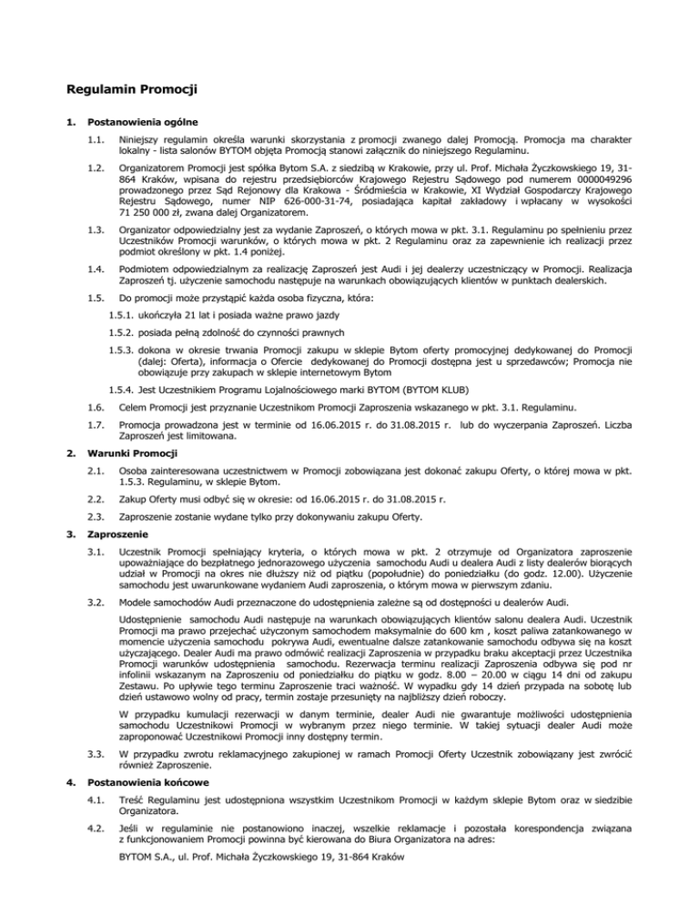Regulamin Promocji 1. Postanowienia ogólne 1.1. Niniejszy regulamin określa warunki skorzystania z promocji zwanego dalej Promocją. Promocja ma charakter lokalny - lista salonów BYTOM objęta Promocją stanowi załącznik do niniejszego Regulaminu. 1.2. Organizatorem Promocji jest spółka Bytom S.A. z siedzibą w Krakowie, przy ul. Prof. Michała Życzkowskiego 19, 31864 Kraków, wpisana do rejestru przedsiębiorców Krajowego Rejestru Sądowego pod numerem 0000049296 prowadzonego przez Sąd Rejonowy dla Krakowa - Śródmieścia w Krakowie, XI Wydział Gospodarczy Krajowego Rejestru Sądowego, numer NIP 626-000-31-74, posiadająca kapitał zakładowy i wpłacany w wysokości 71 250 000 zł, zwana dalej Organizatorem. 1.3. Organizator odpowiedzialny jest za wydanie Zaproszeń, o których mowa w pkt. 3.1. Regulaminu po spełnieniu przez Uczestników Promocji warunków, o których mowa w pkt. 2 Regulaminu oraz za zapewnienie ich realizacji przez podmiot określony w pkt. 1.4 poniżej. 1.4. Podmiotem odpowiedzialnym za realizację Zaproszeń jest Audi i jej dealerzy uczestniczący w Promocji. Realizacja Zaproszeń tj. użyczenie samochodu następuje na warunkach obowiązujących klientów w punktach dealerskich. 1.5. Do promocji może przystąpić każda osoba fizyczna, która: 1.5.1. ukończyła 21 lat i posiada ważne prawo jazdy 1.5.2. posiada pełną zdolność do czynności prawnych 1.5.3. dokona w okresie trwania Promocji zakupu w sklepie Bytom oferty promocyjnej dedykowanej do Promocji (dalej: Oferta), informacja o Ofercie dedykowanej do Promocji dostępna jest u sprzedawców; Promocja nie obowiązuje przy zakupach w sklepie internetowym Bytom 1.5.4. Jest Uczestnikiem Programu Lojalnościowego marki BYTOM (BYTOM KLUB) 2. 3. 1.6. Celem Promocji jest przyznanie Uczestnikom Promocji Zaproszenia wskazanego w pkt. 3.1. Regulaminu. 1.7. Promocja prowadzona jest w terminie od 16.06.2015 r. do 31.08.2015 r. lub do wyczerpania Zaproszeń. Liczba Zaproszeń jest limitowana. Warunki Promocji 2.1. Osoba zainteresowana uczestnictwem w Promocji zobowiązana jest dokonać zakupu Oferty, o której mowa w pkt. 1.5.3. Regulaminu, w sklepie Bytom. 2.2. Zakup Oferty musi odbyć się w okresie: od 16.06.2015 r. do 31.08.2015 r. 2.3. Zaproszenie zostanie wydane tylko przy dokonywaniu zakupu Oferty. Zaproszenie 3.1. Uczestnik Promocji spełniający kryteria, o których mowa w pkt. 2 otrzymuje od Organizatora zaproszenie upoważniające do bezpłatnego jednorazowego użyczenia samochodu Audi u dealera Audi z listy dealerów biorących udział w Promocji na okres nie dłuższy niż od piątku (popołudnie) do poniedziałku (do godz. 12.00). Użyczenie samochodu jest uwarunkowane wydaniem Audi zaproszenia, o którym mowa w pierwszym zdaniu. 3.2. Modele samochodów Audi przeznaczone do udostępnienia zależne są od dostępności u dealerów Audi. Udostępnienie samochodu Audi następuje na warunkach obowiązujących klientów salonu dealera Audi. Uczestnik Promocji ma prawo przejechać użyczonym samochodem maksymalnie do 600 km , koszt paliwa zatankowanego w momencie użyczenia samochodu pokrywa Audi, ewentualne dalsze zatankowanie samochodu odbywa się na koszt użyczającego. Dealer Audi ma prawo odmówić realizacji Zaproszenia w przypadku braku akceptacji przez Uczestnika Promocji warunków udostępnienia samochodu. Rezerwacja terminu realizacji Zaproszenia odbywa się pod nr infolinii wskazanym na Zaproszeniu od poniedziałku do piątku w godz. 8.00 – 20.00 w ciągu 14 dni od zakupu Zestawu. Po upływie tego terminu Zaproszenie traci ważność. W wypadku gdy 14 dzień przypada na sobotę lub dzień ustawowo wolny od pracy, termin zostaje przesunięty na najbliższy dzień roboczy. W przypadku kumulacji rezerwacji w danym terminie, dealer Audi nie gwarantuje możliwości udostępnienia samochodu Uczestnikowi Promocji w wybranym przez niego terminie. W takiej sytuacji dealer Audi może zaproponować Uczestnikowi Promocji inny dostępny termin. 3.3. 4. W przypadku zwrotu reklamacyjnego zakupionej w ramach Promocji Oferty Uczestnik zobowiązany jest zwrócić również Zaproszenie. Postanowienia końcowe 4.1. Treść Regulaminu jest udostępniona wszystkim Uczestnikom Promocji w każdym sklepie Bytom oraz w siedzibie Organizatora. 4.2. Jeśli w regulaminie nie postanowiono inaczej, wszelkie reklamacje i pozostała korespondencja związana z funkcjonowaniem Promocji powinna być kierowana do Biura Organizatora na adres: BYTOM S.A., ul. Prof. Michała Życzkowskiego 19, 31-864 Kraków 4.3. Wszelki kontakt w sprawie realizacji Zaproszeń, reklamacje i pozostała korespondencja z tym związana powinna być kierowana na adres dealera Audi wskazanego w Zaproszeniu. Załącznik do regulaminu. Lista salonów BYTOM objęta Promocją: C.H. Magnolia Park C.H. Pasaż Grunwaldzki Galeria Arkady Wrocławskie C.H. Auchan Bonarka City Center C.H. M1 C.H. Zakopianka Galeria Krakowska C.H. Arena C.H. Forum C.H. Plaza C.H. Auchan C.H. M1 Galeria Jurajska C.H. Cuprum Arena C.H. Gemini Park C.H. Sarni Stok Galeria Sfera C.H. Millenium Hall Galeria Rzeszów - City C.H. Alfa Galeria Biała Galeria Amber Wrocław Wrocław Wrocław Wrocław Kraków Kraków Kraków Kraków Gliwice Gliwice Rybnik Racibórz Częstochowa Częstochowa Lubin Bielsko-Biała Bielsko-Biała Bielsko-Biała Rzeszów Rzeszów Białystok Białystok Kalisz