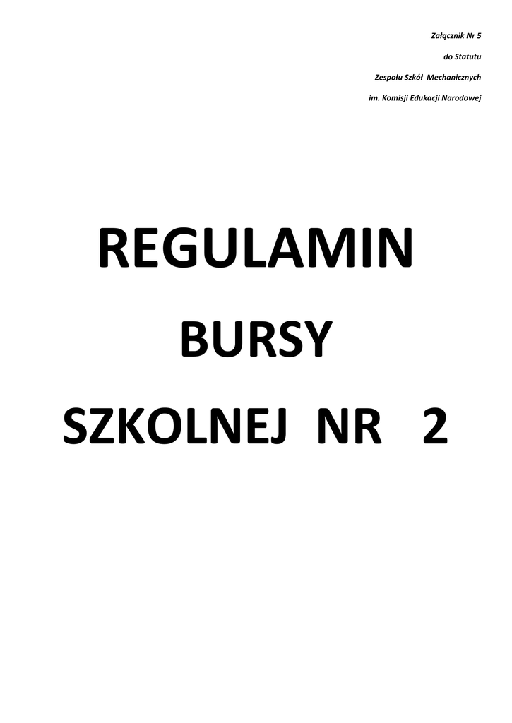 Załącznik Nr 5 do Statutu Zespołu Szkół Mechanicznych im. Komisji Edukacji Narodowej REGULAMIN BURSY SZKOLNEJ NR 2 ART. 1 POSTANOWIENIA OGÓLNE 1. Bursa Szkolna Nr 2 działa w oparciu o przepisy Rozporządzenia Ministra Edukacji Narodowej z dnia 12 maja 2011 r. w sprawie rodzajów i szczegółowych zasad działania placówek publicznych, warunków pobytu dzieci i młodzieży w tych placówkach oraz wysokości i zasad odpłatności wnoszonej przez rodziców za pobyt ich dzieci tych placówkach. 2. Bursa Szkolna Nr 2 jest placówką oświatowo-wychowawczą, która przejmuje funkcje domu rodzinnego w okresie nauki, wobec uczniów poznańskich szkół podstawowych, gimnazjalnych i ponadgimnazjalnych, mających stałe miejsce zameldowania poza Poznaniem. 3. W przypadku posiadania wolnych miejsc bursa może przyjąć także słuchaczy studiów policealnych i zakładów kształcenia nauczycieli. 4. Osoby zakwaterowane w bursie a wymienione w ust. 2 i 3 niniejszego artykułu nazywane są w dalszej części Regulaminu wychowankami. 5. Niniejszy Regulamin określa podstawowe zadania i cele bursy, tryb przyjęcia do bursy, wewnętrzną organizację pracy, rodzaj prowadzonej dokumentacji pedagogicznej, prawa i obowiązki wychowanków, system nagradzania i karania wychowanków, zasady odpłatności za bursę, zasady wyjść poza bursę, tryb ogłaszania obowiązkowych wyjazdówek. ART. 2 CELE I ZADANIA BURSY 1. Głównym celem bursy jest zapewnienie wychowankom opieki oraz stworzenie im możliwie dobrych warunków do nauki i wszechstronnego rozwoju osobowości. 2. Do podstawowych zadań jakie bursa spełnia wobec swoich wychowanków należą: 1/ zapewnienie całodobowej, całotygodniowej opieki, w tym zwłaszcza całodziennego wyżywienia, które na terenie bursy realizuje firma cateringowa, wybrana w procedurze wynikającej z przepisów Ustawy o zamówieniach publicznych; 2/ udzielanie pierwszej pomocy wychowankom tego potrzebującym lub kierowanie ich do zakładów służby zdrowia jeśli zaistnieje taka konieczność; 3/ zagwarantowanie wychowankom jak najlepszych warunków do nauki oraz zorganizowanie pomocy w nauce, poprzez bezpłatne korepetycje wychowawców a tak-że poprzez zorganizowanie samopomocy koleżeńskiej wśród wychowanków; 4/ stwarzanie możliwości i warunków do rozwijania własnych zainteresowań, uczestnictwa w kulturze i turystyce między innymi poprzez działalność biblioteki i różnych sekcji przy czym katalog sekcji ustala się w zależności od potrzeb zgłaszanych przez młodzież; 5/ zabezpieczenie jak najlepszych warunków zamieszkania. 3. Bursa wspiera wychowanków ze szczególnymi potrzebami edukacyjnymi i wychowawczymi; bursa zapewnia wychowankom pomoc psychologiczno- pedagogiczną w zakresie kompetencji wychowawców i psychologa. 4. Szczegóły pomocy psychologiczno-pedagogicznej określa regulamin przygotowany w oparciu o program wychowawczy i program profilaktyki, stanowiący załącznik do niniejszego Regulaminu Bursy. ART. 3 ORGANY BURSY I ZESPOŁY PRACUJĄCE W BURSIE 1. Bursa Szkolna Nr 2 wchodzi w skład Zespołu Szkół Mechanicznych im. Komisji Edukacji Narodowej; Zespołem kieruje Dyrektor. 2. Bieżącą pracą pedagogiczną bursy kieruje kierownik bursy. 3. Radę Pedagogiczną bursy stanowią: dyrektor jako przewodniczący, kierownik bursy, wszyscy wychowawcy, bibliotekarz i psycholog; Rada Pedagogiczna bursy wchodzi w skład Rady Pedagogicznej Zespołu Szkół Mechanicznych. 4. W bursie działa samorząd wychowanków reprezentowany przez Młodzieżową Radę Bursy; jej tryb wyboru, zakres działania i kompetencje określa odrębny dokument stanowiący załącznik do niniejszego Regulaminu. 5. W skład zespołu wychowawczego wchodzą wszyscy wychowawcy bursy oraz psycholog; zespołowi przewodniczy kierownik bursy. 6. W razie potrzeby członkowie zespołu mogą się konsultować z pedagogami i psychologami ze szkół lub poradni psychologiczno-pedagogicznej. ART. 4 ZASADY UDZIELANIA POMOCY PSYCHOLOGICZNO-PEDAGOGICZNEJ 1. Bursa wspiera wychowanków ze szczególnymi potrzebami edukacyjnymi i wychowawczymi; bursa zapewnia wychowankom pomoc psychologiczno-pedagogiczną w zakresie kompetencji wychowawców i psychologa. 2. Pomoc psychologiczno-pedagogiczna w Bursie Szkolnej Nr 2 polega szczególnie na: 1/ diagnozowaniu środowiska wychowanka; 2/ rozpoznawaniu potencjalnych możliwości oraz indywidualnych potrzeb wychowanka i umożliwianiu ich zaspokajania; 3/ rozpoznawaniu przyczyn trudności i niepowodzeń szkolnych; 4/ wspieraniu wychowanka z wybitnymi uzdolnieniami; 5/ organizowaniu różnych form pomocy psychologiczno-pedagogicznej; 6/ podejmowaniu działań wychowawczych i profilaktycznych wynikających z programu wychowawczego i programu profilaktyki; 7/ prowadzeniu psychoedukacji, edukacji prozdrowotnej i promocji zdrowia wśród wychowanków, ich rodziców i wychowawców; 8/ wspomaganiu rodziców i wychowawców w rozwiązywaniu pojawiających się problemów wychowawczych; 9/ podejmowaniu działań mediacyjnych i interwencyjnych w sytuacjach kryzysowych. 3. Pomoc psychologiczno-pedagogiczna jest udzielana z inicjatywy: 1/ samego wychowanka; 2/ rodziców wychowanka; 3/ dyrektora zespołu szkół lub kierownika bursy; 4/ psychologa; 5/wychowawcy grupy wychowawczej. 4. Pomoc psychologiczno-pedagogiczna udzielana jest w formie porad i konsultacji oraz zajęć i warsztatów, zwłaszcza o treści rozwijającej uzdolnienia i mających charakter socjoterapeutyczny. 5. Wymienione w pkt. 4 formy pomocy psychologiczno-pedagogicznej realizują wychowawcy grup i psycholog; możliwe jest też zaproszenie do przeprowadzenia określonej formy pomocy, specjalisty spoza bursy. 6. Zadania z zakresu pomocy psychologiczno-pedagogicznej są realizowane we współpracy z: 1/ poradniami psychologiczno-pedagogicznymi; 2/szkołami, do których uczęszczają wychowankowie potrzebujący pomocy; 3/ innymi podmiotami działającymi na rzecz dzieci i młodzieży oraz rodziny