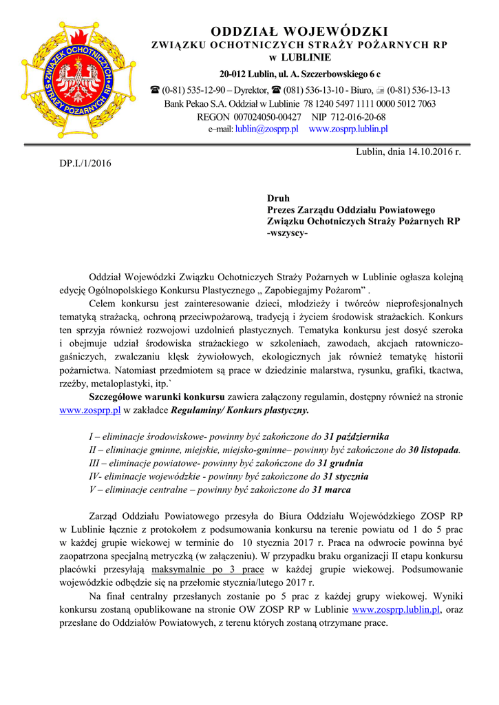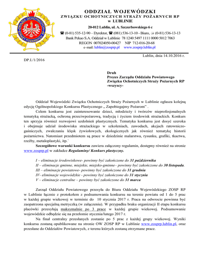 ODDZIAŁ WOJEWÓDZKI ZWIĄZKU OCHOTNICZYCH STRAŻY POŻARNYCH RP w LUBLINIE 20-012 Lublin, ul. A. Szczerbowskiego 6 c (0-81) 535-12-90 – Dyrektor, (081) 536-13-10 - Biuro, (0-81) 536-13-13 Bank Pekao S.A. Oddział w Lublinie 78 1240 5497 1111 0000 5012 7063 REGON 007024050-00427 NIP 712-016-20-68 e–mail: [email protected] www.zosprp.lublin.pl Lublin, dnia 14.10.2016 r. DP.I./1/2016 Druh Prezes Zarządu Oddziału Powiatowego Związku Ochotniczych Straży Pożarnych RP -wszyscy- Oddział Wojewódzki Związku Ochotniczych Straży Pożarnych w Lublinie ogłasza kolejną edycję Ogólnopolskiego Konkursu Plastycznego „ Zapobiegajmy Pożarom” . Celem konkursu jest zainteresowanie dzieci, młodzieży i twórców nieprofesjonalnych tematyką strażacką, ochroną przeciwpożarową, tradycją i życiem środowisk strażackich. Konkurs ten sprzyja również rozwojowi uzdolnień plastycznych. Tematyka konkursu jest dosyć szeroka i obejmuje udział środowiska strażackiego w szkoleniach, zawodach, akcjach ratowniczogaśniczych, zwalczaniu klęsk żywiołowych, ekologicznych jak również tematykę historii pożarnictwa. Natomiast przedmiotem są prace w dziedzinie malarstwa, rysunku, grafiki, tkactwa, rzeźby, metaloplastyki, itp.` Szczegółowe warunki konkursu zawiera załączony regulamin, dostępny również na stronie www.zosprp.pl w zakładce Regulaminy/ Konkurs plastyczny. I – eliminacje środowiskowe- powinny być zakończone do 31 października II – eliminacje gminne, miejskie, miejsko-gminne– powinny być zakończone do 30 listopada. III – eliminacje powiatowe- powinny być zakończone do 31 grudnia IV- eliminacje wojewódzkie - powinny być zakończone do 31 stycznia V – eliminacje centralne – powinny być zakończone do 31 marca Zarząd Oddziału Powiatowego przesyła do Biura Oddziału Wojewódzkiego ZOSP RP w Lublinie łącznie z protokołem z podsumowania konkursu na terenie powiatu od 1 do 5 prac w każdej grupie wiekowej w terminie do 10 stycznia 2017 r. Praca na odwrocie powinna być zaopatrzona specjalną metryczką (w załączeniu). W przypadku braku organizacji II etapu konkursu placówki przesyłają maksymalnie po 3 prace w każdej grupie wiekowej. Podsumowanie wojewódzkie odbędzie się na przełomie stycznia/lutego 2017 r. Na finał centralny przesłanych zostanie po 5 prac z każdej grupy wiekowej. Wyniki konkursu zostaną opublikowane na stronie OW ZOSP RP w Lublinie www.zosprp.lublin.pl, oraz przesłane do Oddziałów Powiatowych, z terenu których zostaną otrzymane prace. ODDZIAŁ WOJEWÓDZKI ZWIĄZKU OCHOTNICZYCH STRAŻY POŻARNYCH RP w LUBLINIE 20-012 Lublin, ul. A. Szczerbowskiego 6 c (0-81) 535-12-90 – Dyrektor, (081) 536-13-10 - Biuro, (0-81) 536-13-13 Bank Pekao S.A. Oddział w Lublinie 78 1240 5497 1111 0000 5012 7063 REGON 007024050-00427 NIP 712-016-20-68 e–mail: [email protected] www.zosprp.lublin.pl Pozostałe warunki organizacji konkursu 1. Do oceny prac na szczeblu wojewódzkim nie będą przyjmowane prace przestrzenne oraz arkusze o powierzchni więcej niż 1m2. 2. Prace, które nie zostaną zakwalifikowane do szczebla Krajowego można odbierać w terminie do 28 lutego 2017 r. 3. Organizator konkursu zastrzega sobie prawo do pozostawienia prac i wykorzystania dla potrzeb wydawniczych lub innych ( o ile autor nie zgłosi zastrzeżeń w tej sprawie). Dla laureatów szczebla krajowego organizowane są warsztaty artystyczne jako forma nagrody i pomocy warsztatowej dla młodych twórców. Nagrodzone prace prezentowane są w formie wystaw. Wyniki konkursu ogłaszane są w czasopiśmie „Strażak”. Prosimy druha Prezesa o przekazanie tej informacji do gmin oraz zainteresowanych placówek na terenie powiatu. Ze strażackim pozdrowieniem W załączeniu 1. Regulamin Ogólnopolskiego Konkursu Plastycznego 2. Metryczka pracy