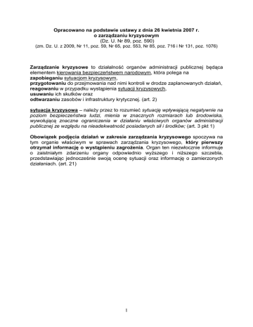 Opracowano na podstawie ustawy z dnia 26 kwietnia 2007 r. o zarządzaniu kryzysowym (Dz. U. Nr 89, poz. 590) (zm. Dz. U. z 2009, Nr 11, poz. 59, Nr 65, poz. 553, Nr 85, poz. 716 i Nr 131, poz. 1076) Zarządzanie kryzysowe to działalność organów administracji publicznej będąca elementem kierowania bezpieczeństwem narodowym, która polega na zapobieganiu sytuacjom kryzysowym, przygotowaniu do przejmowania nad nimi kontroli w drodze zaplanowanych działań, reagowaniu w przypadku wystąpienia sytuacji kryzysowych, usuwaniu ich skutków oraz odtwarzaniu zasobów i infrastruktury krytycznej. (art. 2) sytuacja kryzysowa – naleŜy przez to rozumieć sytuację wpływającą negatywnie na poziom bezpieczeństwa ludzi, mienia w znacznych rozmiarach lub środowiska, wywołującą znaczne ograniczenia w działaniu właściwych organów administracji publicznej ze względu na nieadekwatność posiadanych sił i środków; (art. 3 pkt 1) Obowiązek podjęcia działań w zakresie zarządzania kryzysowego spoczywa na tym organie właściwym w sprawach zarządzania kryzysowego, który pierwszy otrzymał informację o wystąpieniu zagroŜenia. Organ ten niezwłocznie informuje o zaistniałym zdarzeniu organy odpowiednio wyŜszego i niŜszego szczebla, przedstawiając jednocześnie swoją ocenę sytuacji oraz informację o zamierzonych działaniach. (art. 21) 1 Powiatowy Zespół Zarządzania Kryzysowego (PZZK): Powiatowy Zespół Reagowania Kryzysowego utworzony na podstawie art. 12 ustawy z dnia 18 kwietnia 2002 r. o stanie klęski Ŝywiołowej (Dz. U. Nr 62, poz. 558, z późn. zm.) staje się z dniem wejścia w Ŝycie ustawy o zarządzaniu kryzysowym Powiatowym Zespołem Zarządzania Kryzysowego. (art. 32) Starosta wykonuje zadania zarządzania kryzysowego przy pomocy Powiatowego Zespołu Zarządzania Kryzysowego (art. 17 ust. 4) PZZK wykonuje na obszarze powiatu zadania przewidziane dla zespołów wojewódzkich (art. 17 ust. 5) Zadania PZZK: 1) ocena występujących i potencjalnych zagroŜeń mogących mieć wpływ na bezpieczeństwo publiczne i prognozowanie tych zagroŜeń; 2) przygotowywanie propozycji działań i przedstawianie staroście wniosków dotyczących wykonania, zmiany lub zaniechania działań ujętych w powiatowym planie zarządzania kryzysowego; publicznej informacji związanych 3) przekazywanie do wiadomości z zagroŜeniami; 4) opiniowanie powiatowego planu zarządzania kryzysowego; (art. 14 ust. 8 w związku z art. 17 ust. 5) Starosta: 1) powołuje PZZK; 2) określa skład PZZK; 3) określa organizację PZZK; 4) określa siedzibę PZZK; 5) określa tryb pracy PZZK. (art. 17 ust. 4) Skład PZZK: Pracami zespołu powiatowego kieruje starosta. Starosta powołuje w skład PZZK osoby spośród: 1) osób zatrudnionych w starostwie powiatowym, powiatowych jednostkach organizacyjnych lub jednostkach organizacyjnych stanowiących aparat pomocniczy kierowników zespolonych słuŜb, inspekcji i straŜy powiatowych; 2) przedstawicieli społecznych organizacji ratowniczych; (art. 17 ust. 6) W skład PZZK mogą wchodzić inne osoby zaproszone przez starostę. (art. 17 ust. 7) Starosta moŜe powoływać ekspertów do udziału w pracach PZZK (art. 22) 2 Powiatowy Plan Zarządzania Kryzysowego (PPZK): Elementy PPZK: 1) plan główny zawiera: a) charakterystykę zagroŜeń oraz ocenę ryzyka ich wystąpienia, w tym dotyczących infrastruktury krytycznej oraz mapy ryzyka i mapy zagroŜeń, b) zadania i obowiązki uczestników zarządzania kryzysowego w formie siatki bezpieczeństwa, c) zestawienie sił i środków planowanych do wykorzystania w sytuacjach kryzysowych; 2) zespół przedsięwzięć na wypadek sytuacji kryzysowych, a w tym : a) zadania w zakresie monitorowania zagroŜeń, b) tryb uruchamiania niezbędnych sił i środków, uczestniczących w realizacji planowanych przedsięwzięć na wypadek sytuacji kryzysowej, c) procedury reagowania kryzysowego, określające sposób postępowania w sytuacjach kryzysowych, d) współdziałanie między siłami, o których mowa w lit. b; 3) załączniki funkcjonalne planu głównego określające: a) procedury realizacji zadań z zakresu zarządzania kryzysowego, w tym związane z ochroną infrastruktury krytycznej, b) organizację łączności, c) organizację systemu monitorowania zagroŜeń, ostrzegania i alarmowania, d) zasady informowania ludności o zagroŜeniach i sposobach postępowania na wypadek zagroŜeń, e) organizację ewakuacji z obszarów zagroŜonych, f) organizację ratownictwa, opieki medycznej, pomocy społecznej oraz pomocy psychologicznej, g) organizację ochrony przed zagroŜeniami charakterystycznymi dla danego obszaru, h) wykaz zawartych umów i porozumień związanych z realizacją zadań zawartych w planie zarządzania kryzysowego, i) zasady oraz tryb oceniania i dokumentowania szkód, j) procedury uruchamiania rezerw państwowych, k) wykaz infrastruktury krytycznej znajdującej się na terenie powiatu, objętej planem zarządzania kryzysowego, l) priorytety w zakresie ochrony oraz odtwarzania infrastruktury krytycznej. (art. 5 ust. 2) PPZK podlega systematycznej aktualizacji, a cykl planowania nie moŜe być dłuŜszy niŜ dwa lata. (art. 5 ust. 3) Cykl planowania realizuje Starosta oraz podmioty przewidywane do realizacji przedsięwzięć określonych w PPZK, w zakresie ich dotyczącym. (art. 5 ust. 4) PPZK uzgadnia się z kierownikami jednostek organizacyjnych, w zakresie ich dotyczącym, planowanych do wykorzystania przy realizacji przedsięwzięć określonych w PPZK. (art. 5 ust. 5) PPZK pozostaje w mocy do czasu jego aktualizacji. (art. 2 ust. 3 ustawy z dnia 17 lipca 2009 r. o zmianie ustawy o zarządzaniu kryzysowym (Dz.U. Nr 131, poz. 1076). 3 Infrastruktura krytyczna: Do zadań starosty w sprawach zarządzania kryzysowego naleŜy organizacja i realizacja zadań z zakresu ochrony infrastruktury krytycznej. (art.17 ust. 2 pkt 6) Ochrona infrastruktury krytycznej – wszelkie działania zmierzające do zapewn