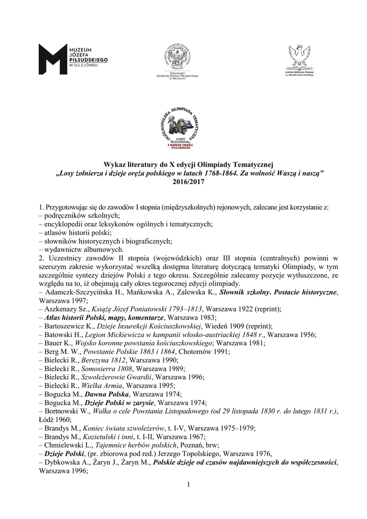 Wykaz literatury do X edycji Olimpiady Tematycznej „Losy żołnierza i dzieje oręża polskiego w latach 1768-1864. Za wolność Waszą i naszą” 2016/2017 1. Przygotowując się do zawodów I stopnia (międzyszkolnych) rejonowych, zalecane jest korzystanie z: – podręczników szkolnych; – encyklopedii oraz leksykonów ogólnych i tematycznych; – atlasów historii polski; – słowników historycznych i biograficznych; – wydawnictw albumowych. 2. Uczestnicy zawodów II stopnia (wojewódzkich) oraz III stopnia (centralnych) powinni w szerszym zakresie wykorzystać wszelką dostępna literaturę dotyczącą tematyki Olimpiady, w tym szczególnie syntezy dziejów Polski z tego okresu. Szczególnie zalecamy pozycje wytłuszczone, ze względu na to, iż obejmują cały okres tegorocznej edycji olimpiady. – Adamczk-Szczycińska H., Mańkowska A., Zalewska K., Słownik szkolny. Postacie historyczne, Warszawa 1997; – Aszkenazy Sz., Książę Józef Poniatowski 1793–1813, Warszawa 1922 (reprint); – Atlas historii Polski, mapy, komentarze, Warszawa 1983; – Bartoszewicz K., Dzieje Insurekcji Kościuszkowskiej, Wiedeń 1909 (reprint); – Batowski H., Legion Mickiewicza w kampanii włosko-austriackiej 1848 r., Warszawa 1956; – Bauer K., Wojsko koronne powstania kościuszkowskiego; Warszawa 1981; – Berg M. W., Powstanie Polskie 1863 i 1864, Chotomów 1991; – Bielecki R., Berezyna 1812, Warszawa 1990; – Bielecki R., Somosierra 1808, Warszawa 1989; – Bielecki R., Szwoleżerowie Gwardii, Warszawa 1996; – Bielecki R., Wielka Armia, Warszawa 1995; – Bogucka M., Dawna Polska, Warszawa 1974; – Bogucka M., Dzieje Polski w zarysie, Warszawa 1974; – Bortnowski W., Walka o cele Powstania Listopadowego (od 29 listopada 1830 r. do lutego 1831 r.), Łódź 1960; – Brandys M., Koniec świata szwoleżerów, t. I-V, Warszawa 1975–1979; – Brandys M., Kozietulski i inni, t. I-II, Warszawa 1967; – Chmielewski L., Tajemnice herbów polskich, Poznań, brw; – Dzieje Polski, (pr. zbiorowa pod red.) Jerzego Topolskiego, Warszawa 1976, – Dybkowska A., Żaryn J., Żaryn M., Polskie dzieje od czasów najdawniejszych do współczesności, Warszawa 1996; 1 – Dylądowa H., Duchowieństwo katolickie wobec sprawy narodowej 1764–1864, Lublin 1981; – Gąsiorowska N., W stulecie Wiosny Ludów 1848–1849, t. I-IV, Warszawa 1948–1953; – Gembarzewski B., Wojsko Polskie. Księstwo Warszawskie 1807–1814, Warszawa 1905 (reprint); – Gembarzewski B., Wojsko Polskie. Królestwo Polskie 1815–1830, Warszawa 1905 (reprint); – Guerquin Bohdan, Zamki w Polsce, Warszawa 1984, – Handelsman M., Książę Adam Czartoryski, Warszawa 1949; – Handelsman M., Napoleon a Polska, Warszawa 1914; – Herbst. S., Z dziejów wojskowych Powstania Kościuszkowskiego 1794 roku, Warszawa 1983; – Historia nauki polskiej, t. II, Warszawa 1970; – Historia państwa i prawa Polskiego w latach 1795–1864, (pr. zbior. pod red. J. Bardacha i M. Senkowskiej-Gluk), Warszawa 1981; – Jasienica P., Rzeczpospolita obojga narodów, Warszawa 1967 (i następne wydania); – Kieniewicz S., Legion Mickiewicza 1848–1849, Warszawa 1957; – Kieniewicz S., Między ugodą a rewolucją. Andrzej Zamoyski w l. 1861–1862, Warszawa 1983; – Kieniewicz S., Powstanie Styczniowe, Warszawa 1983; – Kieniewicz S., Warszawa w Powstaniu Styczniowym, Warszawa 1983; – Kijowski A., Listopadowy wieczór, Warszawa 1972; – Koberdowa I., Polska Wiosna Ludów, Katowice 1967; – Konopczyński W., Konfederacja barska, t. I-II, Warszawa 1991; – Kopczewski J. S., Tadeusz Kościuszko w historii i tradycji, Warszawa 1968; – Korzon T., Dzieje wojen i wojskowości w Polsce, t. III, Kraków 1912 (reprint Poznań 2003); – Korzon T., Kościuszko. Biografia z dokumentów wysnuta, Kraków brw. (reprint); – Kozielski S., Polska broń. Broń palna, Wrocław 1975; – Kozłowski E., Generał Józef Bem, Warszawa 1958; – Kozłowski E., Generał Józef Hauke-Bosak 1834–1871, Warszawa 1973; – Kozłowski E., Dzieje oręża polskiego 1794–1938, t. II, Warszawa 1973; – Kozłowski E., Legion Polski na Węgrzech 1848–1849, Warszawa 1983; – Kozłowski E., Od Węgrowa do Opatowa, Warszawa 1963 – Kukiel M., Dzieje Polski porozbiorowej 1795–1921, Londyn 1962 (reprint) – Kukiel M., Dzieje Wojska Polskiego w epoce napoleońskiej 1795–1815; Warszawa 1920 (reprint); – Kukiel M., Od Wiednia do Maciejowic, Londyn 1965 (reprint) – Kukiel M., Wojna 1812 roku; Warszawa 1937 (reprinty); – Kukiel M., Zarys historii wojskowości w Polsce; Warszawa 1921 (reprinty); – Lilejko J., Regalia Polskie, Warszawa 1987; – Limanowski B., Historia demokracji polskiej w okresie porozbiorowym, Warszawa 1957; – Łepkowski T., Piotr Wysocki, Warszawa 1981; – Łepkowski T., Polska – narodziny nowoczesnego narodu 1764–1870, Warszawa 1967; – Łepkowski T., Warszawa w Powstaniu Listopadowym, Warszawa 1965; – Łojek J., Geneza i obalenie Konstytucji 3 Maja, Lublin 1986; – Łojek J., Ku naprawie Rzeczypospolitej, Warszawa 1988; – Łojek J., Szanse Powstania Listopadowego. Rozważania historyczne, Warszawa 1966; – Łojko J., Średniowieczne herby polskie, Poznań 1985; – Łukasiewicz M., Armia księcia Józefa 1813, Warszawa 1986; – Majchrowski S., Niezwykłe postacie z czasów Powstania Listopadowego, Warszawa 1984; – Majchrowski S., Rodzina Hauke, Warszawa 1972; – Majewski W., Grochów 1831, Warszawa 1982; – Mały słownik terminologiczny architektury obronnej w Polsce, Wrocław 1974, – Mikuła S. W., Maciejowice 1794 r., Warszawa 1991; – Mikuła S. W., Obrona Warszawy w Powstaniu Kościuszkowskim 1794 r., Warszawa 2003; – Nadolski A., Polska broń. Broń biała, Wrocław 1975; 2 – Nadzieja J., Generał Józef Zajączek 1752–1826, Warszawa 1975; – Nadzieja J., Lipsk 1813, Warszawa 1998; – Nadzieja J., Zamość 1813, Warszawa 1997; – Nowak T., Z dziejów techniki wojennej w dawnej Polsce, Warszawa 