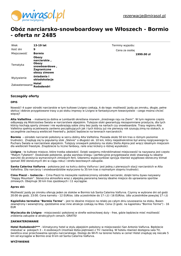 [email protected] Obóz narciarsko-snowboardowy we Włoszech - Bormio - oferta nr 2485 Wiek 13-19 lat Ilość dni 9 Miejscowość Bormio Tematyka Obozy narciarskie , Obozy snowboardowe , Zagraniczne obozy zimowe Wyżywienie śniadania i obiadokolacje Zakwaterowanie Hotel Rododendri Terminy wyjazdu: Cena za osobę 1999.00 zł Szczegóły oferty OPIS Nowość! 4 super ośrodki narciarskie w tym kultowe Livigno czekają. A do tego: możliwość jazdy po zmroku, długie, pełne słońca i dobrze przygotowane trasy a po stoku imprezy w Livigno w fantastycznym towarzystwie - czego można chcieć więcej? Alta Valtellina - malownicza dolina w Lombardii określana mianem „śnieżnego raju na Ziemi”. W tym regionie często odbywają się Mistrzostwa Świata w narciarstwie alpejskim. Tutejsze stoki gwarantują niezapomniane przeżycia, dla tych którzy kochają sporty zimowe i nie wyobrażają sobie zimy bez jazdy na nartach czy snowboardzie. Trasy regionu Alta Valletina spełnią oczekiwania zarówno początkujących jak i tych którzy już nie pierwszy rok szusują zimą na stokach, a szczególnie zachwycą wielbicieli freeried'u. Jeździć będziecie na terenach narciarskich: Bormio - ośrodek narciarski położony w sercu doliny Alta Valltelina. Posiada około 50 km tras o różnym poziomie trudności. Znajduję się tu popularny stok „Stelvio” o długości ok. 10 km, który niejednokrotnie był areną rozgrywanego tu Pucharu Świata w narciarstwie alpejskim. Tutejszy snowpark położony na stoku Stella Alpina jest wręcz idealnym miejscem dla wielbicieli freestyle. Znajdziecie tu liczne fanboxy, raile oraz kickery o różnej wysokości. Livigno - to kultowe miejsce, które trzeba odwiedzić. Dzięki swojemu mikroklimatowi miejscowość ta nazywana jest często "Małym Tybetem". Doskonałe położenie, gruba warstwa śniegu i perfekcyjnie przygotowane stoki stwarzają tu idealne warunki do przeżycia wymarzonych zimowych ferii. Udanemu wypoczynkowi sprzyja również wyjątkowo słoneczny klimat (ponad 300 słonecznych dni w ciągu roku) i strefa bezcłowych zakupów. Santa Caterina Valfurva - położona jest na końcu doliny Valfurva i jest jedną z pierwszych stacji narciarskich w Alta Valtellina. Dla narciarzy i snowboardzistów wytyczono tu 35 km tras o rozmaitym stopniu trudności. Cima Piazzi – Isolaccia - Cima Piazzi to niezwykle nasłoneczniony ośrodek narciarski, dzięki temu bywa nazywany “Happy Mountain“. Słoneczna atmosfera wraz z alpejską panoramą tworzą idealne miejsce do uprawiania sportów zimowych. Obejmuje 30 km tras zjazdowych i 11 wyciągów. Apres ski: Możliwość jazdy po zmroku oferuję jeden ze stoków w Bormio lub Santa Caterina Valfurva. Czynny w wybrane dni od godz 20:00 do godz. 23:00. Cena karnetu - 12 EUR/os. (dla uczestników do 17 r.ż) i 16 EUR/os. (dla uczestników powyżej 17 r.ż) Kąpielisko termalne "Bormio Terme" - jest to idealne miejsce na relaks po całym dniu szusowania na stoku. Basen zewnętrzny i wewnętrzny, zjeżdżalnie oraz inne atrakcje czekają na Was. Cena (3 godz. na kąpielisku "Bormio Terme") - 16 EUR Wycieczka do Livigno - miejscowości położonej w strefie wolnocłowej duty - free, gdzie będziecie mieć możliwość zrobienia zakupów w atrakcyjnych cenach. GRATIS! ZAKWATEROWANIE Hotel Rododendri*** - klimatyczny hotel w stylu alpejskim położony w miejscowości San Antonio Valfurva. Będziecie mieszkać w pokojach 3 – 4 osobowych (możliwe łóżka piętrowe) z TV i łazienką. W hotelu również dostępna sala TV, świetlica oraz przechowalnia sprzętu narciarskiego. Dostęp do WI-FI na terenie hotelu w cenie! Hotel znajduję się niecałe 5 km od wyciągów w Bormio oraz 8 km od Santa Catarina Valfurva. WYŻYWIENIE 2 posiłki dziennie w hotelowej restauracji. Śniadania w formie bufetu, obiadokolacja 2 – daniowa serwowana + deser. Woda do obiadokolacji w cenie. Pozostałe napoje do obiadokolacji dodatkowo płatne. Pierwszy posiłek: obiadokolacja pierwszego dnia pobytu w hotelu Ostatni posiłek: śniadanie ostatniego dnia pobytu w hotelu NA STOKU: R’LAX & FUN - Jak sama nazwa wskazuje to obóz dla tych, co lubią lajtową jazdę i dobrą zabawę :) Fun, fun i jeszcze raz fun, a do tego troszkę szkolenia! Na stoku jeździcie w dwóch grupach zaawansowania: średnio zaawansowanej oraz zaawansowanej. Zajęcia na stoku z instruktorem trwają ok. 2 h dziennie, podczas których skoryguje on Wasze błędy, troszkę podszkoli z freeride'u, funcarvingu, freestyle, pokaże nowe tricki w snowparku jak również zapewni wspaniałą jazdę i dobrą zabawę. Resztę czasu na stoku spędzicie szusując swobodnie pod okiem naszej wspaniałej kadry. Tu na pewno nie będzie nudy i monotonii. Gwarantujemy super zabawę, odpoczynek, najfajniejszą kadrę, niezapomniane przeżycia i przyjaźnie na całe życie. POZA STOKIEM Wycieczka do Livigno w cenie! - dyskoteki, puby, kawiarnie i masa sklepów duty-free- to właśnie jest gwarne Livigno czekające na Was po zamknięciu stoków. BUT STANDARD – poza stokiem też można fajnie spędzać czas! Po szaleństwie na stoku czeka na Was zbiór najciekawszych aktywności: gry i zabawy integracyjne, spacery po okolicy, alpejskie zawody w gry planszowe, konkurs na najlepszą rzeźbę ze śniegu oraz wiele innych zabaw :) Razem z Naszą BUT kadrą sprawimy, by czas poza stokiem upłynął na miłej zabawie w dobrym towarzystwie. IMPREZY FAKULTATYWNE Możliwość jazdy po zmroku oferuję jeden ze stoków w Bormio lub Santa Caterina Valfurva. Czynny w wybrane dni od godz 20:00 do godz. 23:00. Cena karnetu - 12 EUR/os. (dla uczestników do 17 r.ż) i 16 EUR/os. (dla uczestników powyżej 17 r.ż) Kąpielisko termalne "Bormio Terme" - jest to idealne miejsce na relaks po całym dniu szusowania na stoku. Basen zewnętrzny i wewnętrzny, zjeżdżalnie oraz inne atrakcje czekają na Was. Cena (3 godz. na kąpielisku "Bormio Terme") - 16 EUR 1 DZIEŃ wyjazd wg. rozkładu jazdy, przejazd prze