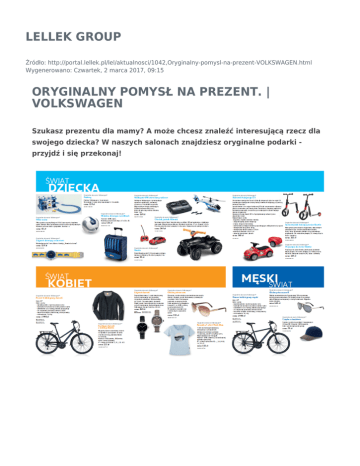 LELLEK GROUP Źródło: http://portal.lellek.pl/lel/aktualnosci/1042,Oryginalny-pomysl-na-prezent-VOLKSWAGEN.html Wygenerowano: Czwartek, 2 marca 2017, 09:15 ORYGINALNY POMYSŁ NA PREZENT. | VOLKSWAGEN Szukasz prezentu dla mamy? A może chcesz znaleźć interesującą rzecz dla swojego dziecka? W naszych salonach znajdziesz oryginalne podarki przyjdź i się przekonaj! ULOTKA DO ŚCIĄGNIĘCIA W FORMACIE PDF. Treść zawarta w wydawnictwie ma charakter informacyjny i nie stanowi oferty handlowej w rozumieniu Kodeksu Cywilnego. Oferta ważna od 01.05.2016 r. do 30.06.2016 r. lub do wyczerpania zapasów. Tweetnij