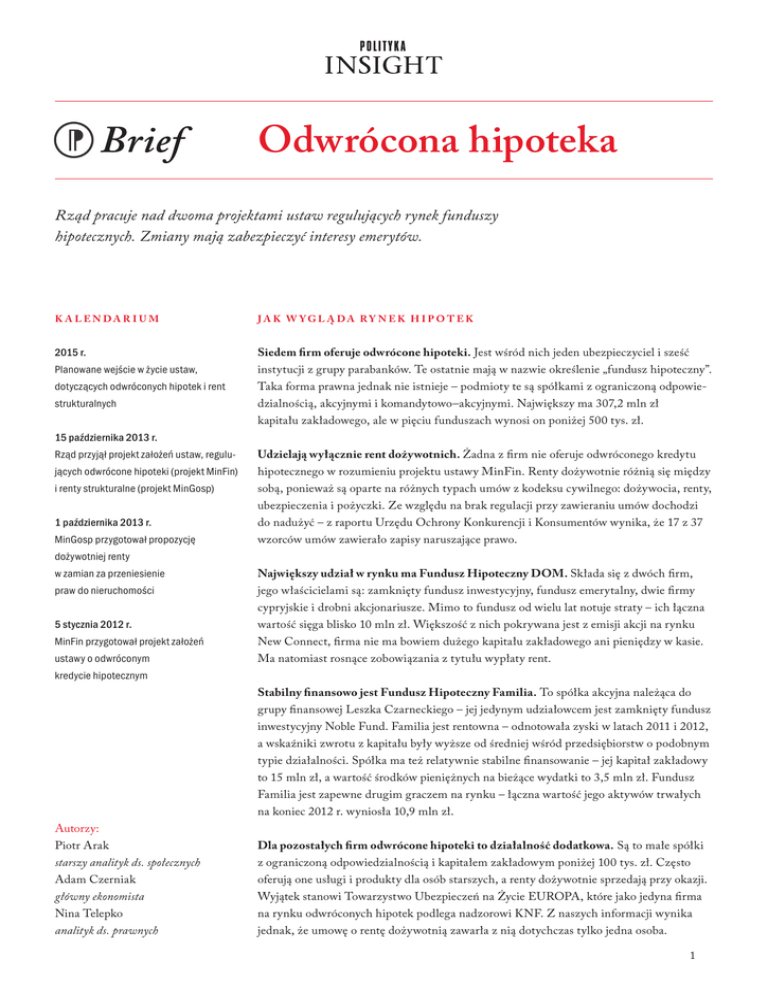 Odwrócona hipoteka Rząd pracuje nad dwoma projektami ustaw regulujących rynek funduszy hipotecznych. Zmiany mają zabezpieczyć interesy emerytów. K A LEN DA R I U M JA K W YGL Ą DA RY NEK HIPOTEK 2015 r. Siedem firm oferuje odwrócone hipoteki. Jest wśród nich jeden ubezpieczyciel i sześć Planowane wejście w życie ustaw, dotyczących odwróconych hipotek i rent strukturalnych 15 października 2013 r. Rząd przyjął projekt założeń ustaw, regulujących odwrócone hipoteki (projekt MinFin) i renty strukturalne (projekt MinGosp) 1 października 2013 r. MinGosp przygotował propozycję dożywotniej renty w zamian za przeniesienie praw do nieruchomości 5 stycznia 2012 r. MinFin przygotował projekt założeń ustawy o odwróconym kredycie hipotecznym instytucji z grupy parabanków. Te ostatnie mają w nazwie określenie „fundusz hipoteczny”. Taka forma prawna jednak nie istnieje – podmioty te są spółkami z ograniczoną odpowiedzialnością, akcyjnymi i komandytowo–akcyjnymi. Największy ma 307,2 mln zł kapitału zakładowego, ale w pięciu funduszach wynosi on poniżej 500 tys. zł. Udzielają wyłącznie rent dożywotnich. Żadna z firm nie oferuje odwróconego kredytu hipotecznego w rozumieniu projektu ustawy MinFin. Renty dożywotnie różnią się między sobą, ponieważ są oparte na różnych typach umów z kodeksu cywilnego: dożywocia, renty, ubezpieczenia i pożyczki. Ze względu na brak regulacji przy zawieraniu umów dochodzi do nadużyć – z raportu Urzędu Ochrony Konkurencji i Konsumentów wynika, że 17 z 37 wzorców umów zawierało zapisy naruszające prawo. Największy udział w rynku ma Fundusz Hipoteczny DOM. Składa się z dwóch firm, jego właścicielami są: zamknięty fundusz inwestycyjny, fundusz emerytalny, dwie firmy cypryjskie i drobni akcjonariusze. Mimo to fundusz od wielu lat notuje straty – ich łączna wartość sięga blisko 10 mln zł. Większość z nich pokrywana jest z emisji akcji na rynku New Connect, firma nie ma bowiem dużego kapitału zakładowego ani pieniędzy w kasie. Ma natomiast rosnące zobowiązania z tytułu wypłaty rent. Stabilny finansowo jest Fundusz Hipoteczny Familia. To spółka akcyjna należąca do grupy finansowej Leszka Czarneckiego – jej jedynym udziałowcem jest zamknięty fundusz inwestycyjny Noble Fund. Familia jest rentowna – odnotowała zyski w latach 2011 i 2012, a wskaźniki zwrotu z kapitału były wyższe od średniej wśród przedsiębiorstw o podobnym typie działalności. Spółka ma też relatywnie stabilne finansowanie – jej kapitał zakładowy to 15 mln zł, a wartość środków pieniężnych na bieżące wydatki to 3,5 mln zł. Fundusz Familia jest zapewne drugim graczem na rynku – łączna wartość jego aktywów trwałych Autorzy: na koniec 2012 r. wyniosła 10,9 mln zł. Piotr Arak Dla pozostałych firm odwrócone hipoteki to działalność dodatkowa. Są to małe spółki Adam Czerniak oferują one usługi i produkty dla osób starszych, a renty dożywotnie sprzedają przy okazji. starszy analityk ds. społecznych główny ekonomista Nina Telepko analityk ds. prawnych z ograniczoną odpowiedzialnością i kapitałem zakładowym poniżej 100 tys. zł. Często Wyjątek stanowi Towarzystwo Ubezpieczeń na Życie EUROPA, które jako jedyna firma na rynku odwróconych hipotek podlega nadzorowi KNF. Z naszych informacji wynika jednak, że umowę o rentę dożywotnią zawarła z nią dotychczas tylko jedna osoba. 1 CO PROPON U J E R Z Ą D Odwrócona hipoteka może mieć postać kredytu albo renty. W przypadku renty dożywotniej prywatna firma przejmuje towi, a nie klient – bankowi. Po śmierci kredytobiorcy bank seniorowi określoną kwotę. Obie formy odwróconej hipoteki Przy odwróconym kredycie hipotecznym bank płaci raty klienprzejmuje nieruchomość, o ile spadkobiercy nie spłacą kredytu wraz z odsetkami. Kredyt może być wypłacany jednorazowo lub w transzach, przez czas określony umową. nieruchomość, a w zamian, co miesiąc aż do śmierci, wypłaca są dziś legalne, ale rząd chce je uregulować, by zwiększyć ich popularność. Odwrócony kredyt hipoteczny Renta dożywotnia Kto jest autorem rozwiązania? MinFin, projekt przekazał RadMin wiceminister Wojciech Kowalczyk MinGosp, projekt przekazał RadMin wiceminister Jerzy Pietrewicz Kto będzie mógł oferować instrument? Odwrócony kredyt będą oferować przede wszystkim banki. Projekt wymaga, by były to instytucje finansowe, pozostające pod nadzorem KNF Rentę dożywotnią będą mogły oferować banki, ale też instytucje podlegające mniejszym rygorom. Wszystkie będą musiały uzyskać specjalne zezwolenie KNF. Nieruchomość przez cały czas trwania umowy będzie należała do konsumenta. Dopiero rok po jego śmierci bank będzie mógł przejąć własność lokalu. Instytucja rozliczy się następnie ze spadkobiercami – rzeczoznawca oszacuje wartość i jeśli okaże się, że bank w ramach odwróconej hipoteki wypłacił zbyt mało, będzie musiał wyrównać resztę wartości spadkobiercom. Z chwilą zawarcia umowy własność mieszkania przejdzie na spółkę oferującą rentę, a konsument uzyska jedynie osobiste prawo mieszkania w lokalu aż do śmierci (tzw. służebność mieszkania). Przy kredycie umowa będzie zawierana na czas nieokreślony, a konsument otrzyma pieniądze jednorazowo albo w ratach wypłacanych aż do śmierci. Konsument będzie regularnie otrzymywał dożywotnią rentę, bez możliwości jednorazowej wypłaty. Renta zostanie zabezpieczona na nieruchomości poprzez hipotekę na nazwisko konsumenta. Przez rok od śmierci właściciela spadkobiercy będą mogli spłacić kwotę, którą wypłacił bank w postaci kredytu. Bank będzie musiał poinformować spadkobierców o takiej możliwości. Jeśli spłacą bank, nieruchomość przypadnie im jako spadek. Projekt renty dożywotniej nie daje spadkobiercom możliwości odzyskania nieruchomości, ponieważ własność