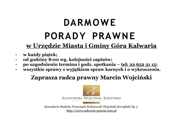 DAR M O W E POR A D Y PRAW N E w Urzędzie Miasta i Gminy Góra Kalwaria - w każdy piątek; od godziny 8:00 wg. kolejności zapisów; po uzgodnieniu terminu i godz. spotkania – tel: 22 652 31 15; wszystkie sprawy z wyjątkiem spraw karnych i o wykroczenia. Zaprasza radca prawny Marcin Wojciński Kancelaria Radców Prawnych Kalinowski Wojciński Korzybski Sp. j. http://www.radcowie-prawni.waw.pl