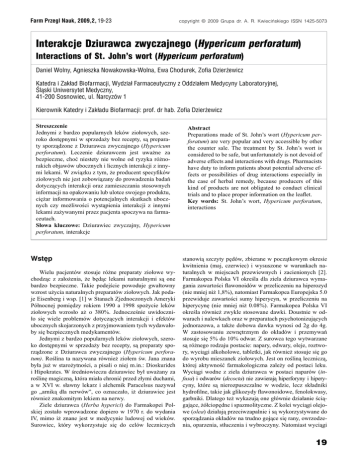 &ARM0RZEGL.AUK COPYRIGHT'RUPADR!2+WIECIÊSKIEGO)33. )NTERAKCJE$ZIURAWCAZWYCZAJNEGO(YPERICUMPERFORATUM )NTERACTIONSOF3T*OHNlSWORT(YPERICUMPERFORATUM $ANIEL7OLNY!GNIESZKA.OWAKOWSKA7OLNA%WA#HODUREK:OFIA$ZIEREWICZ +ATEDRAI:AKAD"IOFARMACJI7YDZIA&ARMACEUTYCZNYZ/DDZIAEM-EDYCYNY,ABORATORYJNEJ gLSKI5NIWERSYTET-EDYCZNY 3OSNOWIECUL.ARCYZÌW +IEROWNIK+ATEDRYI:AKADU"IOFARMACJIPROFDRHAB:OFIA$ZIEREWICZ Streszczenie Jednymi z bardzo popularnych leków ziołowych, szeroko dostępnymi w sprzedaży bez recepty, są preparaty sporządzone z Dziurawca zwyczajnego (Hypericum perforatum). Leczenie dziurawcem jest uważne za bezpieczne, choć niestety nie wolne od ryzyka różnorakich objawów ubocznych i licznych interakcji z innymi lekami. W związku z tym, że producent specyfików ziołowych nie jest zobowiązany do prowadzenia badań dotyczących interakcji oraz zamieszczania stosownych informacji na opakowaniu lub ulotce swojego produktu, ciężar informowania o potencjalnych skutkach ubocznych czy możliwości wystąpienia interakcji z innymi lekami zażywanymi przez pacjenta spoczywa na farmaceutach. Słowa kluczowe: Dziurawiec zwyczajny, Hypericum perforatum, interakcje ' Ö Wielu pacjentów stosuje różne preparaty ziołowe wychodząc z założenia, że będąc lekami naturalnymi są one bardzo bezpieczne. Takie podejście powoduje gwałtowny wzrost użycia naturalnych preparatów ziołowych. Jak podaje Eisenberg i wsp. [1] w Stanach Zjednoczonych Ameryki Północnej pomiędzy rokiem 1990 a 1998 spożycie leków ziołowych wzrosło aż o 380%. Jednocześnie uwidoczniło się wiele problemów dotyczących interakcji i efektów ubocznych skojarzonych z przyjmowaniem tych wydawałoby się bezpiecznych medykamentów. Jednymi z bardzo popularnych leków ziołowych, szeroko dostępnymi w sprzedaży bez recepty, są preparaty sporządzone z Dziurawca zwyczajnego (Hypericum perforatum). Roślina ta nazywana również ziołem św. Jana znana była już w starożytności, a pisali o niej m.in.: Dioskurides i Hipokrates. W średniowieczu dziurawiec był uważany za roślinę magiczną, która miała chronić przed złymi duchami, a w XVI w. sławny lekarz i alchemik Paracelsus nazywał go „arniką dla nerwów”, co oznaczało, iż dziurawiec jest również znakomitym lekiem na nerwy. Ziele dziurawca (Herba hyperici) do Farmakopei Polskiej zostało wprowadzone dopiero w 1970 r. do wydania IV, mimo iż znane jest w medycynie ludowej od wieków. Surowiec, który wykorzystuje się do celów leczniczych Abstract Preparations made of St. John’s wort (Hypericum perforatum) are very popular and very accessible by other the counter sale. The treatment by St. John’s wort is considered to be safe, but unfortunately is not devoid of adverse effects and interactions with drugs. Pharmacists have duty to inform patients about potential adverse effects or possibilities of drug interactions especially in the case of herbal remedy, because producers of this kind of products are not obligated to conduct clinical trials and to place proper information on the leaflet. Key words: St. John’s wort, Hypericum perforatum, interactions stanowią szczyty pędów, zbierane w początkowym okresie kwitnienia (maj, czerwiec) i wysuszone w warunkach naturalnych w miejscach przewiewnych i zacienionych [2]. Farmakopea Polska VI określa dla ziela dziurawca wymagania zawartości flawonoidów w przeliczeniu na hiperozyd (nie mniej niż 1,8%), natomiast Farmakopea Europejska 5.0 przewiduje zawartości sumy hiperycyn, w przeliczeniu na hiperycynę (nie mniej niż 0.08%). Farmakopea Polska VI określa również zwykle stosowane dawki. Doustnie w odwarach i nalewkach oraz w preparatach psychotonizujących jednorazowa, a także dobowa dawka wynosi od 2g do 4g. W zastosowaniu zewnętrznym do okładów i przemywań stosuje się 5% do 10% odwar. Z surowca tego wytwarzane są różnego rodzaju postacie: napary, odwary, oleje, roztwory, wyciągi alkoholowe, tabletki, jak również stosuje się go do wyrobu mieszanek ziołowych. Jest on rośliną leczniczą, której aktywność farmakologiczna zależy od postaci leku. Wyciągi wodne z ziela dziurawca w postaci naparów (infusa) i odwarów (decocta) nie zawierają hiperforyny i hiperycyny, które są nierozpuszczalne w wodzie, lecz składniki hydrofilne, takie jak glikozydy flawonoidowe, fenolokwasy, garbniki. Dlatego też wykazują one głównie działanie ściągające, żółciopędne i spazmolityczne. Z kolei wyciągi olejowe (olea) działają przeciwzapalnie i są wykorzystywane do sporządzania okładów na trudno gojące się rany, owrzodzenia, oparzenia, stłuczenia i wybroczyny. Natomiast wyciągi &ARM0RZEGL.AUK alkoholowe ze świeżego ziela (intracta), soki (succi) oraz nalewki (tincturae) zawierające hiperforynę i hiperycynę, wykazują głównie działanie antydepresyjne [2, 3]. Obecnie na polskim rynku występują też liczne preparaty wyciągu z dziurawca zwyczajnego w postaci tabletek i kapsułek, jak np: Deprim, Deprim forte, Depresplant, Dziurawiec ziele, Don’t Worry, Hypercaps, Hyperherba, Hyperosedat, Perhip, Remotiv, Silenil. Jednakże prowadzone badania wykazały, że preparaty te wchodzą w interakcje z wieloma lekami z różnych grup powodując poważne skutki uboczne. pt-JlJ®l-t-ylR Dziurawiec zawiera szereg substancji chemicznych odpowiedzialnych za terapeutyczne efekty jego działania. W składzie tej rośliny można wyróżnić grupę pochodnych diantronowych i antranolowych (0.05 – 0.3%), którą tworzą między innymi hiperycyna, pseudohiperycyna oraz protohiperycyna, protopseudohiperycyna i cyklopseudohiperycyna, ulegające przekształceniu pod wpływem światła do hiperycyny i pseudohiperycyny. Kolejną dużą grupę składników tworzą flawonoidy (2 – 4%), do których zalicza się flawonole (kemferol, kwercetyna), flawony (luteolina, eter 5,3-dimetylowy luteoliny), glikozydy (hiperozyd (0.3 – 0.7%), rutyna, kwercytryna, izokwercytryna, glikozydy leteoliny