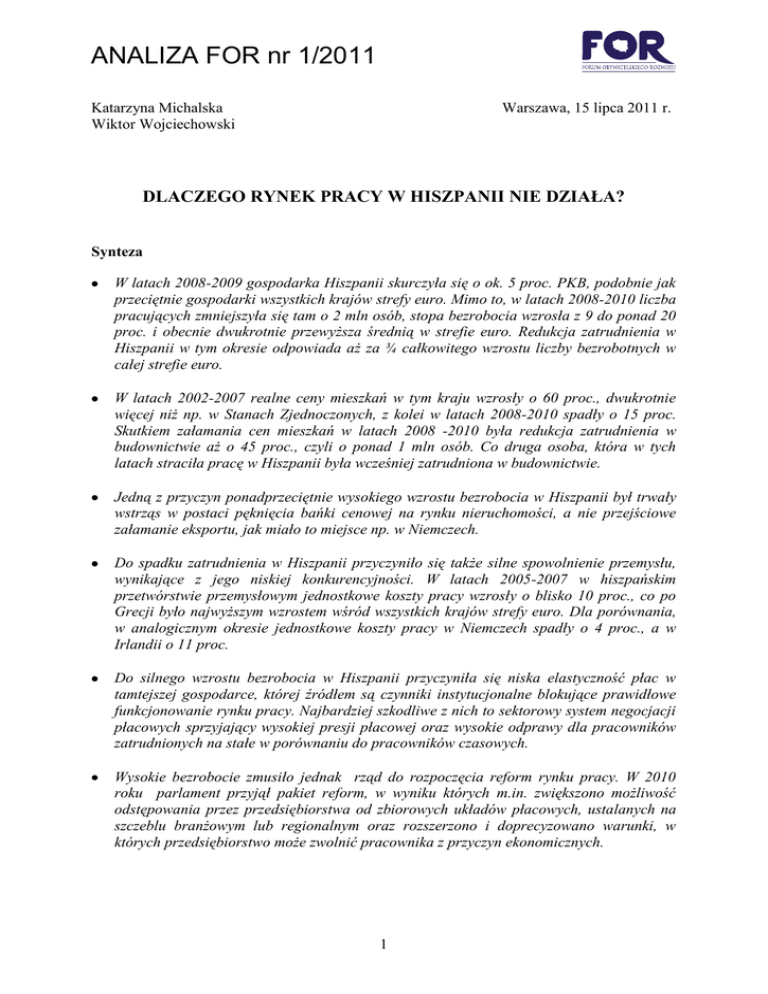 ANALIZA FOR nr 1/2011 Katarzyna Michalska Wiktor Wojciechowski Warszawa, 15 lipca 2011 r. DLACZEGO RYNEK PRACY W HISZPANII NIE DZIAŁA? Synteza W latach 2008-2009 gospodarka Hiszpanii skurczyła się o ok. 5 proc. PKB, podobnie jak przeciętnie gospodarki wszystkich krajów strefy euro. Mimo to, w latach 2008-2010 liczba pracujących zmniejszyła się tam o 2 mln osób, stopa bezrobocia wzrosła z 9 do ponad 20 proc. i obecnie dwukrotnie przewyższa średnią w strefie euro. Redukcja zatrudnienia w Hiszpanii w tym okresie odpowiada aż za ¾ całkowitego wzrostu liczby bezrobotnych w całej strefie euro. W latach 2002-2007 realne ceny mieszkań w tym kraju wzrosły o 60 proc., dwukrotnie więcej niż np. w Stanach Zjednoczonych, z kolei w latach 2008-2010 spadły o 15 proc. Skutkiem załamania cen mieszkań w latach 2008 -2010 była redukcja zatrudnienia w budownictwie aż o 45 proc., czyli o ponad 1 mln osób. Co druga osoba, która w tych latach straciła pracę w Hiszpanii była wcześniej zatrudniona w budownictwie. Jedną z przyczyn ponadprzeciętnie wysokiego wzrostu bezrobocia w Hiszpanii był trwały wstrząs w postaci pęknięcia bańki cenowej na rynku nieruchomości, a nie przejściowe załamanie eksportu, jak miało to miejsce np. w Niemczech. Do spadku zatrudnienia w Hiszpanii przyczyniło się także silne spowolnienie przemysłu, wynikające z jego niskiej konkurencyjności. W latach 2005-2007 w hiszpańskim przetwórstwie przemysłowym jednostkowe koszty pracy wzrosły o blisko 10 proc., co po Grecji było najwyższym wzrostem wśród wszystkich krajów strefy euro. Dla porównania, w analogicznym okresie jednostkowe koszty pracy w Niemczech spadły o 4 proc., a w Irlandii o 11 proc. Do silnego wzrostu bezrobocia w Hiszpanii przyczyniła się niska elastyczność płac w tamtejszej gospodarce, której źródłem są czynniki instytucjonalne blokujące prawidłowe funkcjonowanie rynku pracy. Najbardziej szkodliwe z nich to sektorowy system negocjacji płacowych sprzyjający wysokiej presji płacowej oraz wysokie odprawy dla pracowników zatrudnionych na stałe w porównaniu do pracowników czasowych. Wysokie bezrobocie zmusiło jednak rząd do rozpoczęcia reform rynku pracy. W 2010 roku parlament przyjął pakiet reform, w wyniku których m.in. zwiększono możliwość odstępowania przez przedsiębiorstwa od zbiorowych układów płacowych, ustalanych na szczeblu branżowym lub regionalnym oraz rozszerzono i doprecyzowano warunki, w których przedsiębiorstwo może zwolnić pracownika z przyczyn ekonomicznych. 1 ANALIZA FOR nr 1/2011 1. Mimo, że w ostatnim kryzysie gospodarka Hiszpanii skurczyła się o 5 proc. PKB, podobnie jak przeciętnie gospodarki wszystkich krajów strefy euro … …to doświadczyła znacznie większego wzrost bezrobocia. Ostatni wzrost bezrobocia w strefie euro ma swoje źródła w Hiszpanii W latach 2008-2009 gospodarka Hiszpanii skurczyła się o ok. 5 proc. PKB, podobnie jak przeciętnie gospodarki wszystkich krajów strefy euro (Wykres 1). Mimo to, wpływ tej recesji dla rynek pracy w Hiszpanii był znacznie większy niż w pozostałych krajach Europy Zachodniej (Wykres 2). W latach 2008-2010 liczba pracujących w Hiszpanii zmniejszyła się o 2 mln osób, stopa bezrobocia wzrosła z 9 do ponad 20 proc. i obecnie dwukrotnie przewyższa średnią w strefie euro. Redukcja zatrudnienia w Hiszpanii w tym okresie odpowiada aż za ¾ całkowitego wzrostu liczby bezrobotnych w całej strefie euro. Powyższe dane prowadzą do prostego pytania: dlaczego ostatni kryzys spowodował w Hiszpanii tak silny wzrost bezrobocia i co zrobić, aby je znacząco i trwale obniżyć. Wykres 1. PKB w Hiszpanii, Niemczech i strefie euro (I kw. 2008=100) Wykres 2. Liczba pracujących w Hiszpanii, Niemczech i strefie euro (IV kw. 2007=100) Źródło: Eurostat. Źródło: Eurostat. Większość międzynarodowych różnic w poziomie bezrobocia wyjaśniają czynniki instytucjonalne oraz siła i charakter wstrząsu, który wywołuje spowolnienie lub recesję. Doświadczenia wielu krajów i liczne badania porównawcze wskazują, że większość międzynarodowych różnic w poziomie bezrobocia strukturalnego i poziomu zatrudnienia wyjaśniają czynniki instytucjonalne warunkujące elastyczność funkcjonowania rynku pracy oraz siła i charakter wstrząsów, których doświadczają poszczególne gospodarki (np. Blanchard, Wolfers, 2000). Wspomniane czynniki instytucjonalne to wszelkie regulacje prawne, które określają siłę bodźców przedsiębiorców do tworzenia nowych miejsc pracy (m.in. poziom klina podatkowego, stopień prawnej ochrony zatrudnienia, system negocjacji płacowych) oraz osób zdolnych do pracy do podejmowania zatrudnienia (głównie dostępność, wysokość i okres pobierania zasiłków dla bezrobotnych lub innych świadczeń socjalnych). Analiza ostatnich zmian na hiszpańskim rynku pracy pokazuje, że wnioski z tych badań wciąż pozostają aktualne: wysoki wzrost bezrobocia w Hiszpanii wynika z charakteru wstrząsu, jakiego doświadczył ten kraj po 2007 r. oraz z kształtu instytucji rynku pracy, które znacząco hamują wzrost zatrudnienia. 2 ANALIZA FOR nr 1/2011 2. Pęknięcie bańki spekulacyjnej na rynku nieruchomości spowodowało trwały spadek cen mieszkań… … a w efekcie także trwałą redukcję zatrudnienia w budownictwie. Wpływ wstrząsów na rynek pracy w Hiszpanii Impulsem, który rozpoczął masowe zwolnienia w Hiszpanii w 2008 r. było pękniecie bańki cenowej na rynku nieruchomości. W latach 2002-2007 realne ceny mieszkań w tym kraju wzrosły o 60 proc., dwukrotnie więcej niż np. w Stanach Zjednoczonych, z kolei w latach 2008-2010 spadły o 15 proc. (Wykres 3). Głównymi przyczynami powstania bańki na rynku nieruchomości była ekspansja kredytowa stymulowana przez relatywnie niskie – biorąc pod uwagę tempo rozwoju gospodarczego Hiszpanii - stopy procentowe EBC oraz rządowy program dopłat do rat dla osób zacią