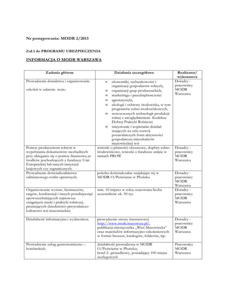 Nr postępowania: MODR 2/2013 Zał.1 do PROGRAMU UBEZPIECZENIA INFORMACJA O MODR WARSZAWA Zadania główne Prowadzenie doradztwa i organizowanie szkoleń w zakresie m.in.: Pomoc producentom rolnym w wypełnianiu dokumentów niezbędnych przy ubieganiu się o pomoc finansową ze środków pochodzących z funduszy Unii Europejskiej lub innych instytucji krajowych czy zagranicznych. Prowadzenie doświadczalnictwa odmianowego roślin uprawnych. Działania szczegółowe • ekonomiki, rachunkowości i organizacji gospodarstw rolnych, • organizacji grup producenckich, • marketingu i przedsiębiorczości • agroturystyki, • ekologii i ochrony środowiska, w tym programów rolno-środowiskowych, • nowoczesnych technologii produkcji rolnej z uwzględnieniem Kodeksu Dobrej Praktyki Rolniczej • inicjowanie i wspieranie działań mających na celu rozwój pozarolniczych form aktywności gospodarczej mieszkańców mazowieckiej wsi wnioski o płatności obszarowe, dopłaty rolnośrodowiskowe, wnioski o fundusze unijne w ramach PROW poletka doświadczalne znajdujące się w MODR O/Poświętne w Płońsku Realizator/ wykonawca Doradcy pracownicy MODR Warszawa Doradcy pracownicy MODR Warszawa Doradcy pracownicy MODR Warszawa Doradcy pracownicy MODR Warszawa Organizowanie wystaw, kiermaszów, targów, konferencji i innych przedsięwzięć upowszechniających najnowsze osiągnięcia nauki i praktyki rolniczej, promujących dziedzictwo przyrodniczokulturowe wsi mazowieckiej. min. 10 imprez w roku; szacowana liczba uczestników ok. 50 tys. Działalność informacyjna i wydawnicza. prowadzenie strony internetowej http://www.modr.mazowsze.pl/, publikacja miesięcznika „Wieś Mazowiecka” oraz materiałów informacyjno-szkoleniowych w formie broszur, katalogów, folderów, itp. Doradcy pracownicy MODR Warszawa Prowadzenie usług gastronomiczno – hotelarskich. działalność prowadzona w MODR O/Poświętne w Płońsku; hotel 2- gwiazdkowy, posiadający 100 miejsc noclegowych Pracownicy MODR Warszawa Zadania i zakres działalności MODR Warszawa określa art. 4 ust. 2 i 4 ustawy z dnia 22.10.2004 r. o jednostkach doradztwa rolniczego (Dz. U. Nr 251, poz. 2507, ze zm.). Etatowi pracownicy MODR Warszawa posiadają wykształcenie wyższe rolnicze lub średnie oraz odpowiednie certyfikaty i uprawnienia. Są na bieżąco szkoleni w zakresie doradztwa rolniczego – wnioski i dopłaty unijne, inne przedsięwzięcia. MODR Warszawa zatrudnia 587 osób (wg stanu na dzień 11.03.2013 r.) , w tym 365 doradców terenowych we wszystkich podległych jednostkach. W Mazowieckim Ośrodku Doradztwa Rolniczego wyodrębnia się 3 poziomy organizacyjne: wojewódzki (centralny) z siedzibą w Warszawie, 6 oddziałów - Bielice, Ostrołęka, Płock, Poświętne w Płońsku, Radom, Siedlce i 37 Terenowych Zespołów Doradczych. W oddziałach zatrudnieni są specjaliści zakładowi, których zadaniem jest merytoryczne wsparcie doradców terenowych. Specjaliści zakładowi pracują w działach lub zespołach (w oddziałach): Systemów Produkcji Rolnej, Standardów Jakościowych i Doświadczalnictwa, Przedsiębiorczości, Wiejskiego Gospodarstwa Domowego i Agroturystyki, Ekonomiki, Zastosowań Teleinformatyki, Dział Metodyki Doradztwa, Szkoleń i Wydawnictw (w Oddziale Siedlce funkcjonuje redakcja wydawnictw MODR), Administracyjno-Gospodarczy Księgowości, Kadr i Organizacji Pracy. Obsada kadrowa działów związana jest ze specyfiką rolnictwa na terenie każdego z oddziałów. Za całokształt funkcjonowania MODR odpowiada dyrektor, przy pomocy dwóch zastępców, głównego księgowego i dyrektorów oddziałów, którym podlegają kierownicy zespołów. Usługi doradcze świadczą wszyscy pracownicy merytoryczni, natomiast doradca terenowy odpowiada za bezpośredni kontakt z rolnikiem oraz samorządami terytorialnymi i zawodowymi związanymi z rolnictwem. MODR Warszawa działa wraz z Oddziałami i 37 Terenowymi Zespołami Doradczymi (powiaty) oraz ponad 240 biurami gminnymi, w tym: Oddział Poświętne w Płońsku posiada 5 terenowych zespołów doradczych i 37 biur gminnych, Oddział Płock ma 3 terenowe zespoły doradcze i 25 biura gminne, Oddział Bielice ma 3 terenowe zespoły doradcze i 14 biur gminnych, Oddział Ostrołęka ma 5 terenowych zespołów doradczych i 39 biur gminnych, Oddział Radom ma 8 terenowych zespołów doradczych i 52 biur gminnych, Oddział Siedlce ma 6 terenowych zespołów doradczych i 53 biur gminnych, TZD wokół m. st. Warszawy - 7 terenowych zespołów doradców i 27 biur gminnych.