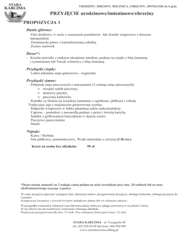 URODZINY, IMIENINY, ROCZNICA, CHRZCINY, SPOTKANIE do 6 godz. PRZYJĘCIE urodzinowe/imieninowe/chrzciny PROPOZYCJA 1 Danie główne: Filet drobiowy w sosie z suszonych pomidorów lub Zraziki wieprzowe z farszem staropolskim Ziemniaczki puree z karmelizowaną cebulką Zestaw surówek Deser*: - Kruche pierożki z makiem skropione miodem, podane na ciepło z bitą śmietaną i cynamonem lub Torcik wiśniowy z bitą śmietaną Przekąski ciepłe: Lekko pikantna zupa gulaszowa - węgierska Przekąski zimne: Półmisek mięs pieczystych z marynatami (3 rodzaje mięs pieczonych): • swojski schab pieczony, • domowy pasztet, • pieczona karkówka Roladki ze śledzia na wiejskiej śmietanie z ogórkiem, jabłkiem i cebulą Tradycyjne jaja z majonezem garnirowane szynką Pulpeciki wieprzowe w lekko pikantnej salsie meksykańskiej Caprese – pomidory z mozarellą podane z pesto i świeżą bazylią Sałatka z grillowanym kurczakiem w duecie sosów Pieczywo jasne/ciemne Masło Napoje: Kawa / Herbata Sok jabłkowy, pomarańczowy, Woda mineralna z cytryną (1 lit./os.) Koszt na osobę bez alkoholu: 99 zł *Deser można zamienić na 2 rodzaje ciasta podane na stole szwedzkim przy min. 20 osobach lub na torta okolicznościowego (naszego wypieku). W cenie przyjęcia ujęte jest wynajęcie Sali, dekoracja stołów, przygotowanie przyjęcia, obsługa kelnerska, obsługa przyjęcia do 6 godzin. Kompozycje kwiatowe z żywych kwiatów dodatkowo płatne lub we własnym zakresie. W przypadku wniesienia własnych ciast lub tortu należy doliczyć usługę serwisową w wysokości 2zł/os. W tej ofercie nie ma możliwości wniesienia własnego alkoholu. Propozycja przygotowana dla min. 15 osób. Przy mniejszej ilości gości koszt +(2-6)zł STARA KARCZMA ul. Traugutta 48 tel. (55) 235-05-05 lub kom. 668-504-999 www.starakarczma.elblag.pl URODZINY, IMIENINY, ROCZNICA, CHRZCINY, SPOTKANIE do 6 godz. PROPOZYCJA 2 Zupa: Krem z pomidorów z lanymi kluseczkami lub Żur staropolski z jajkiem Danie główne: Roladka drobiowa faszerowana warzywami podana na sosie porowym z opiekanymi ziemniakami i zestawem surówek lub Karczek wieprzowy na aromatycznym sosem kminkowym z puree marchewkowym i sałatką Colesław Deser*: - Włoskie Tiramisu na bazie naturalnego biszkoptu, mascarpone i odrobiny alkoholu Przekąska ciepła: Barszcz czerwony z kołdunami lub Grillowane szaszłyki drobiowe z bekonem i warzywami Przekąski zimne: Półmisek swojskich wędlin z marynatami: • swojski schab lub szynka • karkówka wędzona • swojskie kiełbasy i boczek Łosoś marynowany w ginie z orientalnymi sosami Rolada z boczku świeżego z grzybami leśnymi Schab opiekany w kminku z nadzieniem śliwkowym lub Śledzie po cygańsku Sałatka z rucolą, szynką parmeńską i brzoskwiniami lub Sałatka z polędwiczką na kompozycji sałat Sałatka grecka z fetą i oliwkami na lodowej sałacie Pieczywo jasne/ciemne Masło Napoje: Kawa / Herbata Sok jabłkowy, pomarańczowy, Coca-Cola, Woda mineralna z cytryną (1,2 lit./os.) Koszt na osobę bez alkoholu: 107 zł *Deser można zamienić na 2 rodzaje ciasta podane na stole szwedzkim przy min. 20 osobach lub na torta okolicznościowego (naszego wypieku). W cenie przyjęcia ujęte jest wynajęcie Sali, dekoracja stołów, przygotowanie przyjęcia, obsługa kelnerska, obsługa przyjęcia do 6 godzin. Kompozycje kwiatowe z żywych kwiatów dodatkowo płatne lub we własnym zakresie. W przypadku wniesienia własnych ciast lub tortu należy doliczyć usługę serwisową w wysokości 2zł/os. W przypadku wniesienia własnego alkoholu należy doliczyć usługę serwisową w wysokości: 6zł/os. - 1 rodz. alkoholu, 8zł/os. – whisky, 10zł/os. – kilka rodz. alkoholu. Propozycja przygotowana dla min. 15 osób. Przy mniejszej ilości gości koszt +(2-6)zł STARA KARCZMA ul. Traugutta 48 tel. (55) 235-05-05 lub kom. 668-504-999 www.starakarczma.elblag.pl URODZINY, IMIENINY, ROCZNICA, CHRZCINY, SPOTKANIE do 6 godz. PROPOZYCJA 3 Zupa: - Rosół z wiejskiej kury z domowym makaronem Danie główne: Kotlet drobiowy Cordon nadziewany serem i szynką z ziemniakami opiekanymi oraz bukietem sałat lub Kieszeń ze schabu z pieczarkowym nadzieniem aromatyzowana białym winem z sosem leśnym z puree ziemniaczanym i duetem surówek Deser*: - Domowa szarlotka na ciepło podana z lodami waniliowymi i bitą śmietaną Przekąski ciepłe: - Smażone wiejskie pierogi z ziemniakami i boczkiem okraszone cebulką lub Żur staropolski podany z jajkiem i białą kiełbasą – proszę wybrać Przekąski zimne: Półmisek mięs pieczystych z marynatami (3 rodzaje mięs pieczonych): • roladka z kurczaka nadziewana czerwoną papryką i omletem z Rusollion • swojski boczek pieczony lub schab ze śliwką • pieczeń rzymska Tymbaliki drobiowe ze złocistą kukurydzą lub Domowy smalec z ogórkiem kiszonym Tradycyjny śledź w oleju z cebulką Mini tartinki z tatara wołowego z ogórkiem, cebulką i marynowaną pieczarką Caprese – pomidory z mozarellą podane z pesto i świeżą bazylią Sałatka jarzynowa garnirowana szynką lub tradycyjnie po polsku Sałatka Cezar z boczkiem, kurczakiem i grzankami Sos czosnkowy Pieczywo ciemne/jasne Masło Napoje i ciasta: Kawa / Herbata Sok jabłkowy, pomarańczowy, Coca-Cola, Woda mineralna z cytryną (1,2 lit./os.) Cista domowego wypieku (na stole szwedzkim): • ciasto z karmelowym słonecznikiem lub wiśniowe z bitą śmietana • domowa szarlotka oprószona cukrem Koszt na osobę: 115 zł *Deser można zamienić na tort okolicznościowy (naszego wypieku). W cenie przyjęcia ujęte jest wynajęcie Sali, dekoracja stołów, przygotowanie przyjęcia, obsługa kelnerska, obsługa przyjęcia do 6 godzin. Kompozycje kwiatowe z żywych kwiatów dodatkowo płatne lub we własnym zakresie. W przypadku wniesienia własnego alkoholu należy doliczyć usługę serwisową w wysokości: 6zł/os. - 1 rodz. alkoholu (wódka czysta lub wino), 8zł/os. – 1 rodz. alkoholu (whisky, gin), 10zł/os.