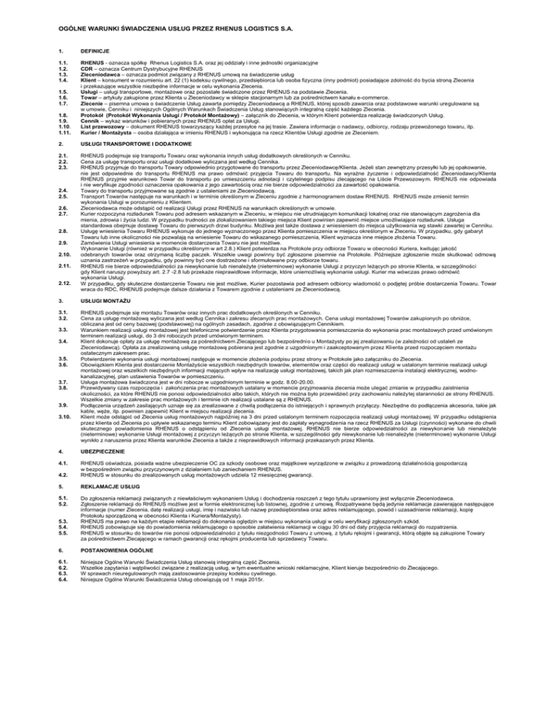 OGÓLNE WARUNKI ŚWIADCZENIA USŁUG PRZEZ RHENUS LOGISTICS S.A. 1. DEFINICJE 1.1. 1.2. 1.3. 1.4. 1.8. 1.9. 1.10. 1.11. RHENUS - oznacza spółkę Rhenus Logistics S.A. oraz jej oddziały i inne jednostki organizacyjne CDR – oznacza Centrum Dystrybucyjne RHENUS Zleceniodawca – oznacza podmiot związany z RHENUS umową na świadczenie usług Klient – konsument w rozumieniu art. 22 (1) kodeksu cywilnego, przedsiębiorca lub osoba fizyczna (inny podmiot) posiadające zdolność do bycia stroną Zlecenia i przekazujące wszystkie niezbędne informacje w celu wykonania Zlecenia. Usługi – usługi transportowe, montażowe oraz pozostałe świadczone przez RHENUS na podstawie Zlecenia. Towar – artykuły zakupione przez Klienta u Zleceniodawcy w sklepie stacjonarnym lub za pośrednictwem kanału e-commerce. Zlecenie – pisemna umowa o świadczenie Usług zawarta pomiędzy Zleceniodawcą a RHENUS, której sposób zawarcia oraz podstawowe warunki uregulowane są w umowie, Cenniku i niniejszych Ogólnych Warunkach Świadczenia Usług stanowiących integralną część każdego Zlecenia. Protokół (Protokół Wykonania Usługi / Protokół Montażowy) – załącznik do Zlecenia, w którym Klient potwierdza realizację świadczonych Usług. Cennik – wykaz warunków i pobieranych przez RHENUS opłat za Usługi. List przewozowy – dokument RHENUS towarzyszący każdej przesyłce na jej trasie. Zawiera informacje o nadawcy, odbiorcy, rodzaju przewożonego towaru, itp. Kurier / Montażysta – osoba działająca w imieniu RHENUS i wykonująca na rzecz Klientów Usługi zgodnie ze Zleceniem. 2. USŁUGI TRANSPORTOWE I DODATKOWE 2.1. 2.2. 2.3. RHENUS podejmuje się transportu Towaru oraz wykonania innych usług dodatkowych określonych w Cenniku. Cena za usługę transportu oraz usługi dodatkowe wyliczana jest według Cennika. RHENUS przyjmuje do transportu Towary odpowiednio przygotowane do transportu przez Zleceniodawcę/Klienta. Jeżeli stan zewnętrzny przesyłki lub jej opakowanie, nie jest odpowiednie do transportu RHENUS ma prawo odmówić przyjęcia Towaru do transportu. Na wyraźne życzenie i odpowiedzialność Zleceniodawcy/Klienta RHENUS przyjmie warunkowo Towar do transportu po umieszczeniu adnotacji i czytelnego podpisu zlecającego na Liście Przewozowy m. RHENUS nie odpowiada i nie weryfikuje zgodności oznaczenia opakowania z jego zawartością oraz nie bierze odpowiedzialności za zawartość opakowania. Towary do transportu przyjmowane są zgodnie z ustaleniami ze Zleceniodawcą. Transport Towarów następuje na warunkach i w terminie określonym w Zleceniu zgodnie z harmonogramem dostaw RHENUS. RHENUS może zmienić termin wykonania Usługi w porozumieniu z Klientem. Zleceniodawca może odstąpić od realizacji Usługi przez RHENUS na warunkach określonych w umowie. Kurier rozpoczyna rozładunek Towaru pod adresem wskazanym w Zleceniu, w miejscu nie utrudniającym komunikacji lokalnej oraz nie stanowiącym zagrożenia dla mienia, zdrowia i życia ludzi. W przypadku trudności ze zlokalizowaniem takiego miejsca Klient powinien zapewnić miejsce umożliwiające rozładunek. Usługa standardowa obejmuje dostawę Towaru do pierwszych drzwi budynku. Możliwa jest także dostawa z wniesieniem do miejsca użytkowania wg stawki zawartej w Cenniku. Usługę wniesienia Towaru RHENUS wykonuje do jednego wyznaczonego przez Klienta pomieszczenia w miejscu określonym w Zleceniu. W przypadku, gdy gabaryt Towaru lub inne okoliczności nie pozwalają na wniesienie Towaru do wskazanego pomieszczenia, Klient wyznacza inne miejsce złożenia Towaru. Zamówienia Usługi wniesienia w momencie dostarczenia Towaru nie jest możliwe. Wykonanie Usługi (również w przypadku określonym w art 2.8.) Klient potwierdza na Protokole przy odbiorze Towaru w obecności Kuriera, kwitując jakość odebranych towarów oraz otrzymaną liczbę paczek. Wszelkie uwagi powinny być zgłoszone pisemnie na Protokole. Późniejsze zgłoszenie może skutkować odmową uznania zastrzeżeń w przypadku, gdy powinny być one dostrzeżone i sformułowane przy odbiorze towaru. RHENUS nie bierze odpowiedzialności za niewykonanie lub nienależyte (nieterminowe) wykonanie Usługi z przyczyn leżących po stronie Klienta, w szczególności gdy Klient naruszy powyższy art. 2.7 -2.8 lub przekaże nieprawidłowe informacje, które uniemożliwią wykonanie usługi. Kurier ma wówczas prawo odmówić wykonania Usługi. W przypadku, gdy skuteczne dostarczenie Towaru nie jest możliwe, Kurier pozostawia pod adresem odbiorcy wiadomość o podjętej próbie dostarczenia Towaru. Towar wraca do RDC, RHENUS podejmuje dalsze działania z Towarem zgodnie z ustaleniami ze Zleceniodawcą. 1.5. 1.6. 1.7. 2.4. 2.5. 2.6. 2.7. 2.8. 2.9. 2.10. 2.11. 2.12. 3. USŁUGI MONTAŻU 3.1. 3.2. RHENUS podejmuje się montażu Towarów oraz innych prac dodatkowych określonych w Cenniku. Cena za usługę montażową wyliczana jest według Cennika i zakresu zlecanych prac montażowych. Cena usługi montażowej Towarów zakupionych po obniżce, obliczana jest od ceny bazowej (podstawowej) na ogólnych zasadach, zgodnie z obowiązującym Cennikiem. Warunkiem realizacji usługi montażowej jest telefoniczne potwierdzenie przez Klienta przygotowania pomieszczenia do wykonania prac montażowych przed umówionym terminem realizacji usługi, do 3 dni roboczych przed umówionym terminem. Klient dokonuje opłaty za usługę montażową za pośrednictwem Zlecającego lub bezpośrednio u Montażysty po jej zrealizowaniu (w zależności od ustaleń ze Zleceniodawcą). Opłata za zrealizowaną usługę montażową pobierana jest zgodnie z uzgodnionym i zaakceptowanym przez Klienta przed rozpoczęciem montażu ostatecznym zakresem prac. Potwierdzenie wykonania usługi montażowej następuje w momencie złożenia podpisu przez strony w Protokole jako załączniku do Zlecenia. Obowiązkiem Klienta jest dostarczenie Montażyście wszystkich niezbędnych towarów, elemen