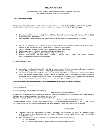 REGULAMIN KONKURSU organizowanego przez Fundację Promocji Muzyki i Terapii Green we Wrocławiu pod nazwą „Wciąga Nas Twórczość. Narkotyki Nie”. I. POSTANOWIENIA OGÓLNE §1 Niniejszy regulamin [„Regulamin”] określa warunki, na jakich odbywa się konkurs „Wciąga Nas Twórczość. Narkotyki Nie”. [„Konkurs”] organizowany jest w ramach programu profilaktyki uzależnień „Twórczy Nie - Zależni” w 2012 r. §2 1. 2. Organizatorem Konkursu jest Fundacja Promocji Muzyki i Terapii Green z siedzibą we Wrocławiu, ul. Krucza 126/5, 53-406 Wrocław [„Organizator”]. Za prawidłowy przebieg konkursu oraz realizację poszczególnych jego etapów odpowiada Organizator. §3 1. 2. 3. 4. 5. Konkurs jest organizowany na terytorium Rzeczypospolitej Polskiej za pośrednictwem fanpage’a „Twórczy Nie Zależni” na portalu Facebook (http://www.facebook.com/tworczyniezalezni). Konkurs trwa od 5 listopada br. (godz. 23:59) do 20 listopada br. (godz. 23:59). Zgłoszenia przesłane na Konkurs muszą spełniać wymogi Regulaminu. Na Konkurs można się zgłaszać tylko i wyłącznie drogą internetową. Konkurs przeznaczony jest dla fanów fanpage’a „Twórczy Nie - Zależni” na portalu Facebook (http://www.facebook.com/tworczyniezalezni). II. UCZESTNICY KONKURSU §4 1. 2. Uczestnikiem Konkursu [„Uczestnik”] może być pełnoletnia osoba fizyczna posiadająca obywatelstwo polskie, miejsce stałego zamieszkania w Polsce oraz pełną zdolność do czynności prawnych. Uczestnikiem Konkursu [„Uczestnik”] może być posiadająca obywatelstwo polskie osoba niepełnoletnia, której rodzic lub opiekun prawny wyraził zgodę na udział w Konkursie poprzez podpisanie poniższego formularza. Formularz będzie dostępny również na stronie internetowej na http://www.tworczyniezalezni.pl. Wypełniony formularz zgody należy załączyć do zgłoszenia konkursowego w postaci zdjęcia lub skanu. Zgoda przedstawiciela ustawowego dziecka, które nie ukończyło 18 roku życia, na udział w konkursie ................................................................. (miejscowość, data) Ja niżej podpisany/a, jako przedstawiciel ustawowy……………………………………………………………………...…...., (imię i nazwisko uczestnika konkursu) po zapoznaniu się z Regulaminem konkursu „Wciąga Nas Twórczość. Narkotyki Nie.” niniejszym wyrażam zgodę na udział dziecka w ww. konkursie na zasadach określonych w regulaminie. Wyrażam niniejszym zgodę na umieszczenie danych osobowych:………………………………….................................... (imię i nazwisko uczestnika konkursu) i przetwarzanie ich, zgodnie z ustawą z dnia 29 sierpnia 1997 r. o ochronie danych osobowych (Dz. U. z 2002 r. Nr 101, poz. 926, z późn. zm.) w celu przeprowadzenia konkursu oraz dalszego wykorzystania prac nadesłanych na konkurs. ………………………………………………………. Czytelny podpis 3. 4. Uczestnikami Konkursu nie mogą być pracownicy Organizatora i/lub Darczyńcy, jak również osoby współpracujące z Organizatorem i/lub Darczyńcą oraz członkowie najbliższej rodziny wyżej wymienionych pracowników i współpracowników. Aby wziąć udział w Konkursie wymagane jest przesłanie danych Uczestnika konkursu: a) imię i nazwisko b) adres zamieszkania (ulica, nr domu, nr mieszkania, kod pocztowy, miasto) 1 c) d) telefon kontaktowy do Uczestnika konkursu (telefon stacjonarny wraz z nr kierunkowym lub telefon komórkowy) data urodzenia III. ZASADY KONKURSU I JEGO PRZEBIEG §5 1. 2. 3. 4. 5. 6. Warunkiem wzięcia udziału w Konkursie jest wykonanie zadania składającego się na Konkurs („Zadanie konkursowe”) oraz bycie fanem fanpage’a „Twórczy Nie - Zależni” na portalu Facebook. Do Konkursu można przystąpić od 5 listopada br. (godz. 23:59) do dnia 20 listopada (godz. 23:59). Zadanie konkursowe polega na przesłaniu pracy konkursowej prezentującej pasje Uczestników Konkursu w poszczególnych kategoriach: a) śpiew: plik MP3, AVI, MPG, WMV do 3 minut, o rozmiarze do 15 MB; b) gra na instrumencie: plik MP3, AVI, MPG lub WMV do 3 minut, o rozmiarze do 15 MB; c) rysunek: plik graficzny (skan lub zdjęcie pracy) w formacie JPG lub PNG, o rozmiarze do 10 MB; d) obraz: zdjęcie pracy w formacie JPG lub PNG, o rozmiarze do 10 MB; e) fotografia: plik w formacie JPG lub PNG, o rozmiarze do 10 MB; f) film: plik AVI, MPG lub WMV do 3 minut o rozmiarze do 15 MB; g) grafika komputerowa: plik w formacie JPG lub PNG, o rozmiarze do 10 MB; Warunkiem wzięcia udziału w Konkursie jest przesłanie zgłoszenia konkursowego zawierającego dane osobowe Uczestnika wraz z pracą konkursową na adres e-mail: [email protected]. Uczestnik może przesłać na konkurs tylko jedno zgłoszenie, zawierające jedną pracę dotyczącą jednej kategorii konkursowej. Każdy Uczestnik może być nagrodzony w Konkursie tylko raz. Nagroda zostaje przyznana 7 Uczestnikom, którzy spełnią wymagania regulaminu. Zgłoszenie konkursowe przesłane przez Uczestnika na adres e-mail [email protected] musi być zgodne z postanowieniami § 4 pkt. 4. IV. PULA NAGRÓD §6 1. 2. 3. Nagrodami w Konkursie są: a) Mikrofon Dynamiczny SHURE w kategorii śpiew; b) cyfrowy Tuner/Metronom KORG w kategorii gra na instrumencie; c) Komplet Kredek Akwarelowych DERWENT w kategorii rysunek; d) Komplet Farb Akrylowych firmy Winsor&Newton w kategorii obraz; e) 3 x Pendrive 32 GB USB 3.0 w kategoriach: fotografia, film oraz grafika komputerowa. Fundatorem nagród jest Fundacja Polska Miedź [Darczyńca]. Nagrody przekaże zwycięzcy Organizator. Nagrody otrzymane w Konkursie korzystają ze zwolnienia przedmiotowego od podatku dochodowego od osób fizycznych. V. ROZSTRZYGNIĘCIE KONKURSU I WYDANIE NAGRÓD §7 1. 2. 3. 4. 5. 6. Nad prawidłowością przebiegu Konkursu przy zachowaniu należytej staranności będzie czuwać trzyosobowa Komisja konkursowa, złożona z przedstawicieli 