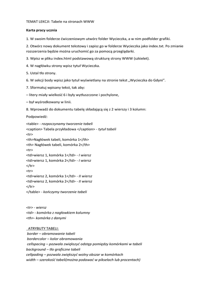 TEMAT LEKCJI: Tabele na stronach WWW Karta pracy ucznia 1. W