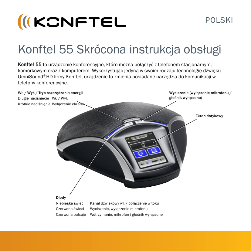 POLSKI Konftel 55 Skrócona instrukcja obsługi Konftel 55 to urządzenie konferencyjne, które można połączyć z telefonem stacjonarnym, komórkowym oraz z komputerem. Wykorzystując jedyną w swoim rodzaju technologię dźwięku OmniSound® HD firmy Konftel, urządzenie to zmienia posiadane narzędzia do komunikacji w telefony konferencyjne. Wł. / Wył. / Tryb oszczędzania energii Długie naciśnięcie Wł. / Wył. Krótkie naciśnięcie Wyłączenie ekranu Wyciszenie (wyłączenie mikrofonu / głośnik wyłączone) Ekran dotykowy Diody Niebieska świeci Kanał dźwiękowy wł. / połączenie w toku Czerwona świeci Wyciszenie, wyłączenie mikrofonu Czerwona pulsuje Wstrzymanie, mikrofon i głośnik wyłączone OPIS Konftel 55 automatycznie wykrywa podłączone urządzenia. Po podłączeniu telefonu komórkowego, na ekranie zostanie wyświetlony przycisk aktywacji strumienia audio z telefonu. Po włożeniu karty SD zostanie wyświetlony przycisk rejestrowania na karcie. Podświetlony przycisk wskazuje, że funkcja jest aktywna. Naciśnięcie przycisku włącza ją lub wyłącza. Urządzenie Konftel 55 oferuje szereg opcji połączeń, a jednocześnie jest bardzo proste w obsłudze. Wyświetlane są tylko te funkcje, które mogą zostać użyte w danej chwili. Więcej informacji na temat wszystkich funkcji urządzenia Konftel 55 zawiera instrukcja w formacie PDF, dostępna na stronie www.konftel.com. Pokrywa baterii Gniazda: Telefon stacjonarny (adapter) Zasilanie Przykładowy ekran. Podłączony telefon Zestaw słuchawkowy (3,5 mm) komórkowy i zestaw słuchawkowy, a także podłączony i aktywny Komputer (mini-USB) komputer. Telefon komórkowy Gniazdo na kartę pamięci SD Można rejestrować realizowane połączenia i wykorzystywać telefon Konftel 55 jako dyktafon. Włóż kartę SD i naciśnij przycisk rejestrowania, aby rozpocząć rejestrowanie. Nagrania są dostępne w menu. TELEFON BESKRIVELSE STACJONARNY • TILKOBLING TELEFON • LINJEVELGEREN KOMÓRKOWY Połączenie z telefonem stacjonarnym Podłącz telefon do przystawki Konftel 55 za pomocą adaptera telefonu (opcja). Na urządzeniu Konftel 55 zostanie wyświetlony przycisk . Połączenie kablowe z telefonem komórkowym Podłącz telefon komórkowy do urządzenia Konftel 55. (Potrzebny jest dodatkowy kabel do telefonu). Na urządzeniu Konftel 55 zostanie wyświetlony przycisk . Wykonaj połączenie próbne, aby sprawdzić, czy głośność po stronie rozmówcy jest na dobrym poziomie. Aby uzyskać optymalną wydajność Odłącz kabel słuchawki telefonicznej od telefonu i podłącz go do adaptera telefonu zgodnie z rysunkiem powyżej. używanego telefonu, można wyregulować głośność mikrofonu urządzenia Konftel 55 (patrz instrukcja). Pamiętaj, że nie można w tym samym czasie używać telefonu stacjonarnego i telefonu komórkowego z przystawką Konftel 55. Po podłączeniu telefonu komórkowego, złącze telefonu stacjonarnego zostaje wyłączone. Wykonaj połączenie próbne, aby sprawdzić, czy głośność po stronie rozmówcy jest na dobrym poziomie. Aby uzyskać optymalną wydajność używanego telefonu, można wyregulować głośność mikrofonu urządzenia Konftel 55 (patrz instrukcja). Nawiązywanie połączeń Nawiązywanie połączeń Naciśnij na urządzeniu Konftel 55, aby przesyłać do niego dźwięk z telefonu. Przycisk i diody będą świecić na niebiesko. Podnieś słuchawkę i nawiąż połączenie za pomocą telefonu stacjonarnego. Naciskaj przycisk , aby przesyłać dźwięk do i ze słuchawki telefonu stacjonarnego. Naciśnij przycisk na urządzeniu Konftel 55, aby przesyłać do niego dźwięk z telefonu komórkowego. Przycisk i diody będą świecić na niebiesko. Nawiąż połączenie za pomocą telefonu komórkowego. Naciskaj przycisk , aby przesyłać dźwięk do i z telefonu komórkowego. Połączenie z komputerem Podłącz komputer do urządzenia Konftel 55 otrzymanym kablem USB. Na urządzeniu Konftel 55 zostanie wyświetlony przycisk . W zależności od systemu operacyjnego komputera, może być konieczna zmiana ustawień, aby urządzenie Konftel 55 USB Audio mogło być używane jako urządzenie audio. Konftel 55 może być ładowany i zasilany przez USB pod warunkiem włożenia baterii. Nie trzeba podłączać zasilacza. Używanie urządzenia Konftel z komputerem Naciśnij przycisk na urządzeniu Konftel 55, aby włączyć na nim odtwarzanie dźwięku z komputera. Przycisk będzie świecić na niebiesko, a w urządzeniu Konftel 55 będzie słychać dźwięk z komputera. Przełącz połączenie do komputera, używając np. oprogramowania do konferencji internetowych lub programu Skype ®. Połączenia można mostkować przez podłączony telefon ( lub ) i komputer , naciskając obydwa przyciski na urządzeniu Konftel 55. www.konftel.com 110181-61-001 Rev. 2A KOMPUTER