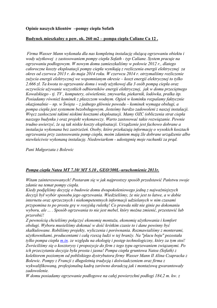 Opinie naszych klientów –pompy ciepła Sofath Budynek mieszkalny o pow. ok. 260 m2 – pompa ciepła Caliane Ca 12 . Firma Wasser Mann wykonała dla nas kompletną instalację służącą ogrzewaniu obiektu i wody użytkowej z zastosowaniem pompy ciepła Sofath - typ Caliane. System pracuje na ogrzewaniu podłogowym. W nowym domu zamieszkaliśmy w połowie 2012 r., dlatego całoroczne koszty eksploatacji pompy ciepła wynikają z rozliczenia energii elektrycznej za okres od czerwca 2013 r. do maja 2014 roku. W czerwcu 2014 r. otrzymaliśmy rozliczenie zużycia energii elektrycznej we wspomnianym okresie – koszt energii elektrycznej to tylko 2.666 zł. Ta kwota to ogrzewanie domu i wody użytkowej dla 3 osób pompą ciepła oraz oczywiście używanie wszystkich odbiorników energii elektrycznej, jak w domu przeciętnego Kowalskiego - tj. TV , komputery, oświetlenie, zmywarka, piekarnik, lodówka, pralka itp. Posiadamy również kominek z płaszczem wodnym. Ogień w kominku rozpalamy faktycznie okazjonalnie – np. w Święta – z jednego głównie powodu – kominek wymaga obsługi, a pompa ciepła jest systemem bezobsługowym. Jesteśmy bardzo zadowoleni z naszej instalacji. Wręcz zaskoczeni takimi niskimi kosztami eksploatacji. Mamy OZC (obliczenia strat ciepła naszego budynku ) oraz projekt wykonawczy. Warto zastosować takie rozwiązanie. Pewnie trudno uwierzyć, że są tak niskie koszty eksploatacji. Urządzenie jest fachowo dobrane a instalacja wykonana bez zastrzeżeń. Osoby, które przekazują informację o wysokich kosztach ogrzewania przy zastosowaniu pomp ciepła, moim zdaniem mają źle dobrane urządzenie albo niewłaściwie wykonaną instalację. Niedowiarkom - udostępnię moje rachunki za prąd. Pani Małgorzata z Bolewic Pompa ciepła Natea MT 7.10/ MT 5.10 , GEO/300L–uruchomienie 2011r. Witam zainteresowanych! Postaram się w jak najprostszy sposób przedstawić Państwu swoje zdanie na temat pompy ciepła. Kiedy podjęliśmy decyzję o budowie domu dwupokoleniowego jedną z najważniejszych decyzji był wybór sposobu jego ogrzewania. Wiedzieliśmy, że nie jest to łatwe, a w dobie internetu oraz sprzecznych i niekompetentnych informacji udzielanych w nim czasami przypomina to po prostu grę w rosyjską ruletkę! Co prawda nikt nie ginie po dokonaniu wyboru, ale ... . Sposób ogrzewania to nie jest mebel, który można zmienić, przestawić lub przerobić! Z pewnością chcieliśmy połączyć ekonomię montażu, ekonomię użytkowania i komfort obsługi. Wyboru musieliśmy dokonać w dość krótkim czasie to i dane powinny być skalkulowane. Robiliśmy projekty, wyliczenia i porównania. Rozmawialiśmy z monterami, użytkownikami, producentami i całą rzeszą ludzi w tej branży. Na "placu boju" pozostała tylko pompa ciepła m.in. ze względu na ekologię i postęp technologiczny, który za tym stoi! Zwróciliśmy się o kosztorysy i propozycje do firm z tego typu ogrzewaniem związanymi. Po ich przeczytaniu decyzja była prosta i jasna! Pompa ciepła gruntowa Natea (Sofath) z kolektorem poziomym od pobliskiego dystrybutora firmy Wasser Mann II Alina Czapracka z Bolewic. Pompy z Francji z długoletnią tradycją i doświadczeniem oraz firma z wykwalifikowaną, profesjonalną kadrą zarówno doradczą jak i montażową gwarantowały zadowolenie. W domu posiadamy ogrzewanie podłogowe na całej powierzchni podłogi 184,2 m. kw. z podziałem na dwa mieszkania i dwie kondygnacje(projekt Amelia II), a w nich łącznie trzy strefy odczytu temperatury. Również ogrzewanie wody jest niezależną pompą ciepła ze zbiornikiem 300l. Moc całkowita instalacji to 13kW. To jest jedno ze źródeł ciepła w naszym domu, a dodatkowym jest kominek z rozprowadzeniem ciepła turbiną na prąd. Od października do lutego 2012 średni miesięczny rachunek za ogrzewanie wyniósł ok. 300-400 zł. tj. na dwa mieszkania (projekt Amelia II). Dodać należy, że jest to pierwsza zima, a dopiero jesienią założyliśmy ocieplenie na zewnątrz. Jesteśmy świadomi, że pierwszy sezon grzewczy jest wyższy o ok. 20-40 % kosztów za ogrzewanie, ze względu na to, iż dom jest w fazie wygrzewania. Wracając do wykonawców to wykonali całą pracę tj. podłogówka (położenie i zabezpieczenia), kolektory w gruncie oraz całą kotłownię itd. Po naszej stronie były koszty wynajmu koparki (ok. 800pln). Proszę Państwa! Największym problemem dla inwestorów podejmujących decyzję jaki sposób ogrzewania domu i wody wybrać jest to czy wybrać tańszy przy zakupie i montażu, a droższy w dalszej eksploatacji czy zdecydować się na droższy zakup, technologię i montaż, a tańsze rachunki co miesiąc za źródło zasilania owego urządzenia! Ciężka decyzja i każdy musi podjąć ją sam. Nas przekonało to, że perspektywa spłaty kredytu będzie długoletnia i nie możemy sobie pozwolić na "dorzucanie" wyższych rachunków do niego! Woleliśmy nie postawić ogrodzenia i zrezygnować z wielu innych jeszcze "estetycznych" elementów wokół domu na rzecz tej właśnie pompy ciepła! Jesteśmy po kilku rachunkach i już nie żałujemy. A jest jeszcze jedna bardzo ważna rzecz przemawiająca za jej zamontowaniem, otóż warto obserwować zmiany w taryfach i kosztach kWh dla ekologicznych sposobów ogrzewania domów! Jest to chyba jeszcze w fazie projektów, ale "na zachodzie" takie rozwiązania są i stanowią (dane z rozmów ze znajomymi) około 1/3 ceny obecnej. Licznik wówczas jest oddzielny na pompę. Rozpisałem się trochę, ale szczerze Państwu polecam ten sposób ogrzewania, a w szczególności skorzystanie z pomocy obiektywnej i profesjonalnej w każdym calu firmy. Dla mnie jest to wspominana już Wasser Mann II Alina Czapracka z Bolewic. Leszek R. Nowy Tomyśl Dom o powierzchni użytkowej 92 m2 Instalacja: Natea MT 7.10 z opcją ciepłej wody użytkowej Moja przygoda z Sofath rozpoczęła się przypadkowo. Odwiedziłem firmę Wasser Mann II przejazdem, gdyż zaint