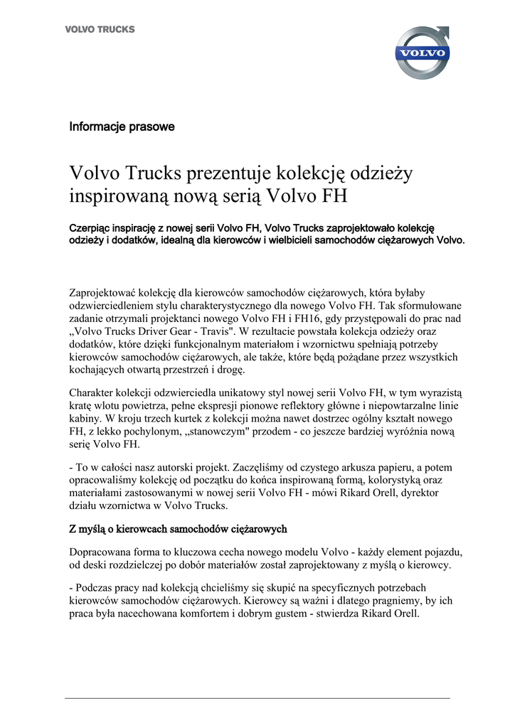 Informacje prasowe Volvo Trucks prezentuje kolekcję odzieży inspirowaną nową serią Volvo FH Czerpiąc inspirację z nowej serii Volvo FH, Volvo Trucks zaprojektowało kolekcję odzieży i dodatków, idealną dla kierowców i wielbicieli samochodów ciężarowych Volvo. Zaprojektować kolekcję dla kierowców samochodów ciężarowych, która byłaby odzwierciedleniem stylu charakterystycznego dla nowego Volvo FH. Tak sformułowane zadanie otrzymali projektanci nowego Volvo FH i FH16, gdy przystępowali do prac nad „Volvo Trucks Driver Gear - Travis". W rezultacie powstała kolekcja odzieży oraz dodatków, które dzięki funkcjonalnym materiałom i wzornictwu spełniają potrzeby kierowców samochodów ciężarowych, ale także, które będą pożądane przez wszystkich kochających otwartą przestrzeń i drogę. Charakter kolekcji odzwierciedla unikatowy styl nowej serii Volvo FH, w tym wyrazistą kratę wlotu powietrza, pełne ekspresji pionowe reflektory główne i niepowtarzalne linie kabiny. W kroju trzech kurtek z kolekcji można nawet dostrzec ogólny kształt nowego FH, z lekko pochylonym, „stanowczym" przodem - co jeszcze bardziej wyróżnia nową serię Volvo FH. - To w całości nasz autorski projekt. Zaczęliśmy od czystego arkusza papieru, a potem opracowaliśmy kolekcję od początku do końca inspirowaną formą, kolorystyką oraz materiałami zastosowanymi w nowej serii Volvo FH - mówi Rikard Orell, dyrektor działu wzornictwa w Volvo Trucks. Z myślą o kierowcach samochodów ciężarowych Dopracowana forma to kluczowa cecha nowego modelu Volvo - każdy element pojazdu, od deski rozdzielczej po dobór materiałów został zaprojektowany z myślą o kierowcy. - Podczas pracy nad kolekcją chcieliśmy się skupić na specyficznych potrzebach kierowców samochodów ciężarowych. Kierowcy są ważni i dlatego pragniemy, by ich praca była nacechowana komfortem i dobrym gustem - stwierdza Rikard Orell. Kolekcja- obejmująca oryginalne kurtki dla kierowców, sportowy zegarek na rękę i swetry z kapturem - trafia w charakterystyczny gust i „luz" kierowców. Poszczególne artykuły zaprojektowano tak, by odpowiadały potrzebom w długiej podróży. Na przykład kurtki: mają średnią długość i łatwo w nich prowadzić pojazd, posiadają dyskretne i gustownie wpasowane elementy odblaskowe, dzięki którym kierowca jest lepiej widoczny, gdy przebywa poza pojazdem, a wielofunkcyjne kieszenie i rękawy kurtek nie utrudniają ruchów. Różne elementy kolekcji nawiązują do różnych aspektów stylistycznych nowego Volvo FH. Weźmy na przykład jeden z kluczowych artykułów w zestawie: sportowy zegarek dla kierowcy. Jego wskazówki i symbole na tarczy naśladują wizualny styl wskaźników na desce rozdzielczej nowej serii FH, co czyni go naprawdę niepowtarzalnym. Oprócz artykułów odzieżowych dla kierowcy, kolekcja zawiera elementy, takie jak modele nowego Volvo FH i Volvo FH16 w różnej skali, komplety bielizny pościelowej oraz produkty adresowane do dzieci i innych członków rodzin kierowców. - Stworzyliśmy kolekcję, która jest tak unikatowa, jak unikatowa jest nowa seria Volvo FH. Kolekcję, którą kierowcy i miłośnicy samochodów ciężarowych mogą nosić z dumą - mówi Åsa Theleen, menedżer ds. materiałów reklamowych w Volvo Trucks. Zapoznaj się z kolekcją Volvo Trucks Driver Gear - Travis: www.volvotrucks.com/Travis Otwarcie sklepu internetowego Kierowcy samochodów ciężarowych Volvo i wszyscy wielbiciele marki Volvo będą mogli kupować artykuły z nowej kolekcji bezpośrednio w sklepie internetowym Volvo Trucks, który niedługo będzie dostępny pod adresem http://www.store.volvotrucks.com/. Początkowo kolekcja będzie dostępna na wybranych rynkach w Europie. Sprzedaż będzie prowadzona również podczas wystawy IAA w Hanowerze, w Niemczech, w dniach 2027 września br. 18 września 2012 r. Bezpośrednie łącze do zdjęć: http://images.volvotrucks.com/latelogin.jspx?records=Volvo+Trucks:20196,Volvo+Truc ks:20197,volvo+trucks:20198,volvo+trucks:20199,volvo+trucks:20412 W celu uzyskania dodatkowych informacji, prosimy o kontakt z: Marie Vassiliadis, Media Relations Volvo Trucks, tel.: +46 31 322 41 27, e-mail: [email protected] Renata Stefańska, PR Region CEE, tel.: +48 22 383 45 59, e-mail: [email protected] Aby obejrzeć film wideo, odwiedź stronę http: //www.thenewsmarket.com/volvogroup. Możesz obejrzeć lub zamówić materiały wideo w formacie MPEG2 lub na kasecie Beta SP. Rejestracja i materiały wideo są bezpłatne dla przedstawicieli mediów. Zdjęcia są dostępne w banku zdjęć Volvo Trucks pod adresem: http://imagegallery.vtc.volvo.se Koncern Volvo Trucks oferuje kompletne rozwiązania transportowe dla profesjonalistów. Oferta obejmuje kompletną gamę samochodów ciężarowych o dużej ładowności, a także profesjonalną sieć 3000 punktów serwisowych w ponad 140 krajach. Koncern Volvo Trucks jest częścią Grupy Volvo, jednego z czołowych światowych producentów samochodów ciężarowych, autobusów, maszyn budowlanych, morskich i stacjonarnych układów napędowych, oraz podzespołów i usług dla branży lotniczej. Grupa Volvo dostarcza również kompletne rozwiązania finansowe i serwisowe.