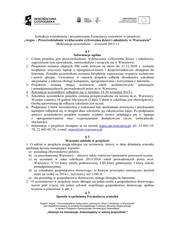 Instrukcja wypełniania i przyjmowania Formularzy wniosków w projekcie „Argos – Przeciwdziałanie wykluczeniu cyfrowemu dzieci i młodzieży w Warszawie” (Rekrutacja uczestników – wrzesień 2015 r.) 1. 2. 3. 4. 5. 6. 7. §1 Informacje ogólne Celem projektu jest przeciwdziałanie wykluczeniu cyfrowemu dzieci i młodzieży, zagrożonym tym zjawiskiem, zamieszkałym i uczącym się w Warszawie. Projektem zostanie objętych 200 osób, którym na okres do 31.12.2020 r. zostanie bezpłatnie użyczony laptop z oprogramowaniem i bezprzewodowym dostępem do Internetu. Ponadto uczestnikom zostanie bezpłatnie zapewnione wsparcie techniczne i serwis sprzętu. Uczestnicy w ramach projektu odbędą dwudniowe szkolenia stacjonarne z zakresu obsługi komputera, oprogramowania i korzystania z Internetu. Projektem zostaną objęci uczniowie szkół: podstawowych, gimnazjów i ponadgimnazjalnych, prowadzonych przez m.st. Warszawę. Rekrutacja uczestników odbędzie się w terminie 14-30 września 2015 r. Szkolenia uczestników projektu zostaną przeprowadzone na terenie m.st. Warszawy. Wymiar czasowy 10 godzin lekcyjnych (2 dni). Udział w szkoleniu jest obowiązkowy. Osobą uprawnioną do odbycia szkolenia jest uczeń. Podpisanie Umów uczestnictwa z rodzicami lub opiekunami prawnymi i przekazanie laptopów odbędzie się w drugim dniu szkolenia, po zakończeniu zajęć. Po podpisaniu umowy uczestnikowi projektu zostanie wydany zestaw składający się z: laptopa z oprogramowaniem oraz wyposażeniem dodatkowym (m.in. torba/plecak, słuchawki). Informacje o projekcie dostępne są na stronie argos.um.warszawa.pl, tel. 22 443-1478, 22 443-02-76, e-mail: [email protected]. §2 Warunki udziału w projekcie 1. O udział w projekcie mogą ubiegać się uczniowie, którzy w dniu składania wniosku spełniają łącznie następujące warunki: a) posiadają obywatelstwo polskie. b) są mieszkańcami Warszawy – dotyczy także rodziców/opiekunów prawnych ucznia. c) są uczniami w roku szkolnym 2015/2016 szkół prowadzonych przez m.st. Warszawy: V-VI klasy szkoły podstawowej, I-III klasy gimnazjum, I klasy szkoły ponadgimnazjalnej. d) są członkami gospodarstwa domowego, w którym przeciętny miesięczny dochód netto na osobę za 2014 r., był niższy niż 1340 zł. e) nie posiadają w gospodarstwie domowym, stałego dostępu do Internetu. 2. O uczestnictwo w projekcie może ubiegać się jedna osoba z gospodarstwa domowego, nawet jeśli więcej niż jeden członek wspólnego gospodarstwa domowego spełnia kryteria wymienione w pkt 1. §3 Sposób wypełniania Formularza wniosku Projekt „Argos – Przeciwdziałanie wykluczeniu cyfrowemu dzieci i młodzieży w Warszawie” jest współfinansowany ze środków Europejskiego Funduszu Rozwoju Regionalnego w ramach Programu Operacyjnego Innowacyjna Gospodarka „Dotacje na innowacje. Inwestujemy w waszą przyszłość” 1. Formularz wniosku jest dostępny jedynie w wersji elektronicznej pod adresem wniosek.argos.um.warszawa.pl. 2. Wnioskodawca wypełnia formularz elektronicznie. 3. Jeżeli wnioskodawca nie ma możliwości wypełnienia wniosku elektronicznie, dane wnioskodawcy wprowadza do systemu pracownik szkoły. 4. Nie wszystkie pola wniosku muszą być wypełnione. 5. Pola wymagane (oznaczone gwiazdką w kolorze czerwonym) muszą być wypełnione. 6. Wymagane jest podanie przynajmniej jednego numeru telefonu kontaktowego (kandydata lub wnioskodawcy). Podanie adresów e-mail nie jest wymagane. 7. W polu „Wyniki w nauce” wnioskodawca podaje: a) w przypadku uczniów szkoły podstawowej - średnią arytmetyczną (zaokrągloną do dwóch miejsc po przecinku) wszystkich ocen ze świadectwa ukończenia IV lub V klasy w roku szkolnym 2014/2015; b) w przypadku uczniów gimnazjów – wynik ze sprawdzianu szóstoklasisty: I klasa – wynik z roku szkolnego 2014/2015, II klasa – wynik z roku szkolnego 2013/2014, III klasa – wynik z roku szkolnego 2012/2013; c) w przypadku uczniów I klasy szkoły ponadgimnazjalnej – suma wyników z egzaminu gimnazjalisty w roku szkolnym 2014/2015, przy uwzględnieniu wyniku z języka polskiego, historii i WOS, matematyki, przedmiotów przyrodniczych oraz części podstawowej egzaminu z języka obcego. 8. W uzasadnionych przypadkach, dopuszcza się udział w projekcie ucznia, który z przyczyn niezależnych (np. długotrwała choroba), raz nie otrzymał promocji do następnej klasy. Wówczas szkoła powinna dołączyć do danego Formularza zgłoszeniowego informację (pismo) potwierdzające przyczynę braku promocji ucznia do następnej klasy. §4 Procedura przyjmowania i zatwierdzania wniosków 1. W celu złożenia wniosku, wnioskodawca zgłasza się do szkoły do której kandydat uczęszcza w roku szkolnym 2015/2016, a w przypadku uczniów I klas szkoły ponadgimnazjalnej, do gimnazjum do którego uczęszczał w roku szkolnym 2014/2015: a) jeżeli wnioskodawca wcześniej wypełnił wniosek w systemie, wyznaczony pracownik sprawdza zgodność danych zawartych we wniosku; b) jeżeli wnioskodawca nie wypełnił wcześniej wniosku, wyznaczony pracownik wprowadza dane do systemu i je weryfikuje. 2. Wyznaczony pracownik szkoły na platformie ankiety.edukacja.warszawa.pl, po zalogowaniu na konto szkoły, a następnie wyborze wniosku danego kandydata, weryfikuje dane przedstawione we wniosku: a) dane wnioskodawcy – w oparciu o dokument tożsamości; b) dane kandydata – w oparciu o dane posiadane przez szkołę, w tym średnią ocen ze świadectwa. 3. Po pozytywnej weryfikacji danych, pracownik szkoły zatwierdza wniosek w systemie, drukuje go w celu podpisania przez wnioskodawcę. Projekt „Argos – Przeciwdziałanie wykluczeniu cyfrowemu dzieci i młodzieży w Warszawie” jest współfinansowany ze środków Europejskiego Funduszu Rozwoju Regionalnego w ramach Programu Operacyjnego Innowacyjna Gospodarka „Dotacje na innowacje. Inwestujemy w waszą przyszłość” 4. W chwili zatwierdzenia wniosku, system auto