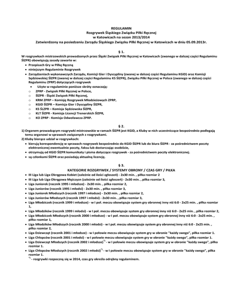 REGULAMIN Rozgrywek Śląskiego Związku Piłki Ręcznej w Katowicach na sezon 2013/2014 Zatwierdzony na posiedzeniu Zarządu Śląskiego Związku Piłki Ręcznej w Katowicach w dniu 05.09.2013r. § 1. W rozgrywkach mistrzowskich prowadzonych przez Śląski Związek Piłki Ręcznej w Katowicach (zwanego w dalszej części Regulaminu ŚlZPR) obowiązują zasady zawarte w: Przepisach Gry w Piłkę Ręczną niniejszym Regulaminie Rozgrywek Zarządzeniach wykonawczych Zarządu, Komisji Gier i Dyscypliny (zwanej w dalszej części Regulaminu KGiD) oraz Komisji Sędziowskiej ŚlZPR (zwanej w dalszej części Regulaminu KS ŚlZPR), Związku Piłki Ręcznej w Polsce (zwanego w dalszej części Regulaminu ZPRP) dotyczących rozgrywek Użyte w regulaminie poniższe skróty oznaczają: o ZPRP - Związek Piłki Ręcznej w Polsce, o ŚlZPR - Śląski Związek Piłki Ręcznej, o KRM ZPRP – Komisję Rozgrywek Młodzieżowych ZPRP, o KGiD ŚlZPR – Komisja Gier i Dyscypliny ŚlZPR, o KS ŚLZPR – Komisja Sędziowska ŚlZPR, o KLT ŚlZPR - Komisja Licencji Trenerskich ŚlZPR, o KO ZPRP - Komisja Odwoławcza ZPRP. § 2. 1) Organem prowadzącym rozgrywki mistrzowskie w ramach ŚlZPR jest KGiD, a Kluby w nich uczestniczące bezpośrednio podlegają temu organowi w sprawach związanych z rozgrywkami. 2) Kluby biorące udział w rozgrywkach: kierują korespondencję w sprawach rozgrywek bezpośrednio do KGiD ŚlZPR lub do biura ŚlZPR - za pośrednictwem poczty elektronicznej ewentualnie poczty, faksu lub dostarczając osobiście, otrzymują od KGiD ŚlZPR komunikaty i pisma dotyczące rozgrywek - za pośrednictwem poczty elektronicznej. są członkami ŚlZPR oraz posiadają aktualną licencję. § 3. KATEGORIE ROZGRYWEK / SYSTEMY OBRONY / CZAS GRY / PIŁKA III Liga lub Liga Okręgowa Kobiet (zależnie od ilości zgłoszeń) - 2x30 min. , piłka rozmiar 2 III Liga lub Liga Okręgowa Mężczyzn (zależnie od ilości zgłoszeń) - 2x30 min. , piłka rozmiar 3, Liga Juniorek (rocznik 1995 i młodsze) - 2x30 min. , piłka rozmiar 2, Liga Juniorów (rocznik 1995 i młodsi) - 2x30 min. , piłka rozmiar 3, Liga Juniorek Młodszych (rocznik 1997 i młodsze) - 2x30 min. , piłka rozmiar 2, Liga Juniorów Młodszych (rocznik 1997 i młodsi) - 2x30 min. , piłka rozmiar 3, Liga Młodziczek (rocznik 1999 i młodsze) - w I poł. meczu obowiązuje system gry obronnej inny niż 6:0 - 2x25 min. , piłka rozmiar 1, Liga Młodzików (rocznik 1999 i młodsi) - w I poł. meczu obowiązuje system gry obronnej inny niż 6:0 - 2x25 min. , piłka rozmiar 2, Liga Młodziczek Młodszych (rocznik 2000 i młodsze) - w I poł. meczu obowiązuje system gry obronnej inny niż 6:0 - 2x25 min. , piłka rozmiar 1, Liga Młodzików Młodszych (rocznik 2000 i młodsi) - w I poł. meczu obowiązuje system gry obronnej inny niż 6:0 - 2x25 min. , piłka rozmiar 2, Liga Dziewcząt (rocznik 2001 i młodsze) - w I połowie meczu obowiązuje system gry w obronie "każdy swego", piłka rozmiar 1. Liga Chłopców (rocznik 2001 i młodsi) - w I połowie meczu obowiązuje system gry w obronie "każdy swego", piłka rozmiar 1. *) Liga Dziewcząt Młodszych (rocznik 2002 i młodsze) - w I połowie meczu obowiązuje system gry w obronie "każdy swego", piłka rozmiar 1. *) Liga Chłopców Młodszych (rocznik 2002 i młodsi) - w I połowie meczu obowiązuje system gry w obronie "każdy swego", piłka rozmiar 1. *) - rozgrywki rozpoczną się w 2014, czas gry określa odrębny regulaminem. § 4. ZASADY FINANSOWANIA UCZESTNICTWA W ROZGRYWKACH 1) Drużyny uczestniczą w rozgrywkach mistrzowskich prowadzonych przez ŚlZPR po dokonaniu zgłoszenia oraz wpłaceniu wpisowego. Wpłata wpisowego następuje po otrzymaniu przez Klub rachunku lub noty wystawionej przez biuro ŚlZPR. Nie wpłacenie wpisowego w wyznaczonym terminie powoduje nieuwzględnienie drużyny w rozgrywkach. 2) Kluby będące gospodarzami meczów, zasadniczo (patrz par. 14) pokrywają wszystkie koszty związane z ich organizacją w miejscu zawodów, w tym koszty delegacji sędziowskich zgodnie z zasadami i wg stawek ustalonych przez Zarząd ŚlZPR. 3) Kluby przyjezdne, zasadniczo (patrz par. 14) pokrywają koszty podróży, a także inne związane z uczestnictwem swojej drużyny w zawodach w charakterze gości. 4) Koszty zawodów, które z przyczyn niezależnych od uczestniczących w nich zespołów: nie doszły do skutku lub zostały przerwane przed rozpoczęciem drugiej połowy (par.10, ust. 10), zostały przerwane w drugiej połowie i nie zostały dokończone w tym samym dniu (par.10 ust. 11 ), są pokrywane po połowie przez zainteresowane Kluby 5) Kluby uiszczają wszelkie opłaty oraz grzywny, z określeniem tytułu wpłaty - gotówką w biurze lub na konto ŚlZPR w Katowicach. § 5. ZGŁOSZENIE OBIEKTÓW SPORTOWYCH DO ROZGRYWEK 1) Spotkania mistrzowskie mogą odbywać się wyłącznie w halach sportowych i na boiskach otwartych zweryfikowanych przez KGiD ŚlZPR. Weryfikację obiektów należy przeprowadzać nie rzadziej niż raz na 2 lata, jeżeli nie został określony inny termin ważności weryfikacji w arkuszu weryfikacyjnym. 2) W przypadku dokonania jakichkolwiek zmian w obiekcie (modernizacji lub remontu), musi być on ponownie zweryfikowany. § 6. SYSTEM ROZGRYWEK 1) Rozgrywki mistrzowskie będą prowadzone systemem dwurundowym każdy z każdym - mecz i rewanż. W przypadku małej ilości zgłoszeń rozgrywki mogą być prowadzone systemem czterorundowym. 2) Rozgrywki mistrzowskie Dziewcząt Młodszych i Chłopców Młodszych, w zależności od ilości zgłoszeń mogą być prowadzone innymi systemami rozgrywek. § 7. ROZGRYWKI BARAŻOWE 1) Zgodnie z Uchwałą nr 54/00 Zarządu ZPRP, wraz z późniejszymi zmianami, w sprawie statusu zawodników – uczniów Szkół Mistrzostwa Sportowego ZPRP Klub posiadający jednego lub więcej zawodników w SMS posiada prawo gry w zawodach barażowych o awans do ćwierćfinałów Mistrzostw Polski Juniorów i Juniorów Młodszych, o ile nie uzy