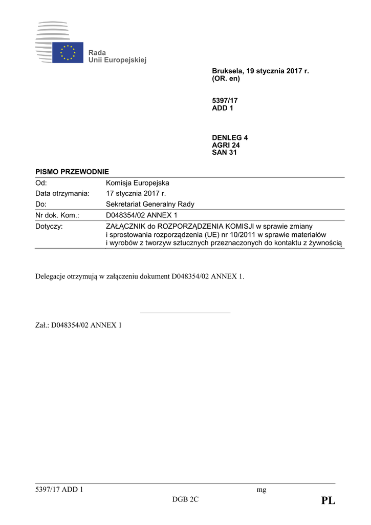 Rada Unii Europejskiej Bruksela, 19 stycznia 2017 r. (OR. en) 5397/17 ADD 1 DENLEG 4 AGRI 24 SAN 31 PISMO PRZEWODNIE Od: Data otrzymania: Do: Komisja Europejska 17 stycznia 2017 r. Sekretariat Generalny Rady Nr dok. Kom.: D048354/02 ANNEX 1 Dotyczy: ZAŁĄCZNIK do ROZPORZĄDZENIA KOMISJI w sprawie zmiany i sprostowania rozporządzenia (UE) nr 10/2011 w sprawie materiałów i wyrobów z tworzyw sztucznych przeznaczonych do kontaktu z żywnością Delegacje otrzymują w załączeniu dokument D048354/02 ANNEX 1. Zał.: D048354/02 ANNEX 1 5397/17 ADD 1 mg DGB 2C PL KOMISJA EUROPEJSKA Bruksela, dnia XXX r. SANTE/11299/2016 ANNEX (POOL/E2/2016/11299/11299-EN ANNEX.doc) D048354/02 […](2016) XXX draft ANNEX 1 ZAŁĄCZNIK do ROZPORZĄDZENIA KOMISJI w sprawie zmiany i sprostowania rozporządzenia (UE) nr 10/2011 w sprawie materiałów i wyrobów z tworzyw sztucznych przeznaczonych do kontaktu z żywnością PL PL ZAŁĄCZNIK W rozporządzeniu (UE) nr 10/2011 wprowadza się następujące zmiany: 1) w załączniku I wprowadza się następujące zmiany: a) „1007 1016 w pkt 1 w tabeli 1 wprowadza się następujące zmiany: (i) w kolumnie 11 w odniesieniu do pozycji dotyczących substancji o numerach substancji FCM: 142, 168, 202, 387, 462, 467, 481, 502, 662 i 779 skreśla się odniesienie do uwagi „(1)”; (ii) dodaje się w porządku numerycznym substancji FCM następujące pozycje: 976-56-7 Fosfonian dietylo[[3,5-bis(1,1dimetyloetylo)-4hydroksyfenylo]met ylu] nie tak nie Do stosowania wyłącznie w ilości nieprzekraczającej 0,2 % w/w na podstawie końcowej masy polimeru w procesie polimeryzacji w celu wyprodukowania poli(tereftalanu etylenu) (PET). Kopolimer (kwasu tak nie nie Do stosowania wyłącznie w ilości nieprzekraczającej: metakrylowego, akrylanu etylu, akrylanu n-butylu, metakrylanu metylu i butadienu) w nanopostaci a) 10 % w/w w nieuplastycznio nym polichlorku winylu (PVC); b) 15 % w/w w nieuplastycznio nym poli(kwasie mlekowym) (PLA). Materiał końcowy stosuje się w temperaturze pokojowej lub niższej. 1030 PL Glinka montmorylonitowa modyfikowana chlorkiem dimetylodialkilo(C1 6-C18)amoniowym tak 2 nie nie Do stosowania wyłącznie w ilości nieprzekraczającej 12 % w/w w poliolefinach w kontakcie z żywnością suchą, której w tabeli 2 załącznika III przyporządkowano płyn modelowy imitujący żywność E, PL w temperaturze pokojowej lub niższej. Suma migracji specyficznej 1chloroheksadekanu i 1-chlorooktadekanu nie może przekraczać 0,05 mg/kg żywności. Może tworzyć płytki w nanopostaci, których tylko jeden z wymiarów nie przekracza 100 nm. te są Płytki zorientowane równolegle do powierzchni polimeru i są całkowicie osadzone w polimerze. 7695-912 58-95-7 1055 1060 Octan α-tokoferolu tak nie nie Do stosowania wyłącznie jako substancja przeciwutleniająca w poliolefinach. Mielone łuski nasion słonecznika tak nie nie Do stosowania wyłącznie w temperaturze pokojowej lub niższej w kontakcie z żywnością, której w tabeli 2 załącznika III przyporządkowano płyn modelowy imitujący żywność E. (24) Łuski nasion są pozyskiwane z nasion słonecznika zdatnych do spożycia przez ludzi. Temperatura obróbki tworzywa sztucznego zawierającego ten dodatek nie przekracza 240 °C. Mieszanina składająca się z 97 % ortokrzemianu (tetra)etylu (TEOS) o numerze CAS 78i 3 % 10-4 heksametylodisilaza nu (HMDS) o numerze CAS 99997-3. 1062 b) PL nie tak nie Do stosowania wyłącznie do produkcji PET w procesie recyklingu i w ilości nieprzekraczającej 0,12 % (w/w).”; w pkt 3 w tabeli 3 dodaje się następującą pozycję: 3 PL „(24) 2) Substancja lub produkty jej hydrolizy są dodatkami do żywności dopuszczonymi do stosowania i sprawdza się zgodność z przepisami art. 11 ust. 3.”; w pkt 1 załącznika II dodaje się następujący wiersz po manganie: „Nikiel = 0,02 mg/kg żywności lub płynu modelowego imitującego żywność.”; 3) załącznik III pkt 4 otrzymuje brzmienie: „4. Przyporządkowanie płynu modelowego imitującego żywność do badania migracji globalnej Do badań w celu wykazania zgodności z limitami migracji globalnej wybiera się płyny modelowe imitujące żywność określone w tabeli 3: Tabela 3 Przyporządkowanie płynu modelowego imitującego żywność w celu wykazania zgodności z limitami migracji globalnej Żywność Płyny modelowe imitujące żywność, w których przeprowadza się badania Wszystkie rodzaje żywności 1) woda destylowana lub woda o równoważnej jakości, lub płyn modelowy A; 2) płyn modelowy B oraz 3) płyn modelowy D2 Wszystkie rodzaje żywności z wyjątkiem żywności kwaśnej 1) woda destylowana lub woda o równoważnej jakości, lub płyn modelowy A i 2) płyn modelowy D2 Wszystkie rodzaje żywności uwodnionej i płyn modelowy D1 żywności zawierającej alkohol oraz przetwory mleczne Wszystkie rodzaje żywności uwodnionej, kwaśnej i żywności zawierającej alkohol oraz przetwory mleczne 1) płyn modelowy D1 i 2) płyn modelowy B Wszystkie rodzaje żywności uwodnionej i płyn modelowy C żywności zawierającej nie więcej niż 20 % alkoholu Wszystkie rodzaje żywności uwodnionej i kwaśnej oraz żywności zawierającej nie więcej niż 20 % alkoholu 4) PL 1) płyn modelowy C i 2) płyn modelowy B.”; w załączniku IV pkt 8 ppkt (iii) otrzymuje brzmienie: 4 PL „(iii) najwyższy stosunek powierzchni kontaktu z żywnością do objętości, dla którego sprawdzono zgodność zgodnie z art. 17 i 18, lub równoważne informacje;”. PL 5 PL