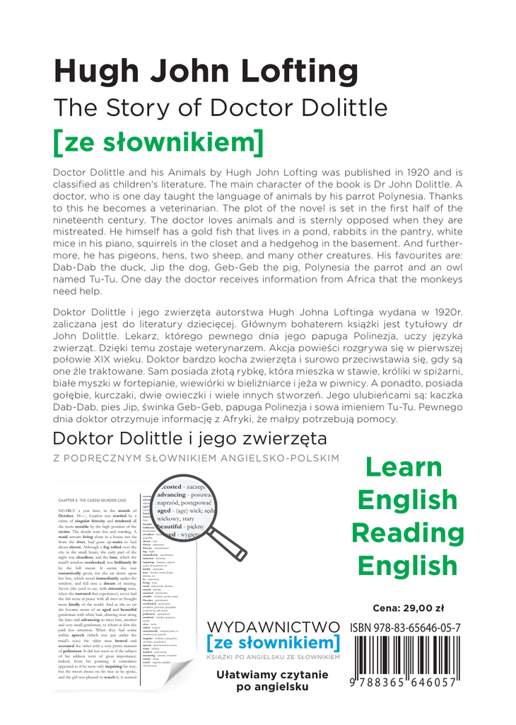 Hugh John Lofting The Story of Doctor Dolittle ze słownikiem Doctor Dolittle and his Animals by Hugh John Lofting was published in 1920 and is classified as children's literature. The main character of the book is Dr John Dolittle. A doctor, who is one day taught the language of animals by his parrot Polynesia. Thanks to this he becomes a veterinarian. The plot of the novel is set in the first half of the nineteenth century. The doctor loves animals and is sternly opposed when they are mistreated. He himself has a gold fish that lives in a pond, rabbits in the pantry, white mice in his piano, squirrels in the closet and a hedgehog in the basement. And furthermore, he has pigeons, hens, two sheep, and many other creatures. His favourites are: Dab-Dab the duck, Jip the dog, Geb-Geb the pig, Polynesia the parrot and an owl named Tu-Tu. One day the doctor receives information from Africa that the monkeys need help. Doktor Dolittle i jego zwierzęta autorstwa Hugh Johna Loftinga wydana w 1920r. zaliczana jest do literatury dziecięcej. Głównym bohaterem książki jest tytułowy dr John Dolittle. Lekarz, którego pewnego dnia jego papuga Polinezja, uczy języka zwierząt. Dzięki temu zostaje weterynarzem. Akcja powieści rozgrywa się w pierwszej połowie XIX wieku. Doktor bardzo kocha zwierzęta i surowo przeciwstawia się, gdy są one źle traktowane. Sam posiada złotą rybkę, która mieszka w stawie, króliki w spiżarni, białe myszki w fortepianie, wiewiórki w bieliźniarce i jeża w piwnicy. A ponadto, posiada gołębie, kurczaki, dwie owieczki i wiele innych stworzeń. Jego ulubieńcami są: kaczka Dab-Dab, pies Jip, świnka Geb-Geb, papuga Polinezja i sowa imieniem Tu-Tu. Pewnego dnia doktor otrzymuje informację z Afryki, że małpy potrzebują pomocy. Doktor Dolittle i jego zwierzęta Z PODRĘCZNYM SŁOWNIKIEM ANGIELSKO -POLSKIM CHAPTER 4. THE CAREW MURDER CASE NEARLY a year later, in the month of October, 18—-, London was startled by a crime of singular ferocity and rendered all the more notable by the high position of the victim. The details were few and startling. A maid servant living alone in a house not far from the river, had gone up-stairs to bed about eleven. Although a fog rolled over the city in the small hours, the early part of the night was cloudless, and the lane, which the maid's window overlooked, was brilliantly lit by the full moon. It seems she was romantically given, for she sat down upon her box, which stood immediately under the window, and fell into a dream of musing. Never (she used to say, with streaming tears, when she narrated that experience), never had she felt more at peace with all men or thought more kindly of the world. And as she so sat she became aware of an aged and beautiful gentleman with white hair, drawing near along the lane; and advancing to meet him, another and very small gentleman, to whom at first she paid less attention. When they had come within speech (which was just under the maid's eyes) the older man bowed and accosted the other with a very pretty manner of politeness. It did not seem as if the subject of his address were of great importance; indeed, from his pointing, it sometimes appeared as if he were only inquiring his way; but the moon shone on his face as he spoke, and the girl was pleased to watch it, it seemed accosted - zaczepił advancing - posuwać się accosted - zaczepił advancing - posuwać się naprzód, postępować naprzód, postępować aged - (age) wiek; sędziwy, wiekowy, stary aged - (age) wiek; sędziwy, beautiful - piękny bowed - wygięty, w kształcie wiekowy, stary łuku breathe - oddychać brilliantly - znakomicie, beautiful - piękny błyskotliwie cloudless - bezchmurny, bowed - wygięty, w kształcie pogodny dream - śnić łuku eleven - jedenaście ferocity - okrucieństwo fog - mgła breathe - oddychać immediately - natychmiast innocent - niewinny brilliantly - znakomicie, inquiring - (inquire) zapytać, pytać, dowiadywać się błyskotliwie kindly - uprzejmie lane - uliczka, wąska droga, dróżka, tor cloudless - bezchmurny, lit - oświetlony living - życiepogodny maid - pokojówka, druhna month - miesiąc dream - śnić narrated - narratorski notable - wybitny, godny uwagi eleven - jedenaście October - październik overlooked - przoczony, pomijany; górować, spoglądać, - okrucieństwo ferocity wznosić się nad czymś politeness - uprzejmość fog - mgła rendered - (render) sprawiać, czynić immediately - natychmiast river - rzeka rolled - zwijany romanticallyinnocent - romantycznie, w - niewinny romantyczny sposób singular - wybitny, szczególny, inquiring - (inquire) zapytać, osobliwy; pojedynczy speech - przemówienie, mowa pytać, dowiadywać się stairs - schody startled - zaskoczony streaming - kindly (stream) strumień- uprzejmie KSIĄŻKI PO ANGIELSKU ZE SŁOWNIKIEM victim - ofiara watch - zegarek; oglądać,- uliczka, wąska droga, lane obserwować, Learn English Reading English Cena: 29,00 zł WYDAWNICTWO ISBN 978-83-65646-05-7 ze słownikiem Ułatwiamy czytanie po angielsku 9 788365 646057