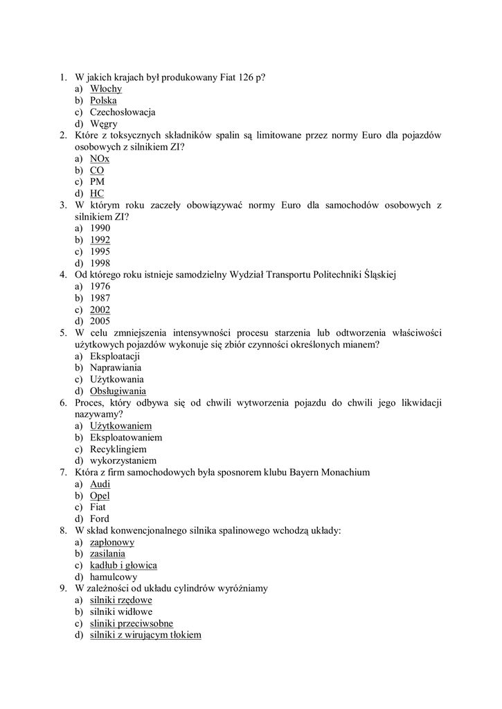 1. W jakich krajach był produkowany Fiat 126 p? a) Włochy b) Polska c) Czechosłowacja d) Węgry 2. Które z toksycznych składników spalin są limitowane przez normy Euro dla pojazdów osobowych z silnikiem ZI? a) NOx b) CO c) PM d) HC 3. W którym roku zaczeły obowiązywać normy Euro dla samochodów osobowych z silnikiem ZI? a) 1990 b) 1992 c) 1995 d) 1998 4. Od którego roku istnieje samodzielny Wydział Transportu Politechniki Śląskiej a) 1976 b) 1987 c) 2002 d) 2005 5. W celu zmniejszenia intensywności procesu starzenia lub odtworzenia właściwości użytkowych pojazdów wykonuje się zbiór czynności określonych mianem? a) Eksploatacji b) Naprawiania c) Użytkowania d) Obsługiwania 6. Proces, który odbywa się od chwili wytworzenia pojazdu do chwili jego likwidacji nazywamy? a) Użytkowaniem b) Eksploatowaniem c) Recyklingiem d) wykorzystaniem 7. Która z firm samochodowych była sposnorem klubu Bayern Monachium a) Audi b) Opel c) Fiat d) Ford 8. W skład konwencjonalnego silnika spalinowego wchodzą układy: a) zapłonowy b) zasilania c) kadłub i głowica d) hamulcowy 9. W zależności od układu cylindrów wyróżniamy a) silniki rzędowe b) silniki widłowe c) sliniki przeciwsobne d) silniki z wirującym tłokiem 10. W którym roku poraz pierwszy zastosowano system ABS a) 1965 b) 1978 c) 1983 d) 1990 11. Poślizg maksymalny pojazdu następuje wówczas gdy: a) prędkość kątowa koła jest równa zeru a pojazd dalej porusza się b) prędkość obwodowa koła jest równa dziewięćdziesiąt a pojazd nadal porusza się c) prędkość obwodowa koła jest równa zeru a pojazd dalej porusza się d) prędkość wektorowa koła jest równa zeru a pojazd nadal porusza się 12. Samochodami jakich marek poruszał się James Bond w swoich przygodach? a) Saab b) BMW c) Aston Martin d) Alfa Romeo 13. Lądowy rekord prędkości wynosi a) 878,16 km/h b) 1197,38 km/h c) 1227,98 km/h d) 1325,97 km/h 14. Do głównych charakterystyk silników tłokowych zaliczamy charakterystyki: a) prędkościowe b) obciążeniowe c) zużyciowe d) regulacyjne 15. Maksymalna prędkość Aston Martin Vantage DB7 wynosi: a) 252 km/h b) 198 km/h c) 298 km/h d) 321 km/h 16. Emisja których ze składników toksycznych spalin w silniku o ZS jest limitowana normami Euro: a) NOx b) HC c) CH d) PM 17. Parametr charakteryzujący zużycie paliwa w danym silniku w celu wygenerowania mocy użytecznej 1 kW w ciągu jednej godziny to: a) godzinowe zużycie paliwa b) jednostkowe zużycie paliwa c) sekundowe zużycie paliwa d) objętościowe zużycie paliwa 18. Które skrzynie biegów mają zastosowanie w pojazdach samochodowych: a) Stopniowe b) Wielostopniowe c) Bezstopniowe d) Mieszane 19. Gdzie po raz pierwszy został zaprezentowany model Rolls-Royce 10hp w roku 1904: a) Rzymie b) Londynie c) Chicago d) Paryżu 20. Prędkość obrotowa silników stosowanych w F1 w roku 2007 jest limitowana do wielkości a) 18000 obr./min b) 17000 obr./min c) 19000 obr./min d) nie jest limitowana 21. Do produktów otrzymywanych z destylacji próżniowej ropy naftowej zaliczamy: a) benzyna lotnicza b) benzyna samochodowa c) destylaty wrzecionowe d) oleje silnikowe 22. Pierwszy samochoód napędzany wiatrem został skonstruowany we Włoszech w roku: a) 1257 b) 1335 c) 1689 d) 1815 23. Urządzenie służące do zatrzymania, zwalniania lub regulacji prędkości ruchu pojazdów nazywamy: a) sprzęgłami b) zwalniaczami c) mechanizmami zwrotniczymi d) hamulcami 24. W oparciu o obowiązujące w Polsce przepisy, w układzie hamulcowym samochodu wyodrębnia się m.in.: a) zespół sterujący b) zespół diagnozujący c) zespół przenoszący d) zespół wspomagający 25. Do tribologicznych procesów zużywania elementów samochodu możemy zaliczyć: a) zużycie ścierne b) zużycie erozyjne c) zużycie kawitacyjne d) zużycie korozyjne 26. Do materiałów eksploatacyjnych samochodów możemy zaliczyć: a) powietrzę b) wodę c) paliwa silnikowe d) oleje silnikowe 27. Rajdowym Mistrzem Polski w roku 2006 roku został a) Leszek Kuzaj b) Tomasz Kuchar c) Michał Bębenek d) Tomasz Czopik 28. System kontroli toru jazdy oznaczamy jest skrótem: a) ASR b) ESP c) AFU d) EBV 29. VW Golf IV był produkowany w latach a) 1992 - 1996 b) 1998 - 2005 c) 1995 - 2003 d) 1997 - 2003 30. Układ mechanizmów, łączących koła jezdne z samonośnymi nadwoziem lub ramą nazywamy: a) resorami b) amortyzatorami c) wałakmi skrętnymi d) zawieszeniem 31. Ze względu na sposób ułożenia warstw osnowy, możemy wyróżnić opony: a) diagonalne b) sferoidalne c) promieniowe d) owalne 32. Wydział Transportu posiada ośrodki zamiejscowe w miastach: a) Rybniku b) Bytomiu c) Tychach d) Chorzowie 33. W jaki sposób sprawdzamy wysokość bieżnika a) specjalnym głębokościomierzem b) nadlewem na oponie c) wskaznikiem TWI d) nie ma takiej potrzeby 34. Najczęstszy sposób łożyskowania przednich kół jezdnych samochodów osobowych to: a) łożyska dwurzędowe kulkowe b) dwa łożyska jednorzędowe kulkowe, c) łożyska ślizgowe d) łożysko jednostożkowe 35. Podczas wymiany zębatego paska rozrządu należy wymienić: a) rolkę napinającą b) pompę płynu chłodzącego, która odbiera napęd od tego paska c) rolkę prowadzącą d) wszystkie powyższe elementy 36. Klucz dynamometryczny służy do dokręcania: a) śrub mocujących koła jezdne b) śrub mocujących koło zamachowe c) śrub mocujących głowicę d) wszystkich połączeń gwintowych 37. Wymiana oleju silnikowego w samochodzie ciężarowym następuje po: a) 15000 km b) 25000 km c) 50000 km d) zgodnie z zaleceniami producenta 38. Liczba cetanowa oleju napędowego określa a) granicę dymienia b) odporność paliwa na spalanie stukowe c) podatność paliwa do samozapłonu d) wartość opałową paliwa 39. Siedziba firmy Mercedes znajduje się w: a) Bonn b) Monachium c) Achen d) Stuttgart 40. Nazwa Mercedes została zapożyczona od a) imienia kobiecego b) landu w Niemczech c) nazwy trójramiennej gwiazdy