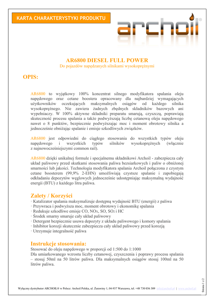 KARTA CHARAKTERYSTYKI PRODUKTU AR6800 DIESEL FULL POWER Do pojazdów napędzanych silnikami wysokoprężnymi OPIS: AR6800 to wyjątkowy 100% koncentrat silnego modyfikatora spalania oleju napędowego oraz cetane boostera opracowany dla najbardziej wymagających użytkowników oczekujących maksymalnych osiągów od każdego silnika wysokoprężnego. Nie zawiera żadnych zbędnych składników bazowych ani wypełniaczy. W 100% aktywne składniki preparatu smarują, czyszczą, poprawiają skuteczność procesu spalania a także podwyższają liczbę cetanową oleju napędowego nawet o 8 punktów, bezpiecznie podwyższając moc i moment obrotowy silnika a jednocześnie obniżając spalanie i emisje szkodliwych związków. AR6800 jest odpowiedni do ciągłego stosowania do wszystkich typów oleju napędowego i wszystkich typów silników wysokoprężnych (włącznie z najnowocześniejszymi common rail). AR6800 dzięki unikalnej formule i specjalnemu składnikowi Archoil - zabezpiecza cały układ paliwowy przed skutkami stosowania paliwa bezsiarkowych i paliw o obniżonej smarności lub jakości. Technologia modyfikatora spalania Archoil połączona z czystym cetane boosterem (99,9% 2-EHN) umożliwiają czystsze spalanie i zapobiegają odkładaniu depozytów węglowych jednocześnie udostępniając maksymalną wydajność energii (BTU) z każdego litra paliwa. Zalety / Korzyści · · · · · · · Katalizator spalania maksymalizuje dostępną wydajność BTU (energii) z paliwa Przywraca i podwyższa moc, moment obrotowy i ekonomikę spalania Redukuje szkodliwe emisje CO, NOX, SO, SO2 i HC Środek smarny smaruje cały układ paliwowy Detergent bezpiecznie usuwa depozyty z układu paliwowego i komory spalania Inhibitor korozji skutecznie zabezpiecza cały układ paliwowy przed korozją Utrzymuje integralność paliwa Instrukcje stosowania: Wyłączny dystrybutor ARCHOIL® w Polsce: Archoil Polska, ul. Żurawiny 1, 04-937 Warszawa, tel. +48 730 036 309 [email protected] | www.archoil.pl Strona 1 z 2 Stosować do oleju napędowego w proporcji od 1:500 do 1:1000 Dla umiarkowanego wzrostu liczby cetanowej, czyszczenia i poprawy procesu spalania – stosuj 50ml na 50 litrów paliwa. Dla maksymalnych osiągów stosuj 100ml na 50 litrów paliwa. Dostępne opakowania: 100ml butelka 500ml, 1 litr butelka z dozownikiem 5 litrów, 20 litrów pojemnik 208 litrów beczka Specyfikacja: Ciężar właściwy: 0,900 g/cm3 Temperatura zapłonu: 65°C Temperatura samozapłonu: 130°C Kolor: bezbarwny do żółtego Ciecz w 100% rozpuszczalna w paliwach Zasady bezpiecznego składowania i stosowania: Wyłączny dystrybutor ARCHOIL® w Polsce: Archoil Polska, ul. Żurawiny 1, 04-937 Warszawa, tel. +48 730 036 309 [email protected] | www.archoil.pl Strona 2 z 2 Przechowywać w zamkniętym opakowaniu z daleka od źródeł ognia i ciepła. Zapewnić odpowiednią wentylację podczas dozowania. Unikać wdychania oparów. Nie połykać. Unikać kontaktu ze skórą. Chronić oczy. W przypadku zanieczyszczenia oczu obficie płukać wodą. W przypadku kontaktu ze skórą dokładnie umyć wodą z mydłem. W przypadku połknięcia lub objawów podrażnienia oczu lub skóry koniecznie zasięgnąć porady lekarza.