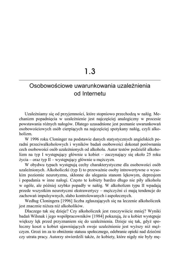 1.3 Osobowościowe uwarunkowania uzależnienia od Internetu Uzależniamy się od przyjemności, które stopniowo przechodzą w nałóg. Mechanizm popadnięcia w uzależnienie jest najczęściej analogiczny w procesie powstawania różnych nałogów. Dlatego uzasadnione jest poznanie uwarunkowań osobowościowych osób cierpiących na najczęściej spotykany nałóg, czyli alkoholizm. W 1996 roku Cloninger na podstawie danych statystycznych angielskich poradni przeciwalkoholowych i wyników badań osobowości dokonał porównania cech osobowości osób uzależnionych od alkoholu. Autor testów podzielił alkoholizm na typ I występujący głównie u kobiet – zaczynający się około 25 roku życia – oraz typ II – występujący głównie u mężczyzn. W obydwu typach występują cechy charakterystyczne dla osobowości osób uzależnionych. Alkoholiczki (typ I) to przeważnie osoby introwertywne o wysokim poziomie neurotyzmu, skłonne do ulegania stanom lękowym, depresjom i popadania w inne nałogi. Często te kobiety bardzo długo nie piły alkoholu w ogóle, ale później szybko popadły w nałóg. W alkoholizm typu II wpadają przede wszystkim neurotyczni ekstrawertycy – mężczyźni ci mają tendencje do zachowań impulsywnych, słabo kontrolowanych i aspołecznych. Według Cloningera [1996] liczba zgłaszających się na leczenie alkoholiczek jest znacznie niższa niż alkoholików. Dlaczego tak się dzieje? Czy alkoholiczek jest rzeczywiście mniej? Wyniki badań Wilsnak i jego współpracowników [1984] pokazują, że u kobiet występuje większy lęk przed przyznaniem się do uzależnienia. Dzieje się tak, gdyż społeczny koszt u kobiet ujawniających swoje uzależnienie jest wyższy niż mężczyzn. Grozi im za to obniżenie statusu społecznego, odebranie opieki nad dziećmi czy utrata pracy. Autorzy stwierdzili także, że kobiety, które nigdy nie były mę- 32 Człowiek i Internet: przegląd literatury żatkami, są rozwiedzione lub żyją w separacji, a także te, które żyją w konkubinacie, mają większą tendencję do uzależnień niż kobiety zamężne lub owdowiałe. Heath i współpracownicy [1989] zajmowali się podobnym problemem. Badali pary bliźniąt, szukając czynników środowiskowych modyfikujących łatwość popadania w nałogi. Stwierdzili, że wśród kobiet małżeństwo modyfikuje wpływ czynników genetycznych, osłabiając tendencję do uzależnień. Stwierdzili też, że charakterystyczną cechą kobiet uzależnionych jest obecność depresji poprzedzającej wystąpienie uzależnienia, spowodowanej nieprawidłowo funkcjonującą rodziną. U mężczyzn takie zjawisko nie pojawiło się. Wzmiankowane prace inspirują do poszukiwania odpowiedzi na pytanie, czy podobne zależności wystąpią w przypadku uzależnień komputerowych? Jak wskazują wyniki badań Grohol [2006] kobiety, które nadmiernie korzystają z komputera, kompensują sobie w ten sposób różne niezaspokajane potrzeby. Na 28 kobiet badanych przez niego aż 12 stwierdziło, iż uzależniło się od komputera na urlopie wychowawczym, podając jako przyczynę: frustrację, brak możliwości samorealizacji, osamotnienie emocjonalne, monotonię życia, niedocenianie ich roli przez mężów, brak czasu na rozrywkę, dolegliwości o charakterze nerwicowym. Pięć innych kobiet w tej grupie było po rozwodzie lub porzuceniu przez męża, trzy zawsze były samotne i miały poczucie niemożności ułożenia sobie życia, a trzy podawały inne powody. Grohol [2006] stwierdził również, że w porównaniu z mężczyznami kobietom potrzebny jest krótszy okres czasu do wystąpienia pełnoobjawowego uzależnienia od Internetu. Zagadnienie osobowościowych uwarunkowań uzależnienia od Internetu jako pierwszy podjął Kraut ze swoimi współpracownikami [1999]. Na podstawie analizy wyników badania 173 internautów wykazał istnienie związku nadmiernego użycia Internetu z objawami kryzysu psychicznego, a zwłaszcza uczucia społecznej izolacji i depresji. Young i Rodgers [1998] przy użyciu opracowanego przez siebie 16 czynnikowego kwestionariusza osobowości badali korelację między czasem korzystania z Internetu a różnymi cechami osobowości. W rezultacie wykryli statystycznie istotny związek między czasem korzystania z Internetu a wrażliwością (reaktywnością) emocjonalną. Badacze uważają, że osoby bardziej wrażliwe emocjonalnie szukają w Internecie mniej absorbujących emocjonalnie kontaktów z innymi ludźmi. Petrie i Gunn [1998] poszukiwali związku między poziomem uzależnienia od Internetu a wiekiem, płcią, introwersją i ekstrawersją oraz dominującym nastrojem. Badanie przeprowadzili na grupie 445 internautów, z których 46% wykazywało objawy uzależnienia od Internetu. Pozostali pod względem czasu spędzanego w Internecie zaliczali się do przeciętnych użytkowników sieci. W rezulta- Osobowościowe uwarunkowania uzależnienia od Internetu 33 cie nie wykryli oni związku między wiekiem i płcią. Natomiast w ich badaniu pojawił się istotny związek introwersji i depresji z uzależnieniem od Internetu. Może to dowodzić, że introwertywni neurotycy (melancholicy) są bardziej narażeni na uzależnienie się od sieci. Wychodząc z założeń psychoanalitycznej koncepcji osobowości, Suler [1998], sformułował przedstawione poniżej hipotezy, które dopiero w bliżej nieokreślonej przyszłości zamierza eksperymentalnie weryfikować (moim zdaniem upraszczając zagadnienie do trywialnych przypuszczeń) odnośnie zależności patologicznych cech osobowości i stylu użytkowania Internetu: – schizoidalni ludzie mają tendencję do tworzenia i przeżywania urojeń na temat sieci, – maniacy impulsywni wysyłają pocztą elektroniczną obelgi, a później tego żałują, – hakerzy mają antyspołeczne (psychopatyczne) osobowości, – ludzie z dysocjacyjnymi (rozszczepiennymi) cechami osobowości mają skłonność do izolowania się od rzeczywistośc