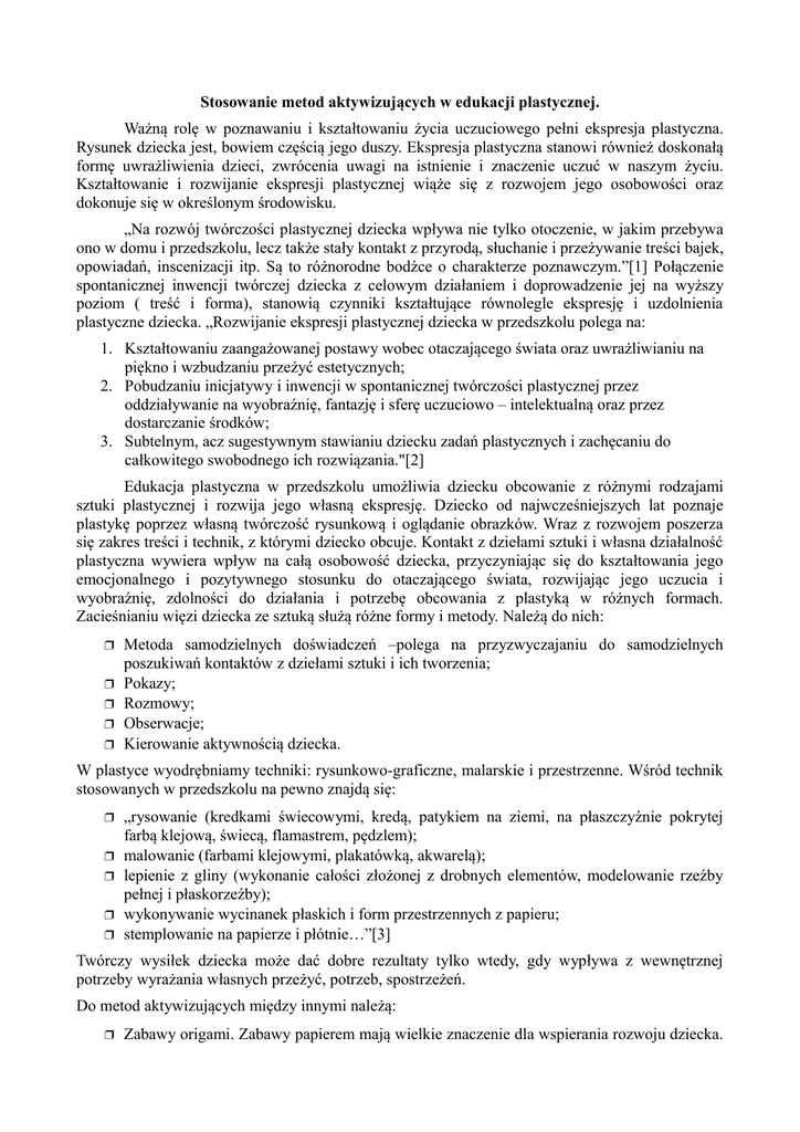 Stosowanie metod aktywizujących w edukacji plastycznej. Ważną rolę w poznawaniu i kształtowaniu życia uczuciowego pełni ekspresja plastyczna. Rysunek dziecka jest, bowiem częścią jego duszy. Ekspresja plastyczna stanowi również doskonałą formę uwrażliwienia dzieci, zwrócenia uwagi na istnienie i znaczenie uczuć w naszym życiu. Kształtowanie i rozwijanie ekspresji plastycznej wiąże się z rozwojem jego osobowości oraz dokonuje się w określonym środowisku. „Na rozwój twórczości plastycznej dziecka wpływa nie tylko otoczenie, w jakim przebywa ono w domu i przedszkolu, lecz także stały kontakt z przyrodą, słuchanie i przeżywanie treści bajek, opowiadań, inscenizacji itp. Są to różnorodne bodźce o charakterze poznawczym.”[1] Połączenie spontanicznej inwencji twórczej dziecka z celowym działaniem i doprowadzenie jej na wyższy poziom ( treść i forma), stanowią czynniki kształtujące równolegle ekspresję i uzdolnienia plastyczne dziecka. „Rozwijanie ekspresji plastycznej dziecka w przedszkolu polega na: 1. Kształtowaniu zaangażowanej postawy wobec otaczającego świata oraz uwrażliwianiu na piękno i wzbudzaniu przeżyć estetycznych; 2. Pobudzaniu inicjatywy i inwencji w spontanicznej twórczości plastycznej przez oddziaływanie na wyobraźnię, fantazję i sferę uczuciowo – intelektualną oraz przez dostarczanie środków; 3. Subtelnym, acz sugestywnym stawianiu dziecku zadań plastycznych i zachęcaniu do całkowitego swobodnego ich rozwiązania."[2] Edukacja plastyczna w przedszkolu umożliwia dziecku obcowanie z różnymi rodzajami sztuki plastycznej i rozwija jego własną ekspresję. Dziecko od najwcześniejszych lat poznaje plastykę poprzez własną twórczość rysunkową i oglądanie obrazków. Wraz z rozwojem poszerza się zakres treści i technik, z którymi dziecko obcuje. Kontakt z dziełami sztuki i własna działalność plastyczna wywiera wpływ na całą osobowość dziecka, przyczyniając się do kształtowania jego emocjonalnego i pozytywnego stosunku do otaczającego świata, rozwijając jego uczucia i wyobraźnię, zdolności do działania i potrzebę obcowania z plastyką w różnych formach. Zacieśnianiu więzi dziecka ze sztuką służą różne formy i metody. Należą do nich: Metoda samodzielnych doświadczeń –polega na przyzwyczajaniu do samodzielnych poszukiwań kontaktów z dziełami sztuki i ich tworzenia; Pokazy; Rozmowy; Obserwacje; Kierowanie aktywnością dziecka. W plastyce wyodrębniamy techniki: rysunkowo-graficzne, malarskie i przestrzenne. Wśród technik stosowanych w przedszkolu na pewno znajdą się: „rysowanie (kredkami świecowymi, kredą, patykiem na ziemi, na płaszczyźnie pokrytej farbą klejową, świecą, flamastrem, pędzlem); malowanie (farbami klejowymi, plakatówką, akwarelą); lepienie z gliny (wykonanie całości złożonej z drobnych elementów, modelowanie rzeźby pełnej i płaskorzeźby); wykonywanie wycinanek płaskich i form przestrzennych z papieru; stemplowanie na papierze i płótnie…”[3] Twórczy wysiłek dziecka może dać dobre rezultaty tylko wtedy, gdy wypływa z wewnętrznej potrzeby wyrażania własnych przeżyć, potrzeb, spostrzeżeń. Do metod aktywizujących między innymi należą: Zabawy origami. Zabawy papierem mają wielkie znaczenie dla wspierania rozwoju dziecka. Należy pozwolić dziecku wyrażać własne potrzeby, możliwości, własną wizję świata. Praca z papierem daje dziecku możliwość osiągnięcia radości z tworzenia, wycisza go, uczy organizacji pracy. Dzieci nabywają pewności siebie, rozwijają sprawności manualne rąk, umiejętność rozróżniania kolorów, figur, uczą się cierpliwości, skupienia, komponowania prac, kształcą umiejętności matematyczne. Dzięki origami dzieci szybko dostrzegają efekty swojej pracy. Poznają różnorodność sposobu składania papieru – z kół i kwadratów. Zabawy z papierem rozwijają wyobraźnię, pobudzają ciekawość odkrywania, rozwijania mowy. Technikę origami można łączyć z innymi formami plastycznymi, co daje różnorodne możliwości tworzenia. Zabawy gazetami; Zabawy pedagogiki zabawy w naturalny sposób wykorzystują zabawę, nadając jej znaczenie wychowawcze i terapeutyczne. Praca metodą pedagogiki zabawy wytwarza miedzy uczestnikami pozytywne relacje, stymuluje aktywność twórczą, sprawia, że dzieci podczas zabaw nie stresują się, nie wykazują żadnych zahamowań. Wśród różnych można wymienić: „Ćwierćland”, „Podróż do Hollywood”; Malowanie na jedwabiu poprzedzone bajką o powstaniu jedwabiu, oglądaniem ramek z napiętymi kawałkami białej cienkiej tkaniny. Połączenie muzyki i plastyki. Od czasu do czasu można zaproponować dzieciom interpretację plastyczną utworów muzycznych. Za pomocą barw, znaków plastycznych, kompozycji dzieci mogą wyrażać nastrój, budowę utworu muzycznego lub zawarte w nim treści pozamuzyczne. Połączenie plastyki i przyrody: wycieczki, spacery zabawy na świeżym powietrzu nie tylko inspirują, ale są tematem prac, wyrażają podziw i emocje dziecka związane z otaczającym go światem. Opracowała:Barbara Michniewicz [1] Jadwiga Cybulska-Piskorek: Twórczość plastyczna dziecka w wieku przedszkolnym, WSiP Warszawa 1976 [2] Tamże [3] Anna Natorff, Krystyna Wasiluk: Wychowanie plastyczne w przedszkolu. WSiP Warszawa 1990