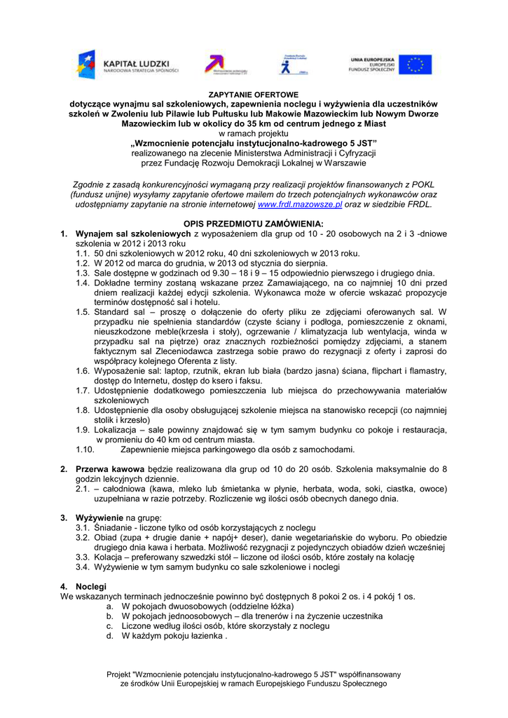 ZAPYTANIE OFERTOWE dotyczące wynajmu sal szkoleniowych, zapewnienia noclegu i wyżywienia dla uczestników szkoleń w Zwoleniu lub Pilawie lub Pułtusku lub Makowie Mazowieckim lub Nowym Dworze Mazowieckim lub w okolicy do 35 km od centrum jednego z Miast w ramach projektu „Wzmocnienie potencjału instytucjonalno-kadrowego 5 JST” realizowanego na zlecenie Ministerstwa Administracji i Cyfryzacji przez Fundację Rozwoju Demokracji Lokalnej w Warszawie Zgodnie z zasadą konkurencyjności wymaganą przy realizacji projektów finansowanych z POKL (fundusz unijne) wysyłamy zapytanie ofertowe mailem do trzech potencjalnych wykonawców oraz udostępniamy zapytanie na stronie internetowej www.frdl.mazowsze.pl oraz w siedzibie FRDL. OPIS PRZEDMIOTU ZAMÓWIENIA: 1. Wynajem sal szkoleniowych z wyposażeniem dla grup od 10 - 20 osobowych na 2 i 3 -dniowe szkolenia w 2012 i 2013 roku 1.1. 50 dni szkoleniowych w 2012 roku, 40 dni szkoleniowych w 2013 roku. 1.2. W 2012 od marca do grudnia, w 2013 od stycznia do sierpnia. 1.3. Sale dostępne w godzinach od 9.30 – 18 i 9 – 15 odpowiednio pierwszego i drugiego dnia. 1.4. Dokładne terminy zostaną wskazane przez Zamawiającego, na co najmniej 10 dni przed dniem realizacji każdej edycji szkolenia. Wykonawca może w ofercie wskazać propozycje terminów dostępność sal i hotelu. 1.5. Standard sal – proszę o dołączenie do oferty pliku ze zdjęciami oferowanych sal. W przypadku nie spełnienia standardów (czyste ściany i podłoga, pomieszczenie z oknami, nieuszkodzone meble(krzesła i stoły), ogrzewanie / klimatyzacja lub wentylacja, winda w przypadku sal na piętrze) oraz znacznych rozbieżności pomiędzy zdjęciami, a stanem faktycznym sal Zleceniodawca zastrzega sobie prawo do rezygnacji z oferty i zaprosi do współpracy kolejnego Oferenta z listy. 1.6. Wyposażenie sal: laptop, rzutnik, ekran lub biała (bardzo jasna) ściana, flipchart i flamastry, dostęp do Internetu, dostęp do ksero i faksu. 1.7. Udostępnienie dodatkowego pomieszczenia lub miejsca do przechowywania materiałów szkoleniowych 1.8. Udostępnienie dla osoby obsługującej szkolenie miejsca na stanowisko recepcji (co najmniej stolik i krzesło) 1.9. Lokalizacja – sale powinny znajdować się w tym samym budynku co pokoje i restauracja, w promieniu do 40 km od centrum miasta. 1.10. Zapewnienie miejsca parkingowego dla osób z samochodami. 2. Przerwa kawowa będzie realizowana dla grup od 10 do 20 osób. Szkolenia maksymalnie do 8 godzin lekcyjnych dziennie. 2.1. – całodniowa (kawa, mleko lub śmietanka w płynie, herbata, woda, soki, ciastka, owoce) uzupełniana w razie potrzeby. Rozliczenie wg ilości osób obecnych danego dnia. 3. Wyżywienie na grupę: 3.1. Śniadanie - liczone tylko od osób korzystających z noclegu 3.2. Obiad (zupa + drugie danie + napój+ deser), danie wegetariańskie do wyboru. Po obiedzie drugiego dnia kawa i herbata. Możliwość rezygnacji z pojedynczych obiadów dzień wcześniej 3.3. Kolacja – preferowany szwedzki stół – liczone od ilości osób, które zostały na kolację 3.4. Wyżywienie w tym samym budynku co sale szkoleniowe i noclegi 4. Noclegi We wskazanych terminach jednocześnie powinno być dostępnych 8 pokoi 2 os. i 4 pokój 1 os. a. W pokojach dwuosobowych (oddzielne łóżka) b. W pokojach jednoosobowych – dla trenerów i na życzenie uczestnika c. Liczone według ilości osób, które skorzystały z noclegu d. W każdym pokoju łazienka . Projekt "Wzmocnienie potencjału instytucjonalno-kadrowego 5 JST" współfinansowany ze środków Unii Europejskiej w ramach Europejskiego Funduszu Społecznego SPOSÓB WYCENY 1. Prosimy o podawanie cen brutto. 2. Zamawiający może prosić oferentów o dodatkowe wyjaśnienia lub uzupełnienie oferty. W takiej sytuacji wszyscy oferenci będą mieli takie same szanse na uzupełnienia. 3. Oferenci mogą zadawać pytania w trakcie okresu przygotowywania oferty wyłącznie mailem na adres: [email protected]. POZOSTAŁE WARUNKI 1. Umowa musi zostać podpisana w tym roku. Ustalone ceny nie mogą ulec zmianie przez cały czas trwania umowy. 2. Jeżeli zaoferowana cena przekroczy kwoty przewidziane w budżecie projektu Zamawiający rozpocznie negocjacje indywidualne z oferentami. Jeżeli w wyniku negocjacji nie uda się osiągnąć cen mieszczących się w budżecie projektu, zapytanie ofertowe uznaje się za nieważne. ZAPISY, KTÓRE BĘDĄ ZAWARTE W UMOWIE 1. Płatności zaliczkowe są możliwe dopiero po pierwszym pobycie dodatkowo pod warunkiem posiadania na koncie środków projektowych z MSWiA. Zaliczka nie może przekroczyć 30% wartości zamówienia na dany miesiąc. 2. Obie strony obowiązuje 30 dniowy okres wypowiedzenia bez podawania przyczyny. 3. Umowa może zostać wypowiedziana przez Zamawiającego za 2 tygodniowym wypowiedzeniem jeśli warunki na miejscu nie będą zgodne z ofertą, 1. 2. 3. 4. 5. 6. 7. 8. 9. 10. ZŁOŻONA OFERTA POWINNA ZAWIERAĆ Nazwę i adres oferenta Opis nawiązujący do parametrów wyszczególnionych w zapytaniu ofertowym Cenę jednostkową brutto za dzień wynajmu Sali szkoleniowej do 8 godz. lekcyjnych. Cenę jednostkową brutto za przerwę kawową całodniową w przeliczeniu na 1 osobę Cenę jednostkową brutto za śniadanie w przeliczeniu na 1 osobę Cenę jednostkową brutto za obiad w przeliczeniu na 1 osobę Cenę jednostkową brutto za kolacje w przeliczeniu na 1 osobę Cenę jednostkową brutto za nocleg w pokoju 2 osobowym Cenę jednostkową brutto za nocleg w pokoju 1 osobowym Miejsce położenia pokoi hotelowych i sal (adres) wraz ze zdjęciami i opisem ich wyposażenia oraz przykładowe menu dot. obiadu i kolacji. Do postępowania dopuszczone zostaną wszystkie oferty dotyczące całości zamówienia tj. wynajem Sali+ catering+ noclegi. Zamawiający nie przewiduje składania ofert częściowych. KRYTERIA OCENY OFERT Kryterium oceny oferty jest 70% STANDARD, 30% CENA z uwzględnieniem poniższych warunków: Jeżeli cena zaproponowan