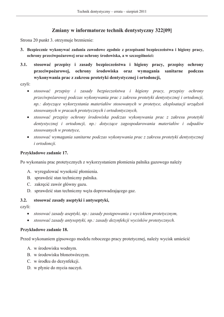 Technik dentystyczny – errata – sierpieĔ 2011 Zmiany w informatorze technik dentystyczny 322[09] Strona 20 punkt 3. otrzymuje brzmienie: 3. Bezpiecznie wykonywaü zadania zawodowe zgodnie z przepisami bezpieczeĔstwa i higieny pracy, ochrony przeciwpoĪarowej oraz ochrony Ğrodowiska, a w szczególnoĞci: 3.1. stosowaü przepisy i zasady bezpieczeĔstwa i higieny pracy, przepisy ochrony przeciwpoĪarowej, ochrony Ğrodowiska oraz wymagania sanitarne podczas wykonywania prac z zakresu protetyki dentystycznej i ortodoncji, czyli: x stosowaü przepisy i zasady bezpieczeĔstwa i higieny pracy, przepisy ochrony przeciwpoĪarowej podczas wykonywania prac z zakresu protetyki dentystycznej i ortodoncji, np.: dotyczące wykorzystania materiaáów stosowanych w protetyce, eksploatacji urządzeĔ stosowanych w pracach protetycznych i ortodontycznych, x stosowaü przepisy ochrony Ğrodowiska podczas wykonywania prac z zakresu protetyki dentystycznej i ortodoncji, np.: dotyczące zagospodarowania materiaáów i odpadów stosowanych w protetyce, x stosowaü wymagania sanitarne podczas wykonywania prac z zakresu protetyki dentystycznej i ortodoncji. Przykáadowe zadanie 17. Po wykonaniu prac protetycznych z wykorzystaniem páomienia palnika gazowego naleĪy A. B. C. D. wyregulowaü wysokoĞü páomienia. sprawdziü stan techniczny palnika. zakrĊciü zawór gáówny gazu. sprawdziü stan techniczny wĊĪa doprowadzającego gaz. 3.2. stosowaü zasady aseptyki i antyseptyki, czyli: x stosowaü zasady aseptyki, np.: zasady postĊpowania z wyciskiem protetycznym, x stosowaü zasady antyseptyki, np.: zasady dezynfekcji wycisków protetycznych. Przykáadowe zadanie 18. Przed wykonaniem gipsowego modelu roboczego pracy protetycznej, naleĪy wycisk umieĞciü A. B. C. D. w Ğrodowisku wodnym. w Ğrodowisku báonotwórczym. w Ğrodku do dezynfekcji. w páynie do mycia naczyĔ. Technik dentystyczny – errata – sierpieĔ 2011 3.3. przewidywaü zagroĪenia wystĊpujące podczas wykonywania podczas wykonywania prac z zakresu protetyki dentystycznej i ortodoncji, czyli: x przewidywaü zagroĪenia wystĊpujące podczas wykonywania prac protetycznych i ortodontycznych, np.: skaleczenia, oparzenia, wnikniĊcie ciaáa obcego do gaáki ocznej, poraĪenia prądem. Przykáadowe zadanie 19. Podczas elektrolitycznego polerowania protezy szkieletowej przy niewáaĞciwym postĊpowaniu technika dentystycznego moĪe wystąpiü A. B. C. D. skaleczenie. zakaĪenie. udar cieplny. poparzenie chemiczne. 3.4. organizowaü stanowiska pracy zgodnie z wymaganiami ergonomii, czyli: x organizowaü stanowiska pracy zgodnie z wymaganiami ergonomii, uwzglĊdniającymi czynniki takie jak: pozycjĊ ciaáa czáowieka, wymiary przestrzeni pracy zapewniające swobodĊ, rytmicznoĞü, ciągáoĞü wykonywania ruchów, rodzaje Ğrodków pracy (narzĊdzia, sprzĊt) oraz czynniki Ğrodowiska pracy (np.: temperaturĊ, oĞwietlenie), wpáywające na fizyczne i umysáowe moĪliwoĞci czáowieka podczas wykonywania pracy, np.: zmĊczenie fizyczne, moĪliwoĞü dekoncentracji. Przykáadowe zadanie 20. Dla której z poniĪszych czynnoĞci naleĪy zorganizowaü stanowisko pracy technika dentystycznego w pozycji stojącej? A. B. C. D. 3.5. Modelowanie woskowej podbudowy mostu za pomocą noĪyka elekrycznego. Odlewanie podbudowy mostu z metalu odlewarką indukcyjną. Opracowanie konstrukcji metalowej mostu mikrosilnikiem. Nakáadanie ceramiki na podbudowĊ pĊdzelkiem do porcelany. stosowaü Ğrodki i sprzĊt ochrony indywidualnej podczas wykonywania prac z zakresu protetyki dentystycznej i ortodoncji, czyli: x stosowaü Ğrodki ochrony indywidualnej, takie jak, np.: rĊkawiczki ochronne podczas dezynfekcji wycisków, maski pyáowe lub przyábice ochronne podczas obróbki mechanicznej akrylu. Technik dentystyczny – errata – sierpieĔ 2011 Przykáadowe zadanie 21. Podczas przeprowadzania procesu obróbki mechanicznej konstrukcji metalowej protezy szkieletowej pracownik powinien byü wyposaĪony A. B. C. D. 3.6. w fartuch ochronny, okulary ochronne i maskĊ przeciwpyáową. tylko w okulary ochronne. rĊkawice gumowe, fartuch gumowy, maskĊ przeciwpyáową. tylko w fartuch ochronny. stosowaü zasady udzielania pierwszej pomocy poszkodowanym podczas wykonywania prac z zakresu protetyki dentystycznej i ortodoncji, czyli: x stosowaü zasady udzielania pierwszej pomocy poszkodowanym podczas wykonywania prac z zakresu protetyki dentystycznej i ortodoncji, np.: zaáoĪenie opatrunku na ranĊ, zaáoĪenie opaski uciskowej, sztuczne oddychanie, opatrywanie oparzeĔ. Przykáadowe zadanie 22. Pierwszą czynnoĞcią pracownika przed przybyciem lekarza do osoby poraĪonej prądem elektrycznym jest A. B. C. D. zmierzenie temperatury ciaáa poszkodowanego. sprawdzenie tĊtna i oddechu poszkodowanemu. odciĊcie zasilania elektrycznego. zmierzenie ciĞnienia krwi poszkodowanemu. 2.4. Odpowiedzi do przykáadowych zadaĔ CzĊĞü pierwsza Zadanie 1 Zadanie 2 Zadanie 3. Zadanie 4. Zadanie 5. Zadanie 6 A D D C C C Zadanie 7 Zadanie 8 Zadanie 9 Zadanie 10 Zadanie 11 Zadanie 12 B A D D C C Zadanie 13 Zadanie 14 Zadanie 15 Zadanie 16 Zadanie 17 Zadanie 18 C A B C C C Zadanie19 Zadanie 20 Zadanie 21 Zadanie 22 D B A C Technik dentystyczny – errata – sierpieĔ 2011 Strona 39 rozdziaá 4.1. „Standard wymagaĔ egzaminacyjnych dla zawodu” otrzymuje brzmienie: Zawód: technik dentystyczny symbol cyfrowy: 322[09] Etap pisemny egzaminu obejmuje: CzĊĞü I - zakres wiadomoĞci i umiejĊtnoĞci wáaĞciwych dla kwalifikacji w zawodzie Absolwent powinien umieü: 1. Czytaü ze zrozumieniem informacje przedstawione w formie opisów, instrukcji, rysunków, szkiców, wykresów, dokumentacji technicznych i technologicznych, a w szczególnoĞci: 1.1. stosowaü terminologiĊ wáaĞciwą dla dziedziny stomatologii i ortodoncji oraz z zakresu anatomii, fizjologii i patologii narządu Īucia; 1.2. rozróĪniaü podstawowe cechy morfologiczne i czynnoĞciowe ukáadu stomatognatycznego; 