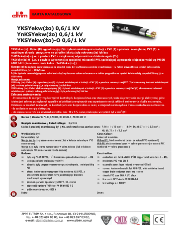 KARTA KATALOGOWA YKSYekw(żo) 0,6/1 KV YnKSYekw(żo) 0,6/1 kV YKSYekw(żo)-O 0,6/1 kV YKSYekw (żo) - Kabel (K) sygnalizacyjny (S) z żyłami miedzianymi o izolacji z PVC (Y) o powłoce zewnętrznej PVC (Y) o wspólnym ekranie statycznym na ośrodku (ekw),z żyłą ochronną (żo) lub bez YnKSYekw(żo) – j.w. o powłoce PVC o zwiększonej odporności na działanie ognia (Yn) YKSYekw(żo)-O - j.w. o powłoce wykonanej ze specjalnej mieszanki PVC spełniającej wymagania olejoodporności wg PN-EN 60811-2-1 ( inne oznaczenie kabla : YoKSYekw (żo) ) Uwaga: a) Na żądanie zamawiającego na ośrodek może być wytłoczona powłoka wypełniająca – w takim przypadku na symbol kabla należy uzupełnić literą (y) - YKSyYekw b) Na żądanie zamawiającego na kabel może być wytłoczona osłona ochronna – w takim przypadku na symbol kabla należy uzupełnić literą (y) – YKSYekwy Wersje pokrewne: YKSYeky (żo) - Kabel (K) sygnalizacyjny (S) z żyłami miedzianymi o izolacji z PVC (Y) o powłoce wewnętrznejPVC (Y) ekranowany drutami miedzianymi (ek) z osłoną polwinitową (y),z żyłą ochronną (żo) lub bez YKSYektmy (żo) - Kabel elektroenergetyczny (K) z żyłami miedzianymi o izolacji z PVC (Y) o powłoce wewnętrznej PVC (Y) ekranowane taśmami miedzianymi (ektm) z osłoną polwinitową (y),z żyłą ochronną (żo) lub bez Zalecane zastosowanie: - Przeznaczone do energetycznych urządzeń kontrolnych, bezpieczeństwa oraz sterowniczych, także do przesyłania energii elektrycznej gdzie istotna jest ochrona przesyłanych sygnałów od zakłóceń zewnętrznych oraz ograniczenie emisji zakłóceń emitowanych z kabla na zewnątrz, Układanie: w kanałach kablowych, na konstrukcjach oraz bezpośrednio w ziemi, w miejscach narażonych na średnie uszkodzenia mechaniczne. - do zasilania w energię elektryczną - siła ciągnięcia za żyły lub powierzchnię kabla: max. 50 x S (S- suma przekrojów wszystkich żył w mm2) [N] Norma / Standard: PN-93/E-90403; IEC 60502-1 ; PN-HD 603 S1 Napięcie znamionowe / Rated voltage: 0,6/1 kV Liczba i przekrój znamionowy żył / No. and rated cross-section cores: 7; 10 × 1 ÷ 10 mm2 ; 14; 19; 24; 30; 37 × 1 ÷ 2,5 mm2 ; 48; 61; 75 × 1 ÷ 1,5 mm2 Wyróżnienie żył: Cores Colour: Barwa izolacji żył: Colours of insulation: Wersja bez żo: żyły czarne numerowane ( lub w kolorze naturalnym PVC Without PE: black numbered cores ( or natural PVC numbered ) numerowane) With PE: black numbered cores + yellow-green core ( or natural PVC Wersja z żo: żyły czarne numerowane + żółto-zielona ( lub w kolorze numbered + yellow-green core ) naturalnym PVC numerowane+żółto-zielona) Budowa: Construction: • żyły: wg PN-EN 60228, 1÷10 miedziane jednodrutowe klasy 1 – RE • conductors acc. to EN 60228, 1÷10 copper solid wire class 1 – RE, • izolacja: polwinit izolacyjny typ DIV 4 • insulation: PVC type DIV 4 • ośrodek: żyły skręcone warstwowo przeciwskrętnie , owinięte folią • assembly: cores layer twisted overwrap PET foil PET • screen: laminated matalic foil ALU-PET, with multiwire tinned • ekran: laminowana tworzywem folia metalowa ALU-PET, z copper drain conductor under the screen umieszczona pod ekranem z żyłą uziemiającą z drucików • sheath: PVC type DMV 5, UV, black miedzianych cynowanych • fire resist YKSYekw to EN 60332-1-2 • powłoka: polwinit oponowy typ DMV 5, UV, czarna • test voltage a.c. 4000 V • odporność ogniowa YKSYekw: PN-EN 60332-1-2 • próba napięciowa: a.c. 4000 V Bębny Drums __________________________________________________________________________________ ZPPE ELTRIM SP. Z O.O., RUSZKOWO 18, 13-214 UZDOWO, TEL. + 48 023 697 03 00, FAX +48 023 697 03 02, e-mail: [email protected] www.eltrim.com.pl KARTA KATALOGOWA Temperatura wg PN-HD 603 S1: • żyły: max. 70°C • żył roboczych przy zwarciu 5s, max: : 160°C • najniższa dopuszczalna temp. kabli przy ich układaniu – bez podgrzewania: -5°C; • składowania: max. 40°C • po ułożeniu na stałe, praca dopuszczalna w temp. -30°C do +70°C • najmniejszy dopuszczalny promień zginania kabla przy układaniu jest równy: dla kabli wielożyłowych 12- krotnej średnicy zewnętrznej kabla Temperatures acc. to HD 603 S1: • core: max. 70°C • max. short circuit temp. 5s, max:: 160°C • min. temp. during installation without preheating: - 5°C • storage: max. 40°C • after fixe installation permitted operation temp. in range of: -30°C do +70°C minimum bending radius: multi core cable 12 × overall diameter Producent zastrzega możliwość zmian bez konieczności informowania klienta. Dane Techniczne / Technical Data – YKSYekw(żo), YnKSYekw(żo), YKSYekw(żo)-O (YoKSYekw(żo)) 0,6/1 kV Ilość i przekrój znamionowy żył No and cross-section of conductors n × mm2 7x1 7 x 1,5 7 x 2,5 7x4 7x6 7 x 10 10 x 1 10 x 1,5 10 x 2,5 10 x 4 10 x 6 10 x 10 14 x 1 14 x 1,5 14 x 2,5 19 x 1 19 x 1,5 19 x 2,5 24 x 1 24 x 1,5 24 x 2,5 30 x 1 30 x 1,5 30 x 2,5 37 x 1 37 x 1,5 37 x 2,5 48 x 1 48 x 1,5 61 x 1 61 x 1,5 75 x 1 75 x 1,5 Obliczeniowy wymiar zewnętrzny kabla Max. rezystancja żyły roboczej w temp. 20 °C Przybliżona masa kabla Outer Sheath thickness nominal Calculate outer diameter of the cable Max. resistance conductor at 20°C Cable weight approx mm mm mm Ω / km kg/km 0,8 0,8 0,8 1,0 1,0 1,0 0,8 0,8 0,8 1,0 1,0 1,0 0,8 0,8 0,8 0,8 0,8 0,8 0,8 0,8 0,8 0,8 0,8 0,8 0,8 0,8 0,8 0,8 0,8 0,8 0,8 0,8 0,8 1,8 1,8 1,8 1,8 1,8 1,8 1,8 1,8 1,8 1,8 1,8 1,8 1,8 1,8 1,8 1,8 1,8 1,8 1,8 1,8 1,8 1,8 1,8 1,8 1,8 1,8 1,8 1,8 1,9 1,9 1,9 2,0 2,1 12,7 13,3 14,5 17,2 18,7 21,1 15,4 16,2 17,8 21,4 23,4 26,6 16,5 17,4 19,2 18,1 19,1 21,1 20,8 22,0 24,4 21,9 23,2 25,8 23,5 24,9 27,8 26,6 28,3 29,1 31,0 32,4 34,6 18,1 12,1 7,41 4,61 3,08 1,83 18,1 12,1 7,41 4,61 3,08 1,83 18,1 12,1 7,41 18,1 12,1 7,41 18,1 12,1 7,41 18,1 12,1 7,41 18,1 12,1 7,41 18,1 12,1 18,1 12,1 18,1 12,1 235 280 370 550 715 1060 310 375 500 745 980 1470 385 4
