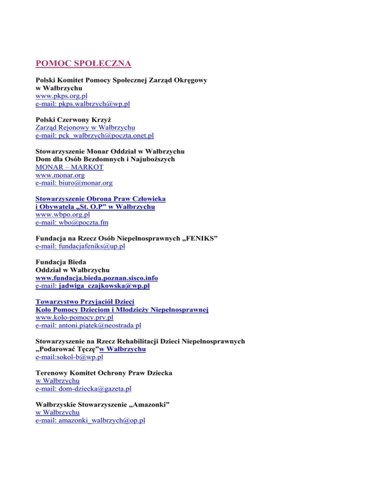 POMOC SPOŁECZNA Polski Komitet Pomocy Społecznej Zarząd Okręgowy w Wałbrzychu www.pkps.org.pl e-mail: [email protected] Polski Czerwony Krzyż Zarząd Rejonowy w Wałbrzychu e-mail: [email protected] Stowarzyszenie Monar Oddział w Wałbrzychu Dom dla Osób Bezdomnych i Najuboższych MONAR – MARKOT www.monar.org e-mail: [email protected] Stowarzyszenie Obrona Praw Człowieka i Obywatela „St. O.P” w Wałbrzychu www.wbpo.org.pl e-mail: [email protected] Fundacja na Rzecz Osób Niepełnosprawnych „FENIKS” e-mail: [email protected] Fundacja Bieda Oddział w Wałbrzychu www.fundacja.bieda.poznan.sisco.info e-mail: [email protected] Towarzystwo Przyjaciół Dzieci Koło Pomocy Dzieciom i Młodzieży Niepełnosprawnej www.kolo-pomocy.prv.pl e-mail: antoni.piątek@neostrada pl Stowarzyszenie na Rzecz Rehabilitacji Dzieci Niepełnosprawnych „Podarować Tęczę”w Wałbrzychu e-mail:[email protected] Terenowy Komitet Ochrony Praw Dziecka w Wałbrzychu e-mail: [email protected] Wałbrzyskie Stowarzyszenie „Amazonki” w Wałbrzychu e-mail: [email protected] Regionalne Centrum Wspierania Inicjatyw Pozarządowych www.rcwip.pl e-mail: [email protected] Dolnośląskie Stowarzyszenie Osób Niepełnosprawnych www.free.ngo.pl/dson e-mail: [email protected] Polskie Stowarzyszenie na Rzecz Osób z Upośledzeniem Umysłowym Koło w Wałbrzychu www.psouu.org.pl e-mail: [email protected] Stowarzyszenie na Rzecz Osób Krzywdzonych PRZYSTAŃ w Wałbrzychu www.przystan.org e-mail: [email protected] Fundacja Tarkowskich Herbu Klamry bezdomni.free.ngo.pl e-mail:[email protected] Towarzystwo Przyjaciół Dzieci Oddział Powiatowy e-mail:[email protected] Stowarzyszenie Klub Abstynenta „Nowe Życie” www.klubabstynenta.nowezycie.gower.pl e-mail: [email protected] Fundacja „RAZEM” w Wałbrzychu www.fundacjarazem.pl e-mail: [email protected] e-mail: [email protected] Fundacja Aktywizacji i Rozwoju Obszarów Wiejskich oraz Małych Miast “NASZE SUDETY” www.naszesudety.org e-mail: [email protected] Polskie Towarzystwo Opieki Paliatywnej Oddział w Wałbrzychu www.opiekapaliatywna.hb.pl e-mail: [email protected]
