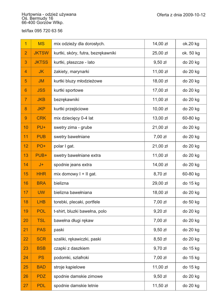Hurtownia - odzież używana Oś. Bermudy 16 66-400 Gorzów Wlkp. Oferta z dnia 2009-10-12 tel/fax 095 720 63 56 1 MS mix odzieży dla dorosłych. 14,00 zł ok.20 kg 2 JKTSW kurtki, skóry, futra, bezrękawniki 25,00 zł ok. 50 kg 3 JKTSS kurtki, płaszcze - lato 9,50 zł do 20 kg 4 JK żakiety, marynarki 11,00 zł do 20 kg 5 JM kurtki bluzy młodzieżowe 18,00 zł do 20 kg 6 JSS kurtki sportowe 17,00 zł do 20 kg 7 JKB bezrękawniki 11,00 zł do 20 kg 8 JKP kurtki przejściowe 10,00 zł do 20 kg 9 CRK mix dziecięcy 0-4 lat 13,00 zł 60-80 kg 10 PU+ swetry zima - grube 21,00 zł do 20 kg 11 PUB swetry bawełniane 7,00 zł do 20 kg 12 PO+ polar I gat. 21,00 zł do 20 kg 13 PUB+ swetry bawełniane extra 11,00 zł do 20 kg 14 J+ spodnie jeans extra 14,00 zł do 20 kg 15 HHR mix domowy I + II gat. 8,70 zł 60-80 kg 16 BRA bielizna 29,00 zł do 15 kg 17 UW bielizna bawełniana 18,00 zł do 20 kg 18 LHB torebki, plecaki, portfele 7,00 zł do 50 kg 19 POL t-shirt, bluzki bawełna, polo 9,20 zł do 20 kg 20 TSL bawełna długi rękaw 7,00 zł do 20 kg 21 PAS paski 9,50 zł do 20 kg 22 SCR szaliki, rękawiczki, paski 8,50 zł do 20 kg 23 BSB czapki z daszkiem 9,70 zł do 15 kg 24 PS podomki, szlafroki 7,00 zł do 15 kg 25 BAD stroje kąpielowe 11,00 zł do 15 kg 26 PDZ spodnie damskie zimowe 9,50 zł do 20 kg 27 PDL spodnie damskie letnie 11,50 zł do 20 kg 28 PML spodnie męskie letnie 11,50 zł do 20 kg 29 SWST bluzy bawełniane 14,00 zł do 20 kg 30 TRS mix sport II gat. 4,00 zł 50-80 kg 31 AA odzież robocza 9,00 zł ok. 70 kg apaszki 20,00 zł do 20 kg koszule męskie 10,00 zł do 20 kg 32 33 KM 34 SWSX II gat. 5,00 zł do 20 kg 35 JKPX II gat. 5,00 zł do 20 kg 36 MIXX II gat. 5,00 zł do 20 kg 37 JKX II gat. 5,00 zł do 20 kg 38 JKBX II gat. 5,00 zł do 20 kg 39 JSX II gat. 5,00 zł do 20 kg 40 POX II gat. 5,00 zł do 20 kg 41 JX II gat. 5,00 zł do 20 kg
