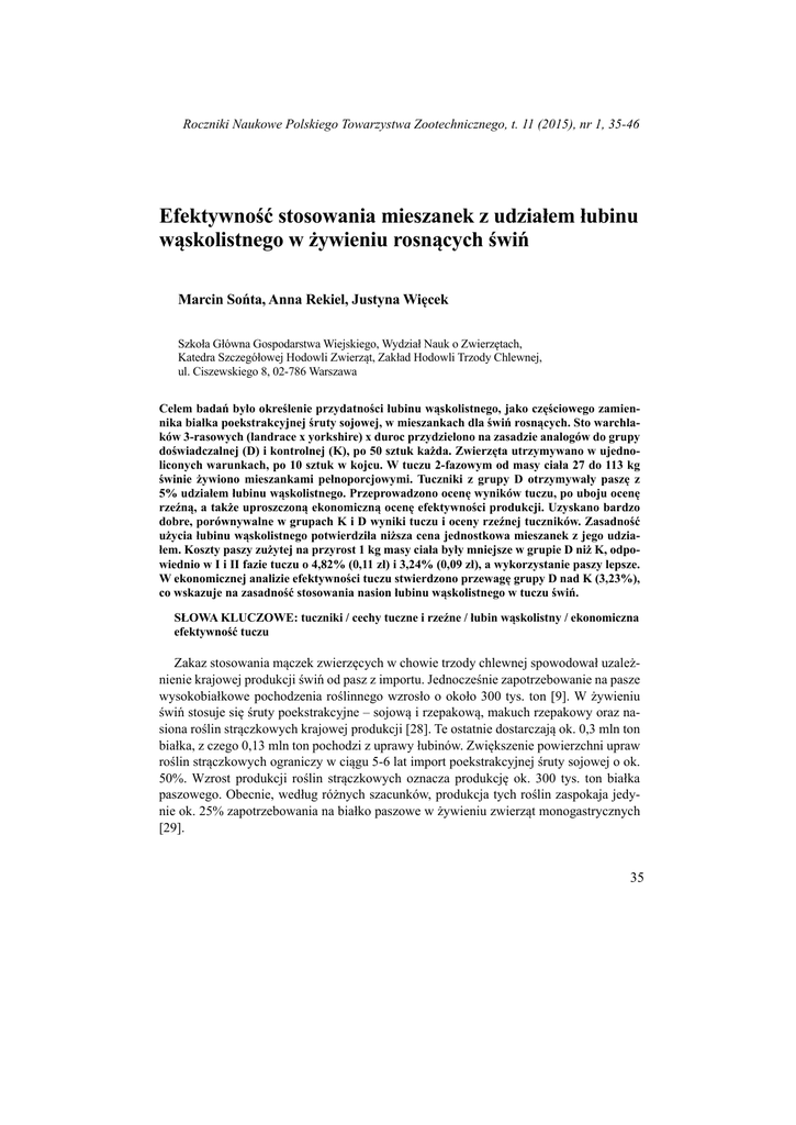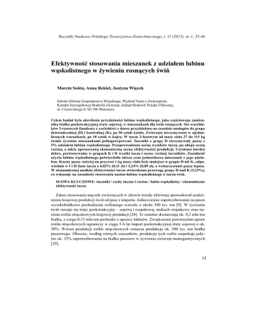 Roczniki Naukowe Polskiego Towarzystwa Zootechnicznego, t. 11 (2015), nr 1, 35-46 Efektywność stosowania mieszanek z udziałem łubinu wąskolistnego w żywieniu rosnących świń Marcin Sońta, Anna Rekiel, Justyna Więcek Szkoła Główna Gospodarstwa Wiejskiego, Wydział Nauk o Zwierzętach, Katedra Szczegółowej Hodowli Zwierząt, Zakład Hodowli Trzody Chlewnej, ul. Ciszewskiego 8, 02-786 Warszawa Celem badań było określenie przydatności łubinu wąskolistnego, jako częściowego zamiennika białka poekstrakcyjnej śruty sojowej, w mieszankach dla świń rosnących. Sto warchlaków 3-rasowych (landrace x yorkshire) x duroc przydzielono na zasadzie analogów do grupy doświadczalnej (D) i kontrolnej (K), po 50 sztuk każda. Zwierzęta utrzymywano w ujednoliconych warunkach, po 10 sztuk w kojcu. W tuczu 2-fazowym od masy ciała 27 do 113 kg świnie żywiono mieszankami pełnoporcjowymi. Tuczniki z grupy D otrzymywały paszę z 5% udziałem łubinu wąskolistnego. Przeprowadzono ocenę wyników tuczu, po uboju ocenę rzeźną, a także uproszczoną ekonomiczną ocenę efektywności produkcji. Uzyskano bardzo dobre, porównywalne w grupach K i D wyniki tuczu i oceny rzeźnej tuczników. Zasadność użycia łubinu wąskolistnego potwierdziła niższa cena jednostkowa mieszanek z jego udziałem. Koszty paszy zużytej na przyrost 1 kg masy ciała były mniejsze w grupie D niż K, odpowiednio w I i II fazie tuczu o 4,82% (0,11 zł) i 3,24% (0,09 zł), a wykorzystanie paszy lepsze. W ekonomicznej analizie efektywności tuczu stwierdzono przewagę grupy D nad K (3,23%), co wskazuje na zasadność stosowania nasion łubinu wąskolistnego w tuczu świń. SŁOWA KLUCZOWE: tuczniki / cechy tuczne i rzeźne / łubin wąskolistny / ekonomiczna efektywność tuczu Zakaz stosowania mączek zwierzęcych w chowie trzody chlewnej spowodował uzależnienie krajowej produkcji świń od pasz z importu. Jednocześnie zapotrzebowanie na pasze wysokobiałkowe pochodzenia roślinnego wzrosło o około 300 tys. ton [9]. W żywieniu świń stosuje się śruty poekstrakcyjne – sojową i rzepakową, makuch rzepakowy oraz nasiona roślin strączkowych krajowej produkcji [28]. Te ostatnie dostarczają ok. 0,3 mln ton białka, z czego 0,13 mln ton pochodzi z uprawy łubinów. Zwiększenie powierzchni upraw roślin strączkowych ograniczy w ciągu 5-6 lat import poekstrakcyjnej śruty sojowej o ok. 50%. Wzrost produkcji roślin strączkowych oznacza produkcję ok. 300 tys. ton białka paszowego. Obecnie, według różnych szacunków, produkcja tych roślin zaspokaja jedynie ok. 25% zapotrzebowania na białko paszowe w żywieniu zwierząt monogastrycznych [29]. 35 M. Sońta i wsp. W polskich warunkach uprawia się na paszę łubiny słodkie (biały, żółty, wąskolistny), groch i bobik. Nasiona łubinów, nawet tej samej odmiany lub pochodzące z upraw w różnych krajach oraz przed i po skiełkowaniu, różnią się między sobą zawartością substancji antyodżywczych, mają też odmienną wartość pokarmową i zawartość energii, co może różnicować strawność składników pokarmowych i ilość azotu wydalanego przez zwierzęta w kale i moczu. Zwartość białka w nasionach łubinów waha się od 29% do 52% w 1 kg suchej masy nasion [3, 5, 7, 11, 13, 25, 26]. Użycie łubinów w mieszankach treściwych sporządzanych w mieszalniach pasz jest ograniczone. Wynika to z braku regularnie dostarczanych dużych partii materiału. Każdorazowa dostawa wymaga oznaczania podstawowych parametrów, w tym zawartości białka. Zmienna, wahająca się każdego roku zawartość substancji antyżywieniowych utrudnia i ogranicza stosowanie łubinów w żywieniu zwierząt [19]. Zawarte w łubinach alkaloidy hamują przewodzenie w układzie nerwowym, powodują zmiany w układzie pokarmowo-trawiennym oraz w układzie krążenia. Głównym objawem działania alkaloidów jest u zwierząt zmniejszenie spożycia paszy [13]. Przeprowadzono wiele badań na zwierzętach modelowych (szczurach) i świniach, których celem było określenie wartości i przydatności nasion różnych gatunków i odmian łubinów w żywieniu zwierząt monogastrycznych [10, 14, 20, 22, 23, 25]. Wprowadzając nasiona łubinów do dawek uzyskiwano różne wyniki, ale najczęściej zachęcające do ich stosowania [2, 6, 18, 20, 27, 30, 31]. Kasprowicz-Potocka i Frankiewicz [12], podsumowując wyniki badań przeprowadzonych przez Nevel i wsp. (2000) oraz Hanczakowską i wsp. (2000), wskazują jednak na obniżone pobranie paszy oraz gorsze przyrosty świń żywionych paszą z udziałem łubinu lub łubinu z makuchem rzepakowym. King i wsp. [14] również podkreślają możliwość obniżenia wykorzystania paszy i depresję przyrostów u świń żywionych mieszankami z udziałem łubinu. Salgado i wsp. [22] sygnalizują pewne zmiany aktywności enzymów, struktury nabłonka jelit i masy narządów wewnętrznych u świń otrzymujących mieszanki zawierające nasiona łubinu. Hanczakowska i Księżak [7], analizując wyniki wielu eksperymentów podają, że 20% udział łubinu w dawce można uznać za bezpieczny. Rezultaty uzyskane przez Zraly i wsp. [30, 31] oraz Pisarikova i wsp. [18] wydają się to potwierdzać. Postęp hodowlany oraz wdrażanie nowych technologii przetwarzania nasion korzystnie zmieniły wartość i przydatność różnych gatunków i nowych odmian roślin. Zmieniły się też potrzeby i wymagania świń, w tym mieszańców nowoczesnych genotypów. Uwzględniając powyżej przedstawione fakty, jak też potrzebę stosowania alternatywnych, tańszych źródeł białka w żywieniu trzody chlewnej, podjęto badania, których celem było określenie przydatności nasion łubinu wąskolistnego w tuczu świń. Materiał i metody Doświadczenie przeprowadzono w okresie wiosenno-letnim 2013 roku, w prywatnym gospodarstwie produkcyjnym zlokalizowanym w województwie łódzkim. Materiał doświadczalny stanowiło 100 warchlaków, loszek i wiepr