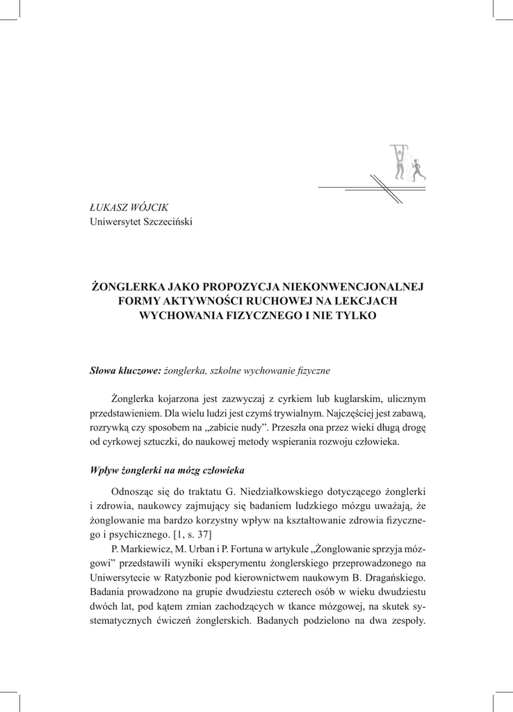 Łukasz Wójcik Uniwersytet Szczeciński Żonglerka jako propozycja niekonwencjonalnej formy aktywności ruchowej na lekcjach wychowania fizycznego i nie tylko Słowa kluczowe: żonglerka, szkolne wychowanie fizyczne Żonglerka kojarzona jest zazwyczaj z cyrkiem lub kuglarskim, ulicznym przedstawieniem. Dla wielu ludzi jest czymś trywialnym. Najczęściej jest zabawą, rozrywką czy sposobem na „zabicie nudy”. Przeszła ona przez wieki długą drogę od cyrkowej sztuczki, do naukowej metody wspierania rozwoju człowieka. Wpływ żonglerki na mózg człowieka Odnosząc się do traktatu G. Niedziałkowskiego dotyczącego żonglerki i zdrowia, naukowcy zajmujący się badaniem ludzkiego mózgu uważają, że żonglowanie ma bardzo korzystny wpływ na kształtowanie zdrowia fizycznego i psychicznego. [1, s. 37] P. Markiewicz, M. Urban i P. Fortuna w artykule „Żonglowanie sprzyja mózgowi” przedstawili wyniki eksperymentu żonglerskiego przeprowadzonego na Uniwersytecie w Ratyzbonie pod kierownictwem naukowym B. Dragańskiego. Badania prowadzono na grupie dwudziestu czterech osób w wieku dwudziestu dwóch lat, pod kątem zmian zachodzących w tkance mózgowej, na skutek systematycznych ćwiczeń żonglerskich. Badanych podzielono na dwa zespoły. 126 Łukasz Wójcik Członkowie jednego z nich przez trzy miesiące uczyli się żonglowania trzema piłeczkami, przez minimum 60 sekund. Obie grupy badano za osób praktykujących żonglowanie zauważono przyrost tkanki mózgowej w okolicach lewej, tylnej kory ciemieniowej oraz obustronny przyrost w rejonie środkowo–skroniowym. Obszary te odpowiadają za przetwarzanie i magazynowanie informacji o tym, jak człowiek zauważa i przewiduje ruch obiektów. [1, s. 37–38; 4] Wyniki eksperymentu udowodniły, że ludzki mózg może rozwijać się przez całe życie, natomiast żonglerka rozwija mózg podobnie jak ćwiczenia fizyczne rozwijają tkankę mięśniową. Badania pokazały jak w miarę systematycznego treningu rozwija się koordynacja ruchowa i koncentracja poprzez: „zmiany tzw. zaawansowanego przetwarzania percepcyjnego, czyli dostrzegania i przewidywania ruchu obiektów. Trzymiesięczny trening pobudził rozwój w tych okolicach mózgu, które są odpowiedzialne za opracowanie dokładnej mapy przestrzenno – ruchowej dla wykonywanego zadania” [1, s. 38]. Żonglowanie angażuje wiele obszarów mózgowia. Chcąc płynnie skoordynować ruch piłeczek w powietrzu, mózg musi najpierw zaplanować ułożenie rąk, pozycję głowy i ciała. Tworzenie planu działania i jago nadzorowanie zachodzi w korze przedczłonowej. Ułożony plan ruchów przekazywany jest do kory przedruchowej – obszaru odpowiedzialnego za łączenie wszystkich informacji potrzebnych do wykonania czynności. Utrzymanie trzech piłeczek w powietrzu to złożone sekwencje ruchowe, których budowaniem zajmuje się kora ruchowa. Kolejny proces zachodzi w korze motorycznej. Dzięki niej można popisać się sztuczką. Role pomocnicze odgrywają zwoje podstawy mózgu i móżdżek. Móżdżek pozwala utrzymać równowagę podczas żonglowania, programuje porządek ruchów i automatyzuje trudną i wymagającą wielu ćwiczeń czynność. Pień mózgu i rdzeń kręgowy odpowiadają za kontrolę pracy mięśni biorących udział w żonglowaniu i utrzymanie właściwej postawy [1, s. 38]. Nawiązując do G. Page’a narratora serii „The Brain” emitowanej w telewizji publicznej w USA w 1984 roku: „Tworzenie nowych ścieżek neuronowych w mózgu jest podstawą przyswajania nowych umiejętności motorycznych. Mózg musi przeprowadzić serię eksperymentów w poszukiwaniu najlepszego połączenia pomiędzy jedną komórką nerwową a drugą. Przy wykonywaniu złożonych czynności manualnych, w których ważną rolę odgrywają dwa układy wzroku oraz ruchu, muszą one odnaleźć najlepszą drogę komunikacji. Neurony, jeden za drugim, łączą się i tworzą coraz bardziej rozbudowaną sieć komunikacyjną. Pełna współpraca pomiędzy dwoma ośrodkami może zostać osiągnięta tylko drogą częstych powtórzeń danych czynności” Żonglerka jako propozycja niekonwencjonalnej formy aktywności ruchowej... 127 [1, s.39]. W tym przypadku powiedzenie „praktyka czyni mistrza” niewątpliwie sprawdza się. Nauka żonglerki uczy cierpliwości i wytrwałości w pracy. Wraz z rozwojem umiejętności żonglerskich oraz cech takich jak opanowanie, pewność siebie i równowaga, ruch piłeczek w powietrzu zdaje się zwalniać, co daje więcej czasu na kontrolę sytuacji. Przekłada się to również na umiejętność radzenia sobie ze stresującymi sytuacjami życiowymi, w których liczy się szybkość oraz pewność działań. [1, s. 39]. W języku angielskim słowo „żonglowanie” („juggling”) określa umiejętność radzenia sobie z wieloma sprawami w tym samym czasie. Podrzucanie kilku piłeczek jest doskonałą metaforą równoczesnej realizacji projektów i planów. „Tak, jak dołączanie każdej kolejnej piłeczki wymaga reorganizacji całej sekwencji ruchów, tak wprowadzenie nowych obowiązków zmusza do dokonania zmian w dotychczasowym planie codziennych zajęć. Jednoczenie w żonglerce, tak jak w życiu, aby móc dołożyć jeszcze jedną piłeczkę – obowiązek potrzeba harmonijnego zgrania całości” [2, s. 89]. Nauka żonglerki Poniższe zadania i rysunki przedstawiają kolejność kroków podejmowanych podczas nauki żonglerki. Zostały one opracowane przez autora niniejszego opracowanie, inicjatora lekcji żonglerskich w ZSO nr 3 i SP 55 w Szczecinie. Zadania przygotowane zostały na podstawie kursu nauki żonglerki realizowanego w Gimnazjum w Malechowie. Jego autorem jest pedagog Mirka Turczyn. [5]. Poniżej przedstawiono naukę podstaw żonglerki, na podstawie kaskady trzech piłek. Postawa żonglerska: ‑ rozkrok (stopy ustawione szerzej niż biodra), kolana lekko ugięte; ‑ plecy proste, klatka piersiowa. wypięta; ‑ łokcie ugię