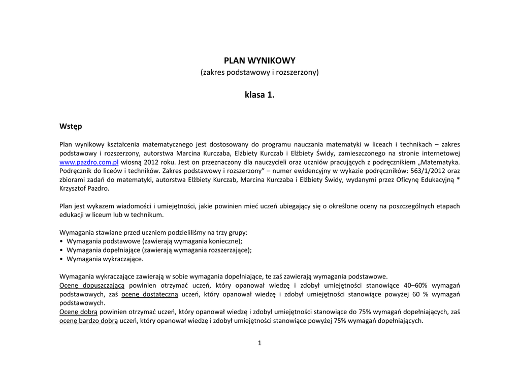 PLAN WYNIKOWY (zakres podstawowy i rozszerzony) klasa 1. Wstęp Plan wynikowy kształcenia matematycznego jest dostosowany do programu nauczania matematyki w liceach i technikach – zakres podstawowy i rozszerzony, autorstwa Marcina Kurczaba, Elżbiety Kurczab i Elżbiety Świdy, zamieszczonego na stronie internetowej www.pazdro.com.pl wiosną 2012 roku. Jest on przeznaczony dla nauczycieli oraz uczniów pracujących z podręcznikiem „Matematyka. Podręcznik do liceów i techników. Zakres podstawowy i rozszerzony” – numer ewidencyjny w wykazie podręczników: 563/1/2012 oraz zbiorami zadań do matematyki, autorstwa Elżbiety Kurczab, Marcina Kurczaba i Elżbiety Świdy, wydanymi przez Oficynę Edukacyjną * Krzysztof Pazdro. Plan jest wykazem wiadomości i umiejętności, jakie powinien mieć uczeń ubiegający się o określone oceny na poszczególnych etapach edukacji w liceum lub w technikum. Wymagania stawiane przed uczniem podzieliliśmy na trzy grupy: • Wymagania podstawowe (zawierają wymagania konieczne); • Wymagania dopełniające (zawierają wymagania rozszerzające); • Wymagania wykraczające. Wymagania wykraczające zawierają w sobie wymagania dopełniające, te zaś zawierają wymagania podstawowe. Ocenę dopuszczającą powinien otrzymać uczeń, który opanował wiedzę i zdobył umiejętności stanowiące 40–60% wymagań podstawowych, zaś ocenę dostateczną uczeń, który opanował wiedzę i zdobył umiejętności stanowiące powyżej 60 % wymagań podstawowych. Ocenę dobrą powinien otrzymać uczeń, który opanował wiedzę i zdobył umiejętności stanowiące do 75% wymagań dopełniających, zaś ocenę bardzo dobrą uczeń, który opanował wiedzę i zdobył umiejętności stanowiące powyżej 75% wymagań dopełniających. 1