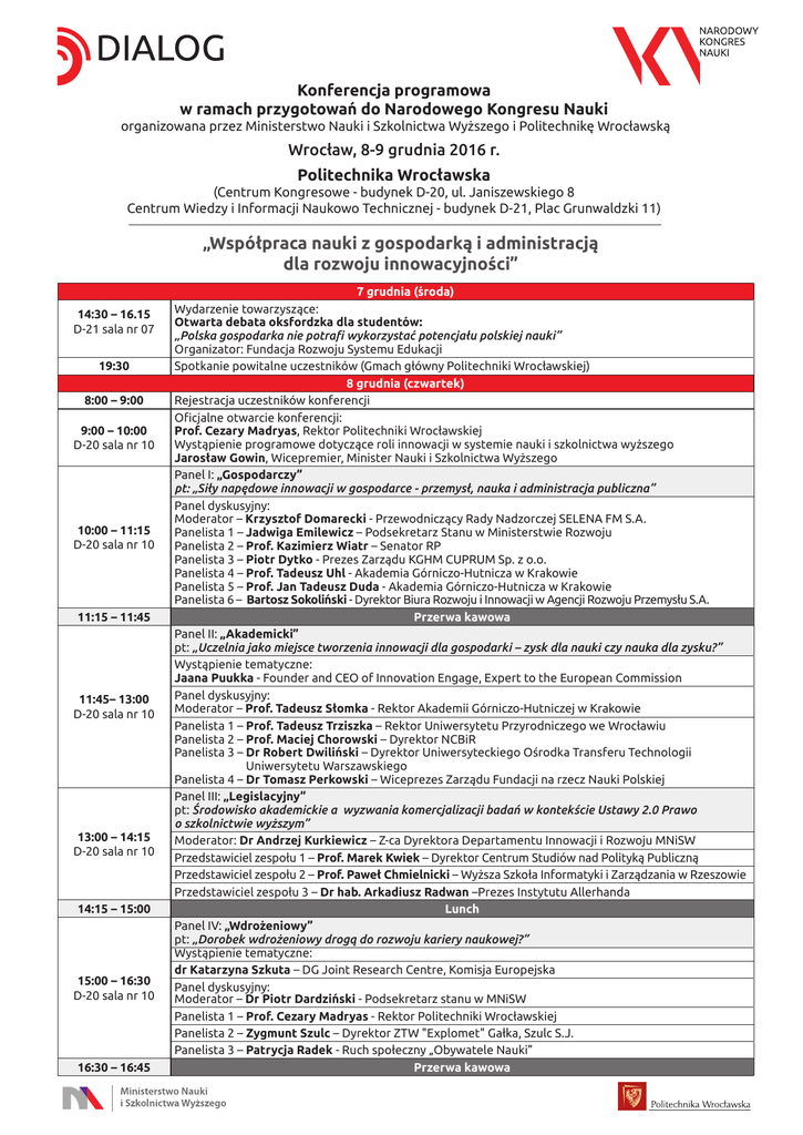 Konferencja programowa w ramach przygotowań do Narodowego Kongresu Nauki organizowana przez Ministerstwo Nauki i Szkolnictwa Wyższego i Politechnikę Wrocławską Wrocław, 8-9 grudnia 2016 r. Politechnika Wrocławska (Centrum Kongresowe - budynek D-20, ul. Janiszewskiego 8 Centrum Wiedzy i Informacji Naukowo Technicznej - budynek D-21, Plac Grunwaldzki 11) „Współpraca nauki z gospodarką i administracją dla rozwoju innowacyjności” 7 grudnia (środa) 14:30 – 16.15 D-21 sala nr 07 19:30 8:00 – 9:00 9:00 – 10:00 D-20 sala nr 10 10:00 – 11:15 D-20 sala nr 10 11:15 – 11:45 11:45– 13:00 D-20 sala nr 10 13:00 – 14:15 D-20 sala nr 10 14:15 – 15:00 15:00 – 16:30 D-20 sala nr 10 16:30 – 16:45 Wydarzenie towarzyszące: Otwarta debata oksfordzka dla studentów: „Polska gospodarka nie potrafi wykorzystać potencjału polskiej nauki” Organizator: Fundacja Rozwoju Systemu Edukacji Spotkanie powitalne uczestników (Gmach główny Politechniki Wrocławskiej) 8 grudnia (czwartek) Rejestracja uczestników konferencji Oficjalne otwarcie konferencji: Prof. Cezary Madryas, Rektor Politechniki Wrocławskiej Wystąpienie programowe dotyczące roli innowacji w systemie nauki i szkolnictwa wyższego Jarosław Gowin, Wicepremier, Minister Nauki i Szkolnictwa Wyższego Panel I: „Gospodarczy” pt: „Siły napędowe innowacji w gospodarce - przemysł, nauka i administracja publiczna” Panel dyskusyjny: Moderator – Krzysztof Domarecki - Przewodniczący Rady Nadzorczej SELENA FM S.A. Panelista 1 – Jadwiga Emilewicz – Podsekretarz Stanu w Ministerstwie Rozwoju Panelista 2 – Prof. Kazimierz Wiatr – Senator RP Panelista 3 – Piotr Dytko - Prezes Zarządu KGHM CUPRUM Sp. z o.o. Panelista 4 – Prof. Tadeusz Uhl - Akademia Górniczo-Hutnicza w Krakowie Panelista 5 – Prof. Jan Tadeusz Duda - Akademia Górniczo-Hutnicza w Krakowie Panelista 6 – Bartosz Sokoliński - Dyrektor Biura Rozwoju i Innowacji w Agencji Rozwoju Przemysłu S.A. Przerwa kawowa Panel II: „Akademicki” pt: „Uczelnia jako miejsce tworzenia innowacji dla gospodarki – zysk dla nauki czy nauka dla zysku?” Wystąpienie tematyczne: Jaana Puukka - Founder and CEO of Innovation Engage, Expert to the European Commission Panel dyskusyjny: Moderator – Prof. Tadeusz Słomka - Rektor Akademii Górniczo-Hutniczej w Krakowie Panelista 1 – Prof. Tadeusz Trziszka – Rektor Uniwersytetu Przyrodniczego we Wrocławiu Panelista 2 – Prof. Maciej Chorowski – Dyrektor NCBiR Panelista 3 – D r Robert Dwiliński – Dyrektor Uniwersyteckiego Ośrodka Transferu Technologii Uniwersytetu Warszawskiego Panelista 4 – Dr Tomasz Perkowski – Wiceprezes Zarządu Fundacji na rzecz Nauki Polskiej Panel III: „Legislacyjny” pt: Środowisko akademickie a wyzwania komercjalizacji badań w kontekście Ustawy 2.0 Prawo o szkolnictwie wyższym” Moderator: Dr Andrzej Kurkiewicz – Z-ca Dyrektora Departamentu Innowacji i Rozwoju MNiSW Przedstawiciel zespołu 1 – Prof. Marek Kwiek – Dyrektor Centrum Studiów nad Polityką Publiczną Przedstawiciel zespołu 2 – Prof. Paweł Chmielnicki – Wyższa Szkoła Informatyki i Zarządzania w Rzeszowie Przedstawiciel zespołu 3 – Dr hab. Arkadiusz Radwan –Prezes Instytutu Allerhanda Lunch Panel IV: „Wdrożeniowy” pt: „Dorobek wdrożeniowy drogą do rozwoju kariery naukowej?” Wystąpienie tematyczne: dr Katarzyna Szkuta – DG Joint Research Centre, Komisja Europejska Panel dyskusyjny: Moderator – Dr Piotr Dardziński - Podsekretarz stanu w MNiSW Panelista 1 – Prof. Cezary Madryas - Rektor Politechniki Wrocławskiej Panelista 2 – Zygmunt Szulc – Dyrektor ZTW "Explomet" Gałka, Szulc S.J. Panelista 3 – Patrycja Radek - Ruch społeczny „Obywatele Nauki” Przerwa kawowa 16:45 – 17:45 D-21 sala nr 07 D-20 sala nr 10AC D-20 sala nr 10B D-20 sala nr 10D 17:45 – 18:00 18:00 – 19:00 D-20 sala nr 10AC 19:00 9:30 – 10:00 D-20 sala nr 10 10:00 – 11:45 D-20 sala nr 10 11:45 – 12:00 12:00 – 13:30 D-20 sala nr 10 13:40 – 14:40 D-21 sala nr 07 D-20 sala nr 10AC D-20 sala nr 10B D-20 sala nr 10D 14:40 – 15:30 15:30 – 16:15 D-20 sala nr 10AC Seminaria – sesje równoległe: Seminaria polegają na aktywnej debacie ich uczestników prowadzonej przez moderatorów. Ich celem jest przede wszystkim zebranie koncepcji rozwiązań, które można będzie wykorzystać w procesie przygotowania zmian w prawie i polityce rozwoju nauki i szkolnictwa wyższego. „Prawne aspekty procesu komercjalizacji”; Moderator: Dr Bartosz Greczner – Radca prawny Uniwersytetu Przyrodniczego we Wrocławiu „Finansowanie procesu komercjalizacji badań naukowych przez instytucje niepubliczne”; Moderator: Zbigniew Hajłasz – Członek Rady Nadzorczej PKO BP SA „Realizacja POIR – zadania NCBiR”. Moderator: Prof. Maciej Chorowski – Dyrektor NCBiR „Instrumenty finansowe instytucji publicznych na rzecz komercjalizacji” Moderator: Dr Marek Dietl – Członek Zarządu i ekspert Instytutu Sobieskiego Przerwa Podsumowanie seminariów przez prowadzących Kolacja 9 grudnia (piątek) Narodowy Instytut Technologiczny - prezentacja koncepcji – Dr Piotr Dardziński - Podsekretarz stanu w MNiSW Panel V: „Instytutowy” pt: “Instytuty badawcze jako pole współpracy nauki i przemysłu w zakresie tworzenia i wdrażania innowacji” Wystąpienie tematyczne: Jaana Puukka - Founder and CEO of Innovation Engage, Expert to the European Commission Panel dyskusyjny: Moderator – Krzysztof Gulda – Członek Zarządu UWRC Sp. z o.o. Panelista 1 – Prof. Leszek Rafalski – Przewodniczący Rady Głównej Instytutów Badawczych Panelista 2 – Dr Tomasz Kośmider – Prezes Technology Partners Panelista 3 – Wojciech Rośkiewicz – Instytut Fraunhofera Panelista 4 – Dr hab. inż. Antoni Świątek – Prezes BOSMAL Sp. z o.o. Przerwa kawowa Panel VI: „Samorządowy” pt: „Trójkąt Innowacji Nauka- Samorząd- Biznes” Wystąpienie tematyczne: Prof. Evangelos Eleftherio