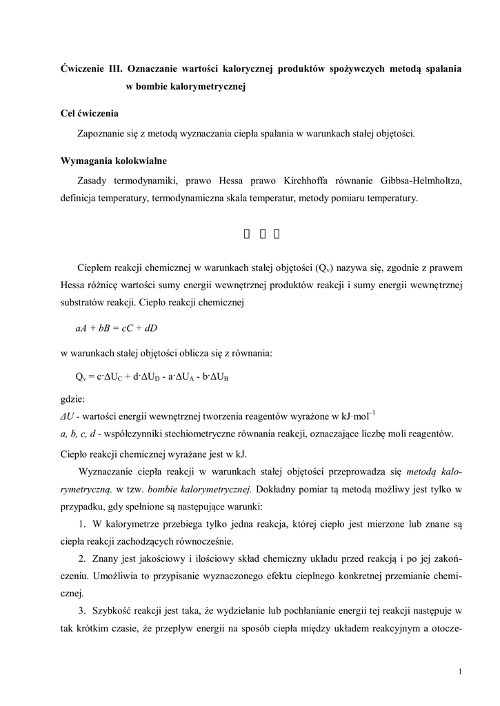 Ćwiczenie III. Oznaczanie wartości kalorycznej produktów spożywczych metodą spalania w bombie kalorymetrycznej Cel ćwiczenia Zapoznanie się z metodą wyznaczania ciepła spalania w warunkach stałej objętości. Wymagania kolokwialne Zasady termodynamiki, prawo Hessa prawo Kirchhoffa równanie Gibbsa-Helmholtza, definicja temperatury, termodynamiczna skala temperatur, metody pomiaru temperatury. Ciepłem reakcji chemicznej w warunkach stałej objętości (Q v) nazywa się, zgodnie z prawem Hessa różnicę wartości sumy energii wewnętrznej produktów reakcji i sumy energii wewnętrznej substratów reakcji. Ciepło reakcji chemicznej aA + bB = cC + dD w warunkach stałej objętości oblicza się z równania: Qv = c·ΔUC + d·ΔUD - a·ΔUA - b·ΔUB gdzie: ΔU - wartości energii wewnętrznej tworzenia reagentów wyrażone w kJ·mol–1 a, b, c, d - współczynniki stechiometryczne równania reakcji, oznaczające liczbę moli reagentów. Ciepło reakcji chemicznej wyrażane jest w kJ. Wyznaczanie ciepła reakcji w warunkach stałej objętości przeprowadza się metodą kalorymetryczną, w tzw. bombie kalorymetrycznej. Dokładny pomiar tą metodą możliwy jest tylko w przypadku, gdy spełnione są następujące warunki: 1. W kalorymetrze przebiega tylko jedna reakcja, której ciepło jest mierzone lub znane są ciepła reakcji zachodzących równocześnie. 2. Znany jest jakościowy i ilościowy skład chemiczny układu przed reakcją i po jej zakończeniu. Umożliwia to przypisanie wyznaczonego efektu cieplnego konkretnej przemianie chemicznej. 3. Szybkość reakcji jest taka, że wydzielanie lub pochłanianie energii tej reakcji następuje w tak krótkim czasie, że przepływ energii na sposób ciepła między układem reakcyjnym a otocze- 1 niem podczas pomiaru (tzw. efekt promieniowania) jest, co najmniej o rząd wielkości mniejszy od wyznaczonego ciepła reakcji. Pomiaru efektu cieplnego dokonuje się w przyrządzie zwanym kalorymetrem (rys. 1). Składa się on z dwóch części: A – naczynia kalorymetrycznego, którego temperatura zmienia się w wyniku przebiegu badanej reakcji chemicznej, B – termostatu wodnego z: 1 – bombą kolorymetryczną, 2 – termometrem, 3 – mieszadłem. Rysunek 1. Kalorymetr Wyznaczanie ciepła spalania w kalorymetrze przeprowadza się tzw. metodą diatermiczną. Między naczyniem kalorymetrycznym a termostatem zachodzi wymiana ciepła. Wymianę tę uwzględnia się w obliczeniach w postaci tzw. poprawki na przekazywanie ciepła (∑v), które dokonywane jest poprzez: promieniowanie, przewodzenie i konwekcję. Ciepło reakcji chemicznej w warunkach stałej objętości (Qv) oblicza się ze wzoru: Qv = K·(T2–T1+∑v) (1), gdzie: T1 i T2 - temperatury na początku i na końcu głównego okresu pomiaru, K - stała kalorymetru. Spalanie substancji w bombie kalorymetrycznej jest przemianą izochoryczną,, w której układ nie wykonuje pracy objętościowej. Ciepło tej przemiany jest równe zmianie energii wewnętrznej układu. Qv=ΔU (2) Ponieważ energia wewnętrzna układu jest funkcją temperatury, więc pomiar ciepła przemiany izochorycznej polega na dokładnym oznaczeniu przyrostu temperatury (ΔT). Każdy pomiar kalorymetryczny można podzielić na trzy przedziały czasowe (rys. 2). Przedział pierwszy, który nazywa się wstępnym, zaczyna się w chwili, gdy rozpoczyna się obserwację temperatury w kalorymetrze i kończy w chwili zainicjowania badanej przemiany. W tej 2 samej chwili zaczyna się przedział drugi, nazywany głównym. Przedział ten kończy się w chwili, gdy temperatura w kalorymetrze osiągnie maksymalną wartość. Dalej zaczyna się przedział trzeci, zwany końcowym. Przedział końcowy trwa przez cały czas odczytywania temperatury po osiągnięciu przez nią wartości maksymalnej. Rysunek 2. Krzywa zmian temperatury w kalorymetrze Gdyby układ był idealnie izolowany cieplnie, to temperatury w przedziale wstępnym i końcowym miałyby wartości stałe. Całkowity wzrost temperatury układu byłby wówczas równy różnicy tych dwóch temperatur: T2 – T1 W rzeczywistości temperatura układu podczas pomiaru zmienia się nieznacznie w przedziale pierwszym i znaczniej w przedziale końcowym. Dzieje się tak, dlatego że zarówno przed inicjacją, jak i po inicjacji procesu spalania następuje wymiana energii na sposób ciepła między układem a otoczeniem. Wskutek tego maksymalna, zmierzona w kalorymetrze temperatura jest niższa od temperatury, jaką osiągnąłby układ, gdyby wyrównanie temperatury nastąpiło w nieskończenie krótkim czasie. Aby wyeliminować błąd powstały wskutek wymiany ciepła z otoczeniem, wykreśla się tzw. krzywą idealnego wyrównania temperatury (rys. 3). Rysunek 3. Krzywa idealnego wyrównywania temperatury W tym celu mierzy się, co l minutę temperaturę w kalorymetrze przez 10 minut przed inicjacją i przez około 30 minut po inicjacji. Z krzywej tej - metodą ekstrapolacji - określa się różnicę tem3 peratur układu kalorymetrycznego w okresie wstępnym i końcowym tak, jakby układ był idealnie izolowany termicznie. Punkt B krzywej ABCD na rysunku 3 odpowiada chwili inicjacji procesu spalania. Przedłuża się odcinki prostoliniowe (na lewo od punktu C i na prawo od punktu B). Przedłużenia te łączy się prostą EF, prostopadłą do osi czasu. Prostą EF wykreśla się w ten sposób, aby powierzchnie między przedłużonymi krzywymi I i II CEG i BFG były równe. Punkty F i E odnoszą się odpowiednio do temperatury początkowej T3 i temperatury końcowej T4, odpowiadającym pomiarom w układzie idealnie izolowanym. Określone w ten sposób temperatury T 3 i T4 wyznaczają poprawkę na przekazywanie ciepła ∑v, gdzie: ∑v=T3–T4–(T2–T1) (3) Z równań (2) i (3) otrzymuje się: Qv=K·(T4–T3) (4) Stałą kalorymetru (K) oblicza się można z zależności: K=∑mi·ci, (5) gdzie: mi - masa i-tej części układu kalorymetrycznego, ci - ciepło właściwe i